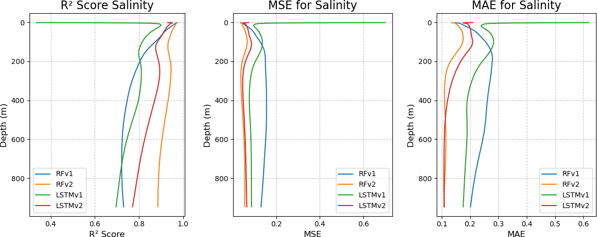 Figures 6 and 7 show the same metrics as in Table 5 but as a function of the depth of the measurement. Salinity models display a robust prediction between depths, as the slope of the functions/metrics with respect to depth is almost vertical. There, we can observe that RFRv2 provides a higher R2 and smaller errors than the rest of the models, closely followed by the LSTMv2 approach. In the case of temperature, we can see that metrics decline at about 200 m depth, where the predictions start to fail and errors grow larger. In salinity, we can also observe the slope change to a lesser extent, but the scores remain stable in the lower depths. Reconstructing the temperature field proves more challenging and requires further work to achieve the quality of the salinity reconstruction. In Appendix A, we provide the complete validation of the temperature, but due to its lower quality when compared to the salinity reconstruction, we decided to focus on the validation of the salinity from now on.