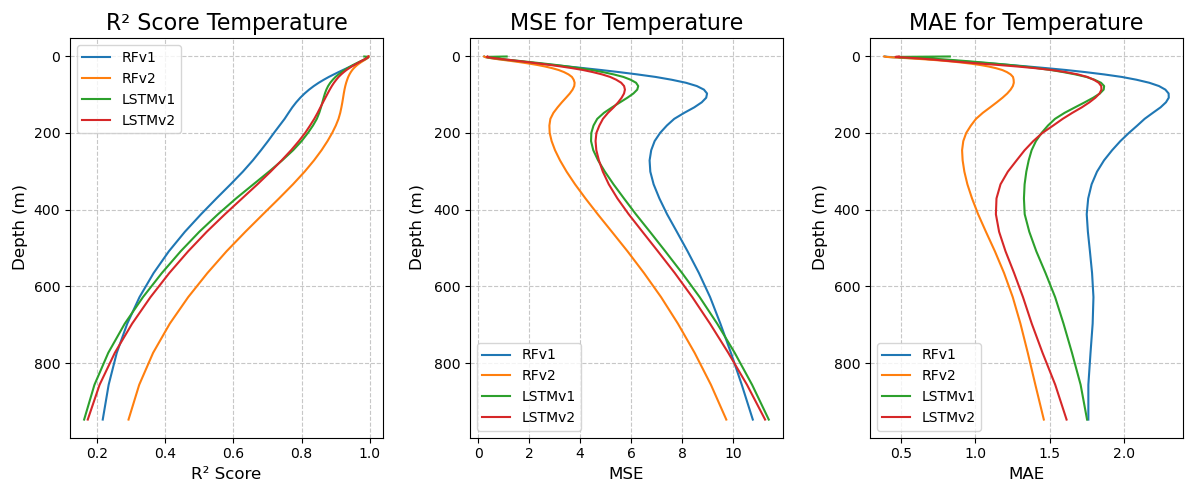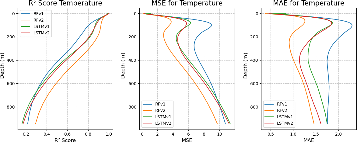 Figure 7Predicted temperature R2, mean squared error, and mean absolute error (from left to right) per depth for the different models: RFRv1 (blue), RFRv2 (orange), LSTMv1 (green), LSTMv2 (red).