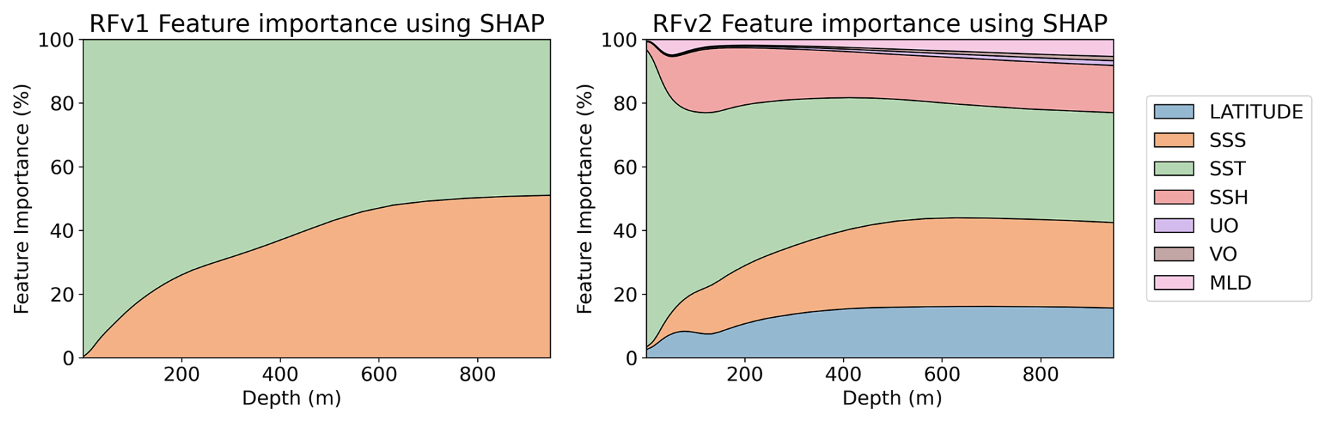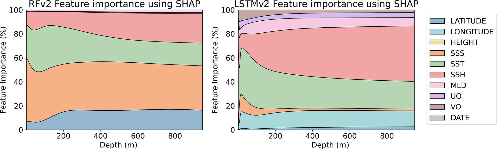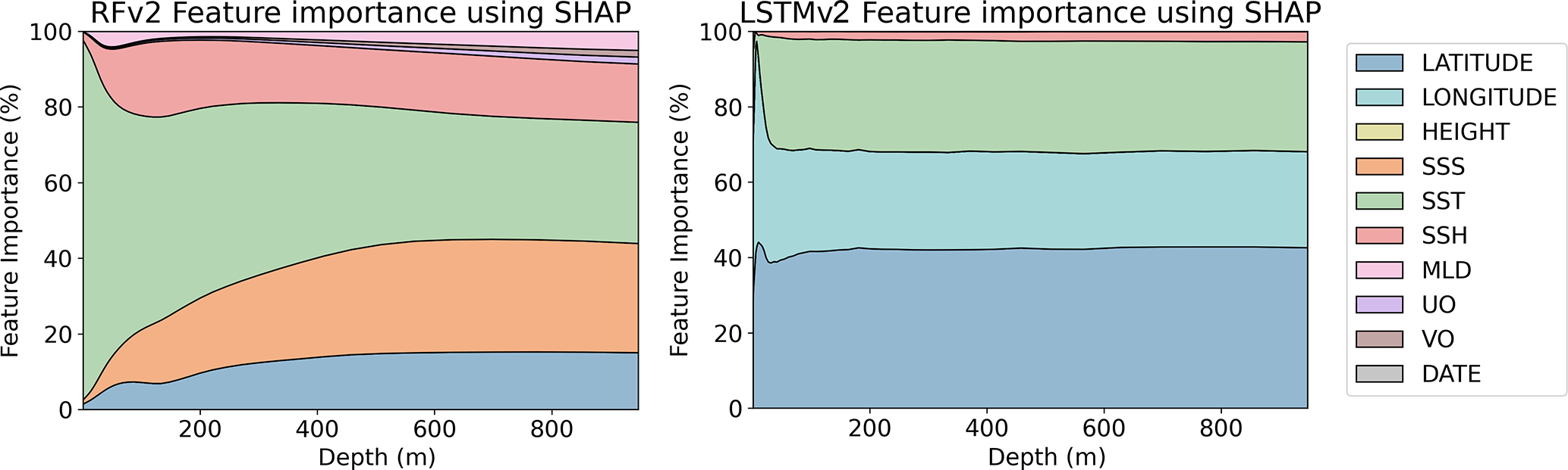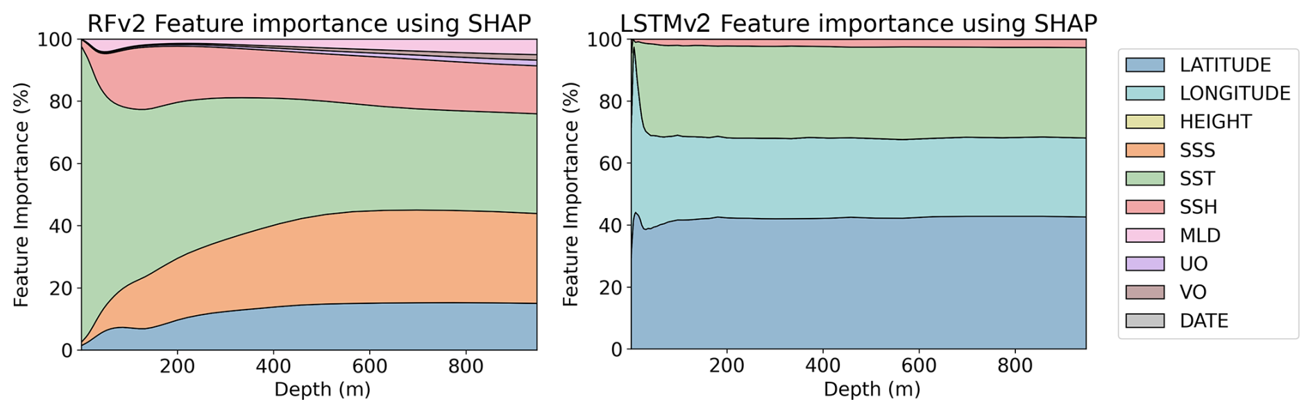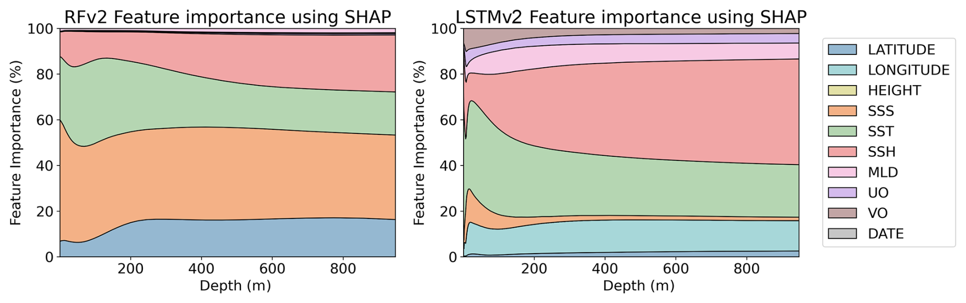 The resilience to noise varies among model architectures. This can result in some variables not being used if the model is not able to extract information from them. In order to reflect how the uncertainties affect the information the models can extract for each variable, we computed SHAP values with and without uncertainties. In order to see how the contribution of each variable changes in the vertical profile, SHAP values are computed for each depth of the predictions. Figure 8 shows the percentage of each variable contribution for the RFRv2 and LSTMv2 models, when uncertainties were not accounted for in the training data. We only show these two models because they are the most complex and should be the “ideal case”. For the RFR (Fig. 9), we observe that the SSS is the dominant predictor, which provides a climatological reference. Then, variables like SST, latitude, and SSH contribute by capturing temporal and regional variations in the signal. The LSTM model (Fig. 10), however, shows a different learning strategy as it does not rely on SSS. Instead, it derives from other variables such as longitude and temperature. The latitude variable is also mostly accounted for in the inherent temperature's latitudinal structure. This approach captures both the climatological baseline and dynamic components without depending directly on SSS measurements.
