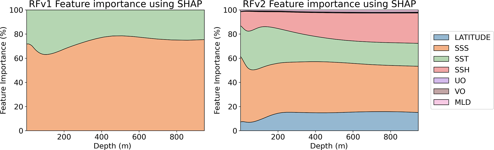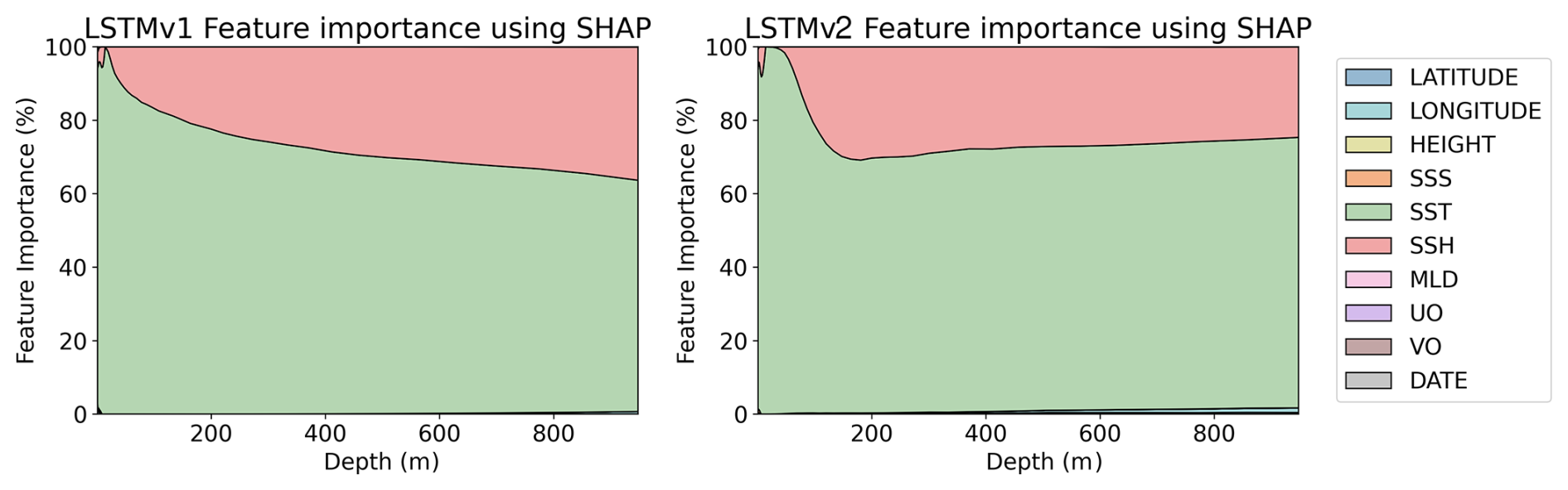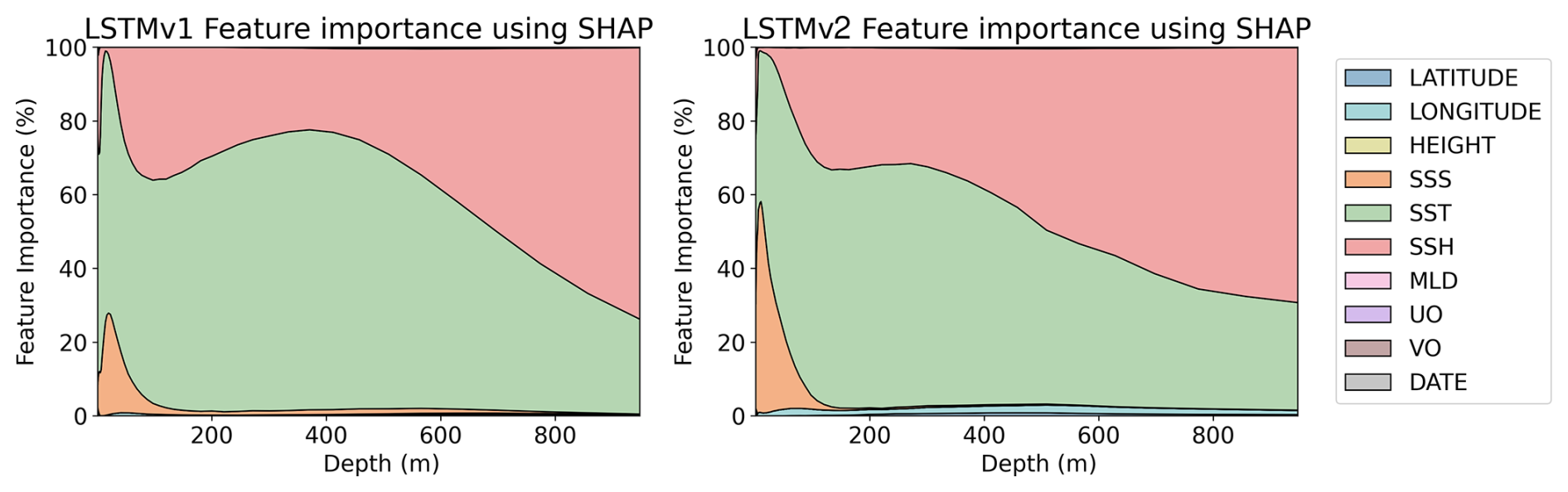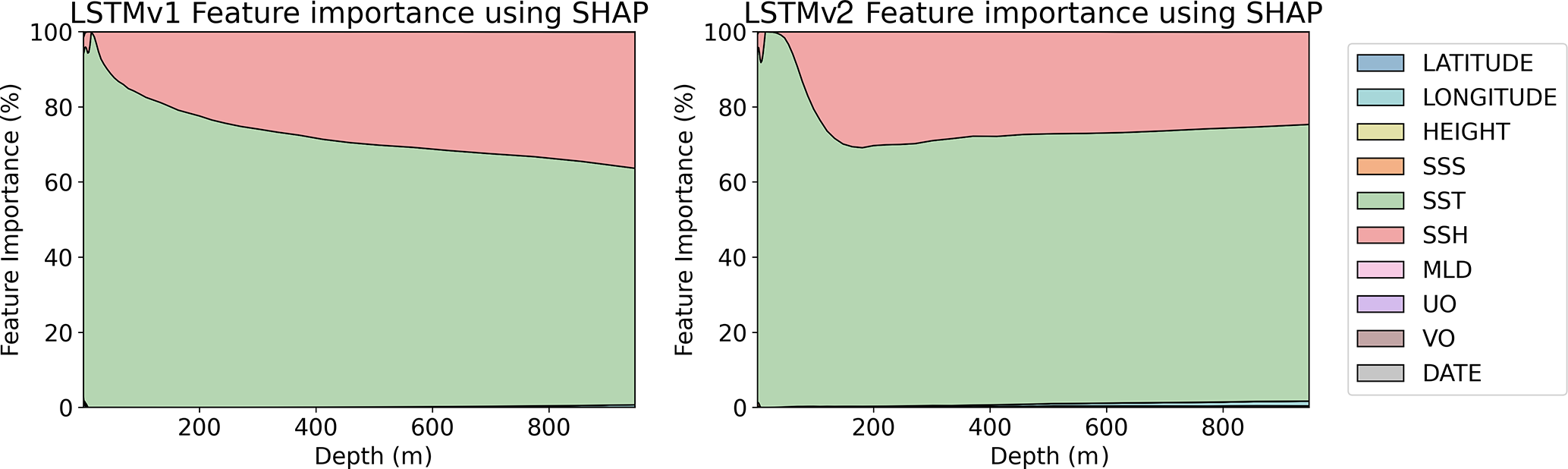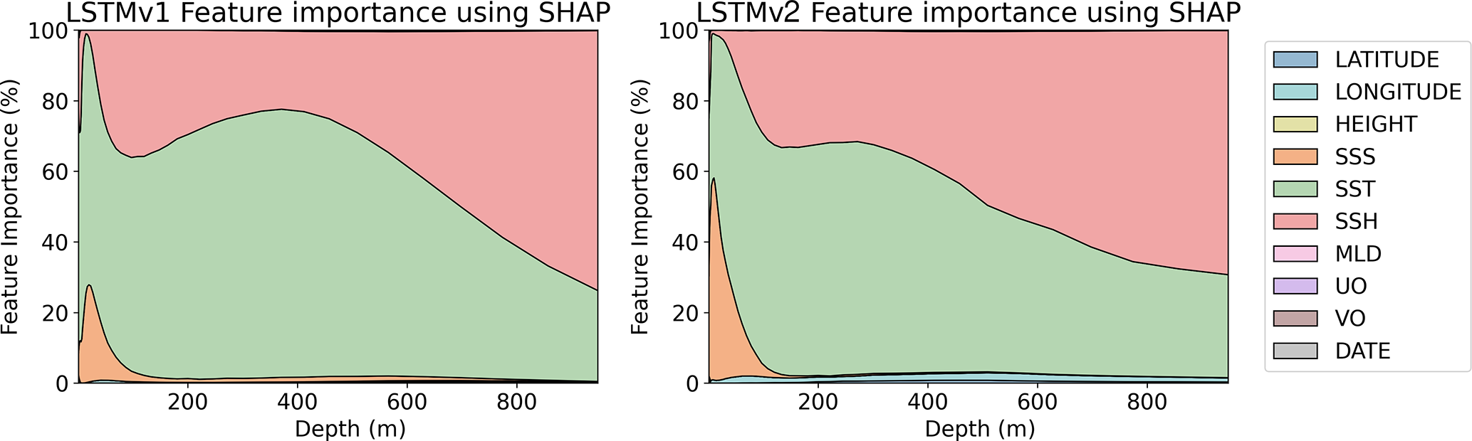 We compare how the variable selection and importance change when uncertainty is included in the training data. SHAP results for the RFR models (with uncertainties) are shown in Fig. 9. Both RFRv1 and RFRv2 use the SSS as the primary predictor variable, followed by the SST. We do not observe remarkable differences when compared to the results obtained without accounting for the uncertainties (Fig. 8). This is because the RFR is an ensemble model that has high tolerance to noise. The SHAP values for the salinity LSTM model are shown in Fig. 10. We observe a similar pattern in the SSS, SST predictors. Both variables have more impact in the first 100 m. After that, their weight decreases (substituted by SSH) and becomes stable. Unlike in Fig. 8, the LSTM models are not able to extract information from the MLD and the currents. The latitude variable is also mostly erased from the prediction. This can be due to the spatial roughness induced by the randomness of the uncertainties, as the model faces problems when searching for a smooth relationship with spatial patterns.