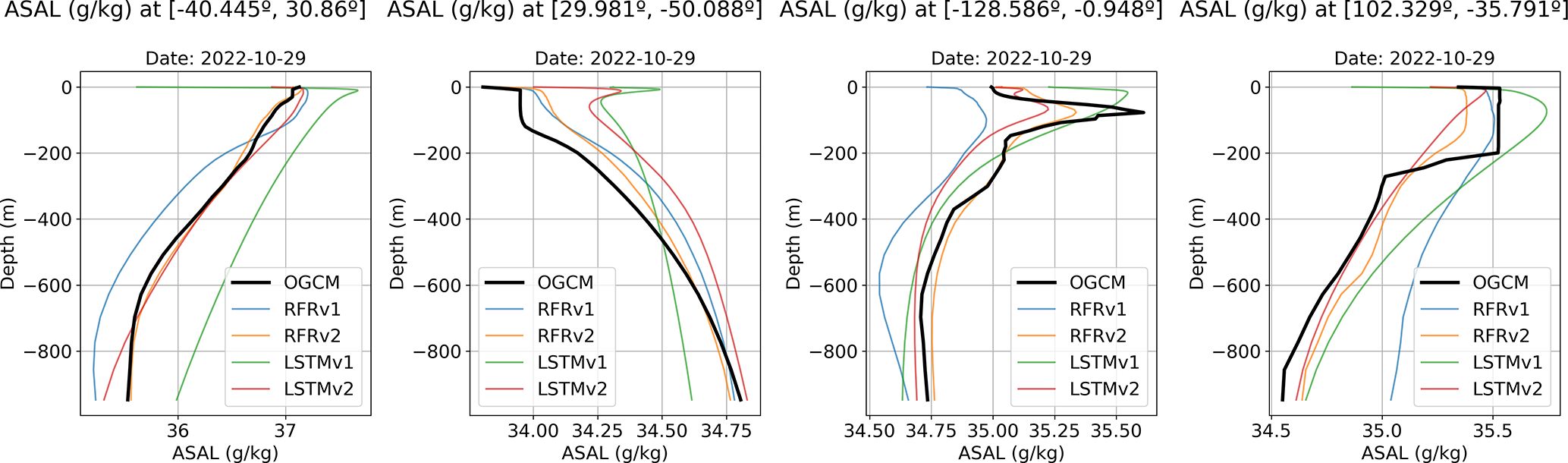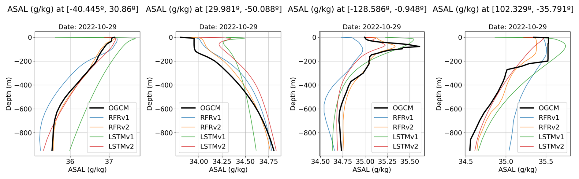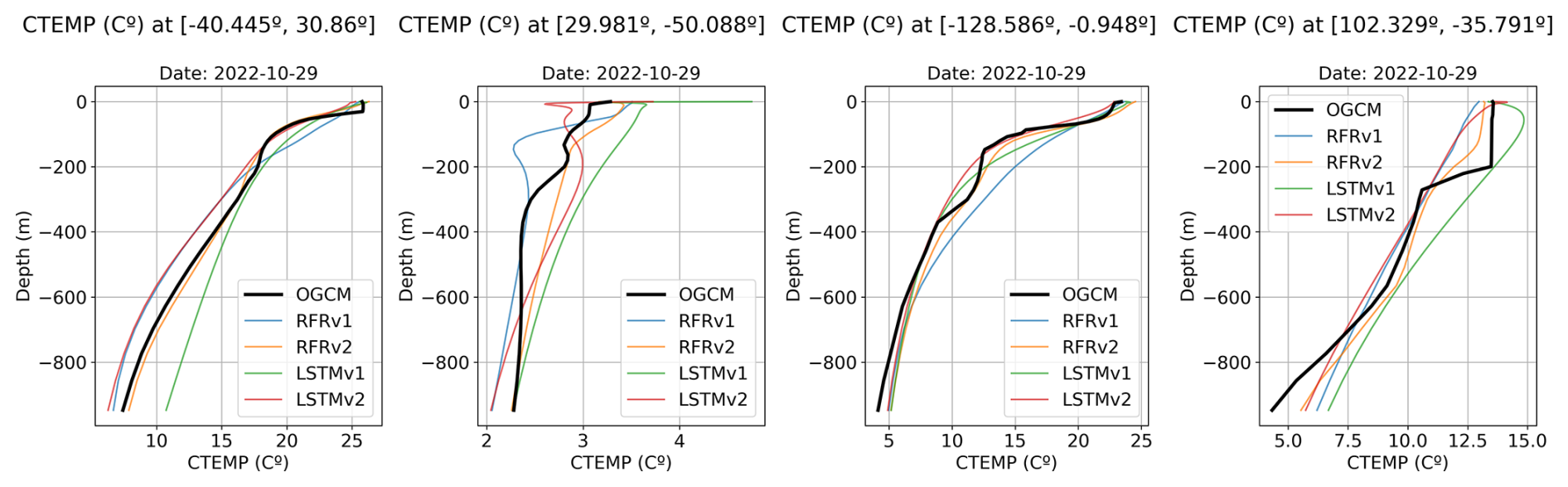 To gain insights into the vertical reconstruction, we show in Fig. 12 the reconstructed vertical profiles of the points shown in Fig. 11 for the 29 October 2022, compared to the ground truth. We can observe a better fit in the case of the RFRv2 and LSTMv2 as they present a good correspondence with the ground truth curve. The models present some difficulties when predicting sharp transitions, as seen in the third and fourth points, as they tend to smooth the vertical profile. Sharp transitions, however, can be due to the quality of the numerical model or a well-mixed layer that produces abrupt changes. Further studies should be conducted in these difficult regions when using real in-situ data, and this metric should be revisited.