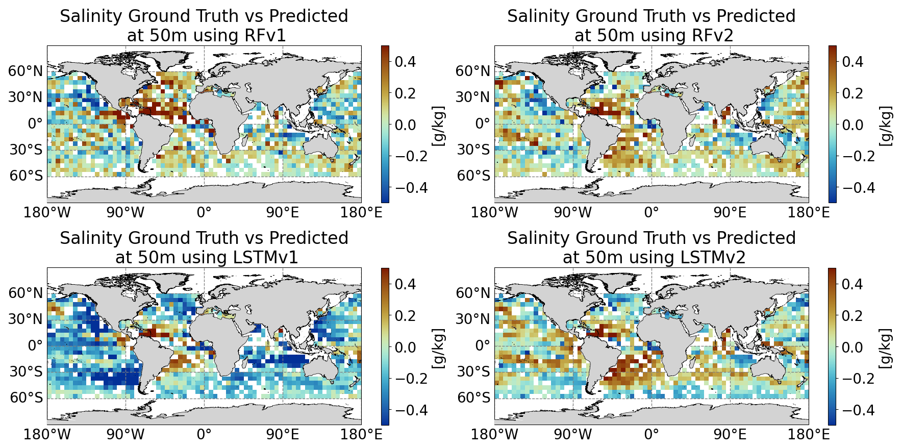Figure 15Biases at different depths (from left to right: 5, 50, and 500 m) between predicted salinity and ground truth for the two proposed models, RFRv2 (top row), LSTMv2 (bottom row).