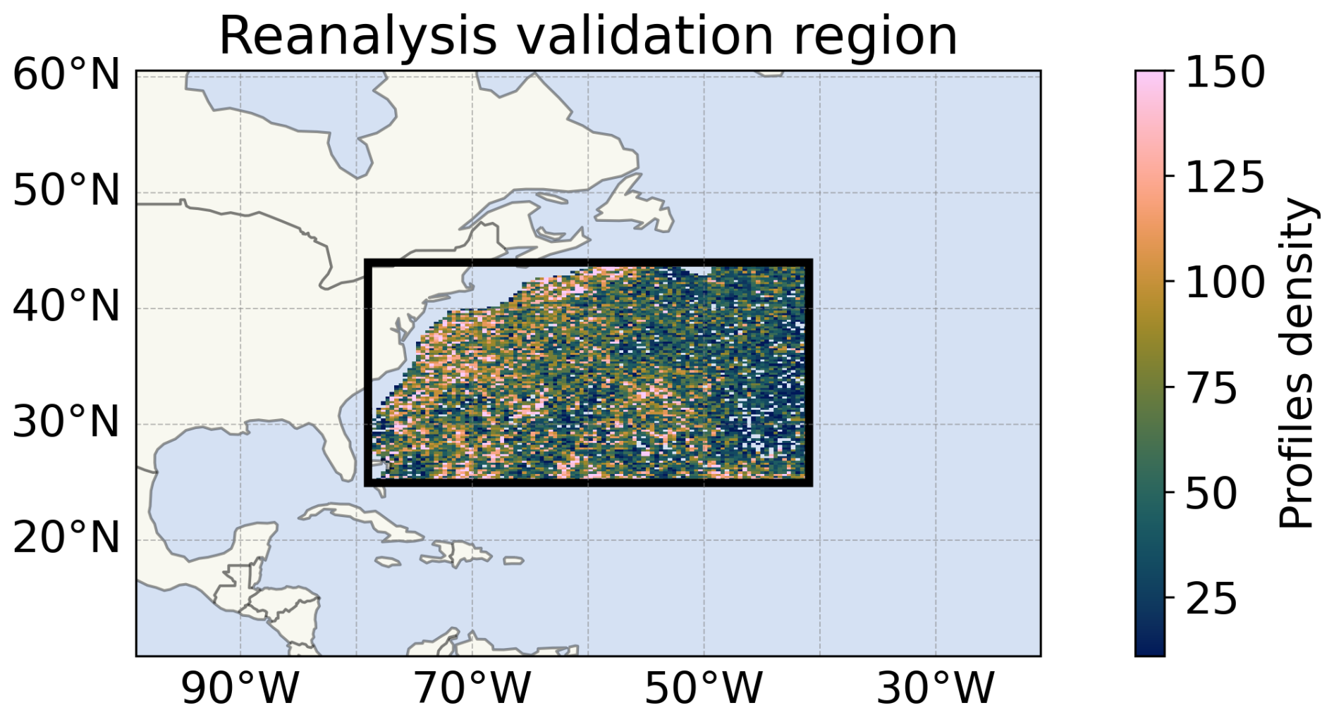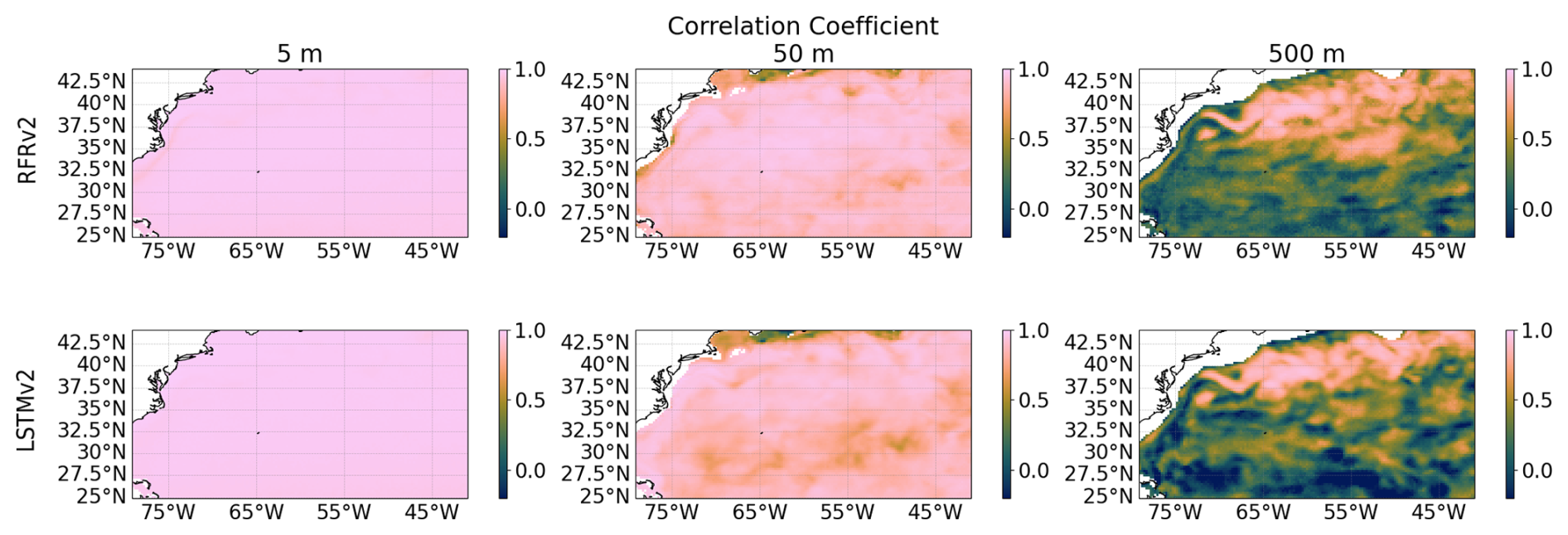 We chose the region with longitudes ranging between 80 and 40° W and latitudes ranging between 25 and 44° N as it is a highly dynamic area that comprises the Gulf Stream current (see Fig. 2). Notice how the region's sampling is non-homogeneous and focuses on more dynamical regions, i.e., where the Gulf Stream is located. The validation is conducted with the predictions of both RFRv2 and LSTMv2 for the 2008–2009 time period, as it does not overlap with the training dataset. Three different levels of depths are considered to give an insight into the column variability: 5, 50, and 500 m depths.