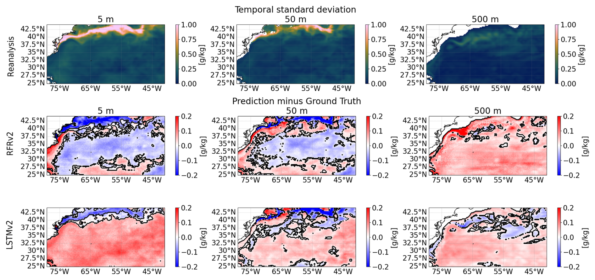 Figure 16Temporal variability assessment between the predictions and the ground truth (reanalysis) salinities at different depths (from left to right: 5, 50, and 500 m). The standard deviation of the reanalysis (taken as our ground truth) for the 2008–2009 period (first row). Differences between the standard deviation of the ground truth and each model, RFRv2 (second row), and LSTMv2 (third row). Solid lines delimit statistically significant areas at a 95 % confidence level using an F-test for the difference of variances.