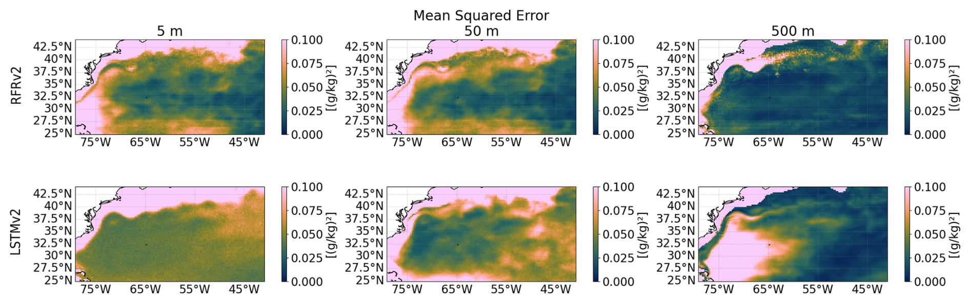 Figure 17Mean Squared Error at different depths (from left to right: 5, 50, and 500 m) between predicted salinity and ground truth for the two proposed models, RFRv2 (top row), LSTMv2 (bottom row).