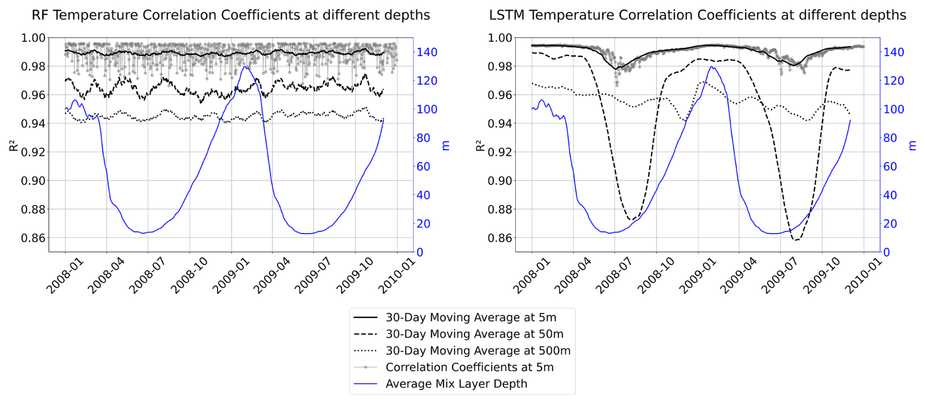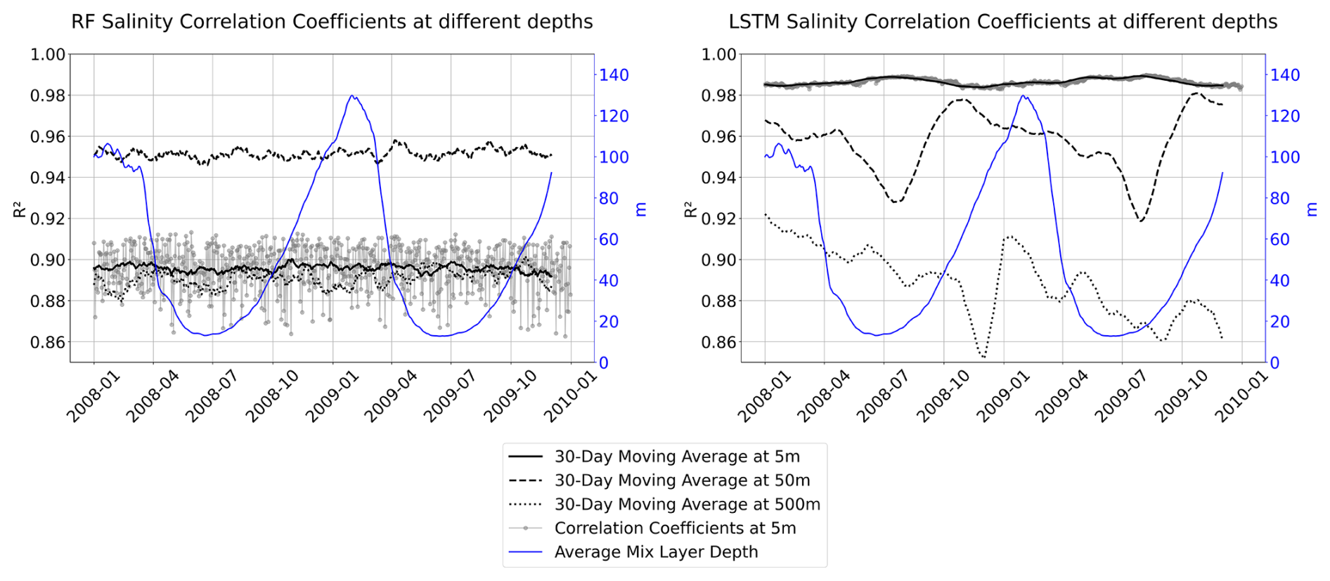 Finally, we compute the temporal series of the spatial correlation coefficient to understand if there is any temporal or seasonality variation in the performance of our models. For each studied depth, the time series is smoothed using a 30 d moving average. We can observe in Fig. 19 that both models present a good correlation at all studied depths, with an R2 score higher than 0.85. In the case of the RFR, we do not observe any tendency in the data or seasonal biases, meaning that our model can capture both possible tendencies and seasonal variability of the reconstructed variable. In the case of the LSTM, we observe some peaks of lower correlation that match the months in which the MLD is shallower, for this region during July. This result is consistent with the reconstruction of interior ocean variables using dynamical approaches. Within the framework of Surface Quasi-Geostrophy (SQG), it is possible to infer subsurface density and velocity anomalies from surface buoyancy fields, under the assumption that these anomalies originate at the surface and decay exponentially with depth (Held et al., 1995). The depth of the mixed layer (MLD) plays a critical role in modulating the penetration of surface-driven anomalies into the ocean interior. Studies by Isern-Fontanet et al. (2008) and Miracca-Lage et al. (2022) demonstrated that SQG-based reconstructions can effectively capture subsurface structures – such as eddies and fronts – using only surface observations, especially when the MLD is deep and the surface stratification is weak. Conversely, when the MLD shoals, the surface signal becomes less representative of interior dynamics, highlighting the importance of accounting for MLD variability in data-driven ocean diagnostics and reconstruction methods.