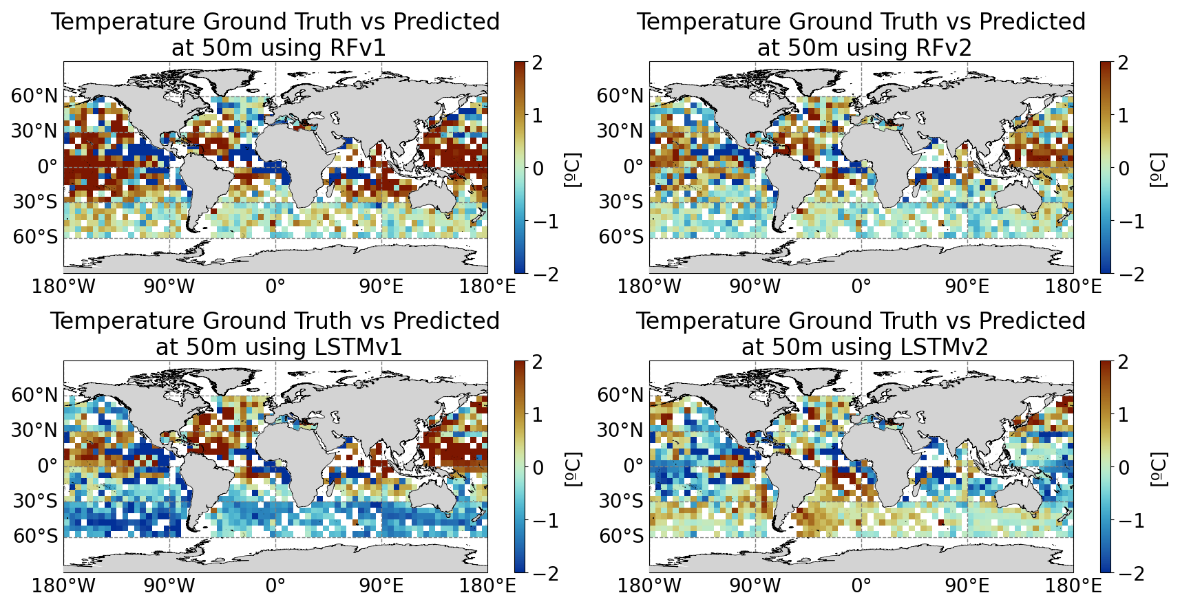 Figure A5Predicted temperature minus Ground Truth (50 m depth) at a 5°×5° grid for (from top to bottom and left to right): RFv1, RFv2, LSTMv1, LSTMv2. The date is 29 October 2022.