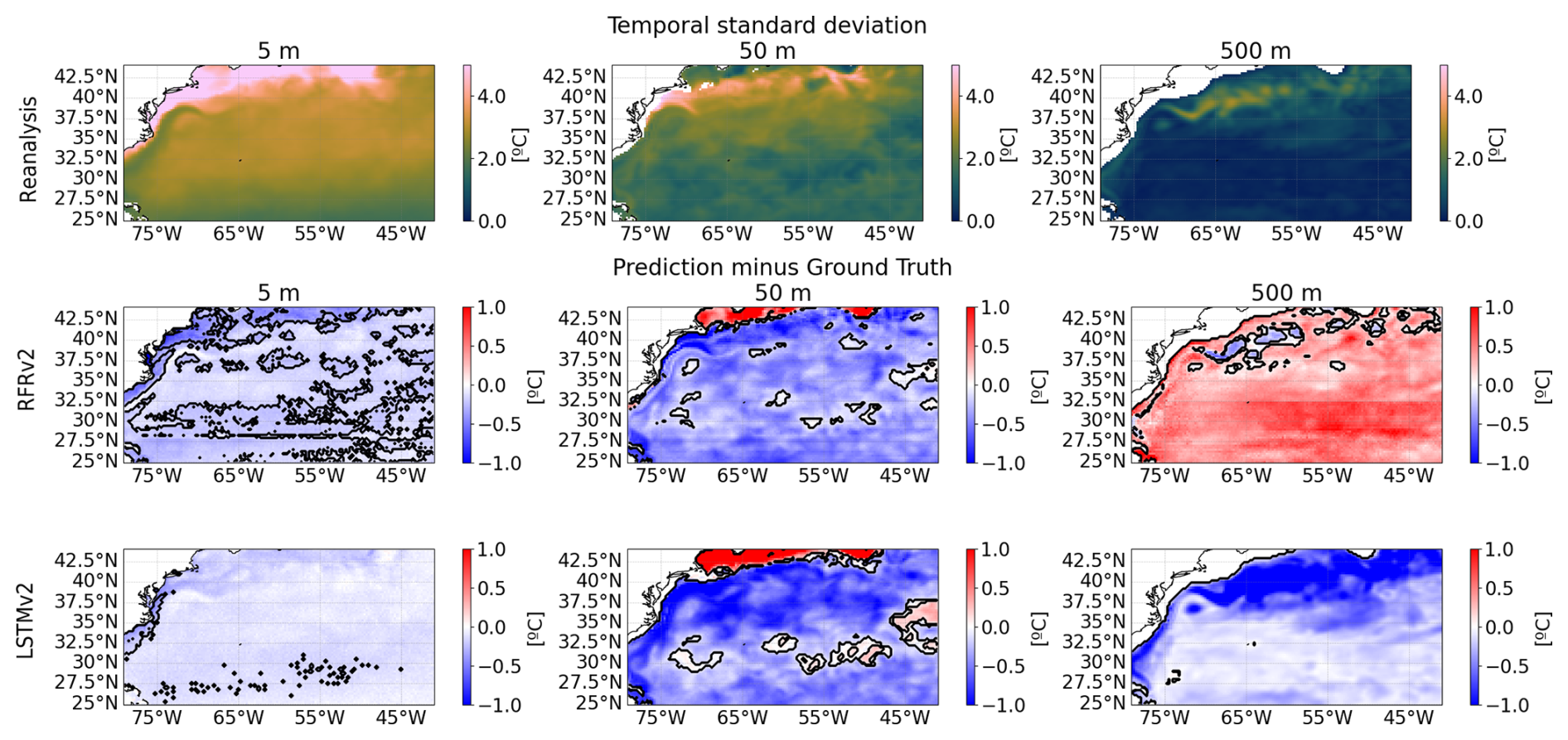 Figure A7Variability assessment between the predictions and the ground truth (reanalysis) temperatures at different depths (from left to right: 5, 50, and 500 m). The standard deviation of the reanalysis for the 2008–2009 period (first row). Differences between the standard deviation of the ground truth and each model, RFRv2 (second row), and LSTMv2 (third row). Solid black lines delimit statistically significant areas at a 95 % confidence level assessed using an F-test for the difference of variances.