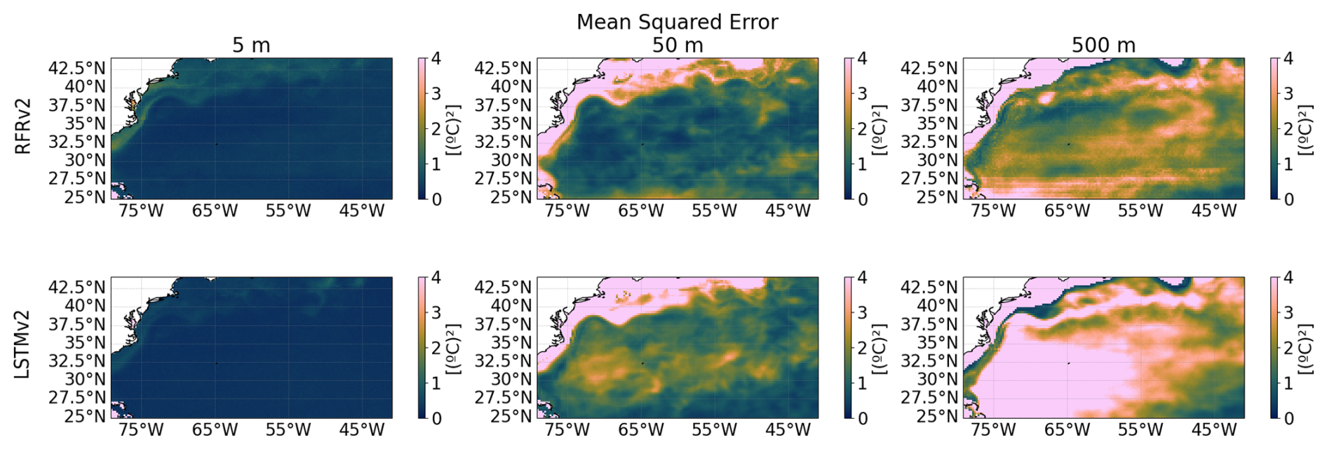 Figure A8Mean Squared Error at different depths (from left to right: 5, 50, and 500 m) between ground truth and predicted temperature for the two proposed models RFRv2 (top row), LSTMv2 (bottom row).