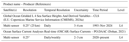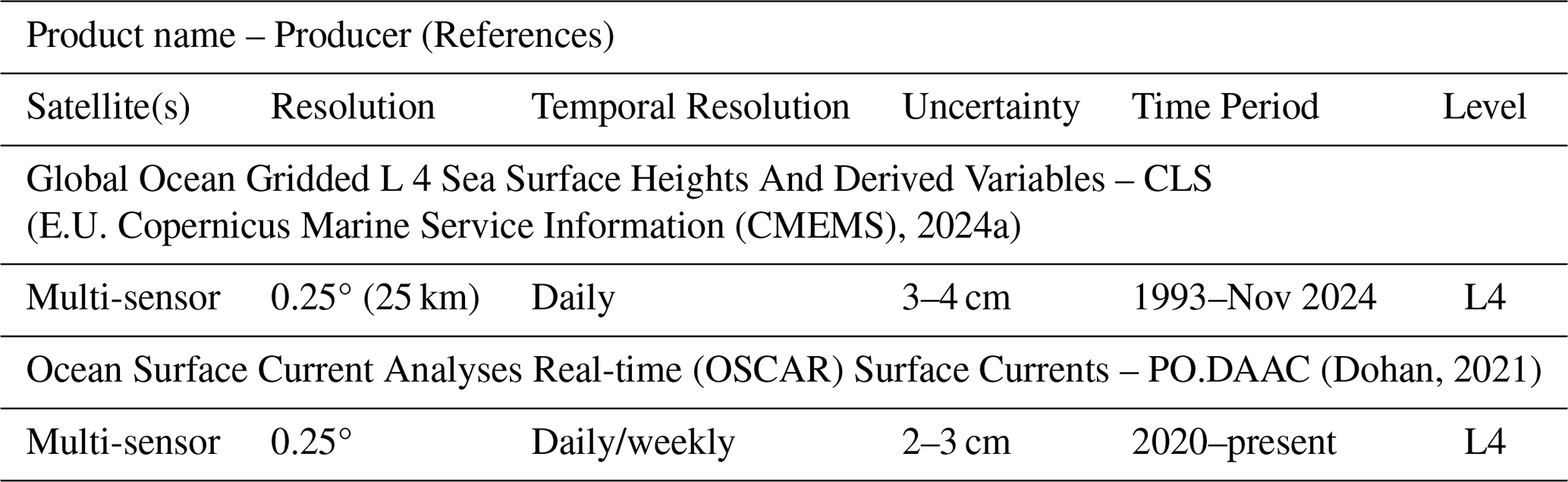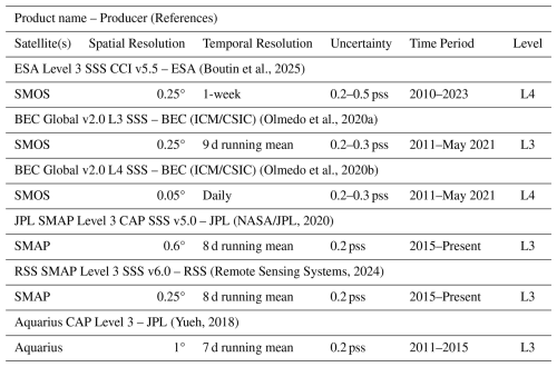 We collected key information of the most widely used sea surface level 3 (L3) and gap-filled level 4 (L4) products for some potential variables such as SSS, SST, SSH, and currents. The SSS is summarized in Table 1, dominated by SSS products from the SMOS and SMAP missions, but also from Aquarius (Yueh, 2018). The earliest records are from the SMOS mission, starting in 2010/2011. It has two L3 products (ESA CCI v5.5 Boutin et al., 2025 and BEC Global v2 Olmedo et al., 2020a) and one L4 (BEC Global v2 Olmedo et al., 2020a), but none of them are served operationally. Two L3 products are derived from SMAP (JPL v5.0 NASA/JPL, 2020 and RSS v6.0 Remote Sensing Systems, 2024), starting from 2015 and offering an operational alternative. The uncertainty of all SSS products ranges between 0.2 and 0.5 pss, where 0.2 pss is the most common uncertainty value. The temporal resolution is approximately 1 week, and the most common spatial resolution is 0.25°.