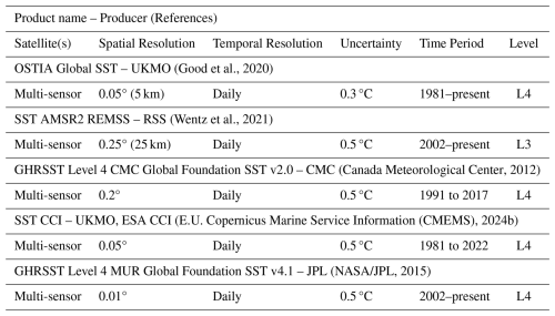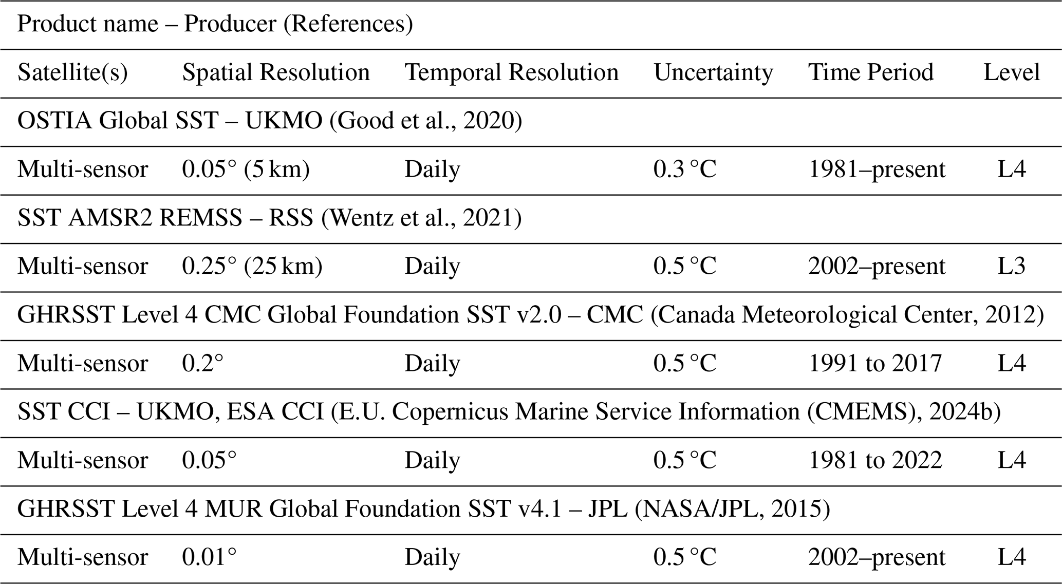The SST products are summarized in Table 2 (Good et al., 2020; Wentz et al., 2021; Canada Meteorological Center, 2012; E.U. Copernicus Marine Service Information (CMEMS), 2024b; NASA/JPL, 2015). All the products shown are derived from multi-sensor (microwave and infrared) analyses and are provided as daily Level 4 datasets, with the exception of SST AMSR2 REMSS, which is a Level 3 product. The spatial resolution varies among products, ranging between 0.01°, when combining infrared and microwave observations and 0.25° for the L3 microwave product. In any case, it is always equal to or finer than the ones from the SSS products, only available from microwave observations. For this reason, our target spatial resolution is 0.25°. The most common uncertainty value is 0.5 °C. Most of the products overlap with the SSS time series, as the latest of the SST datasets begins in 2002 (SSS earliest product is from 2010). The only exception is the operational SMAP products, which do not overlap with ESA CCI and CMC SST datasets, which extend only until 2022 and 2017, respectively.