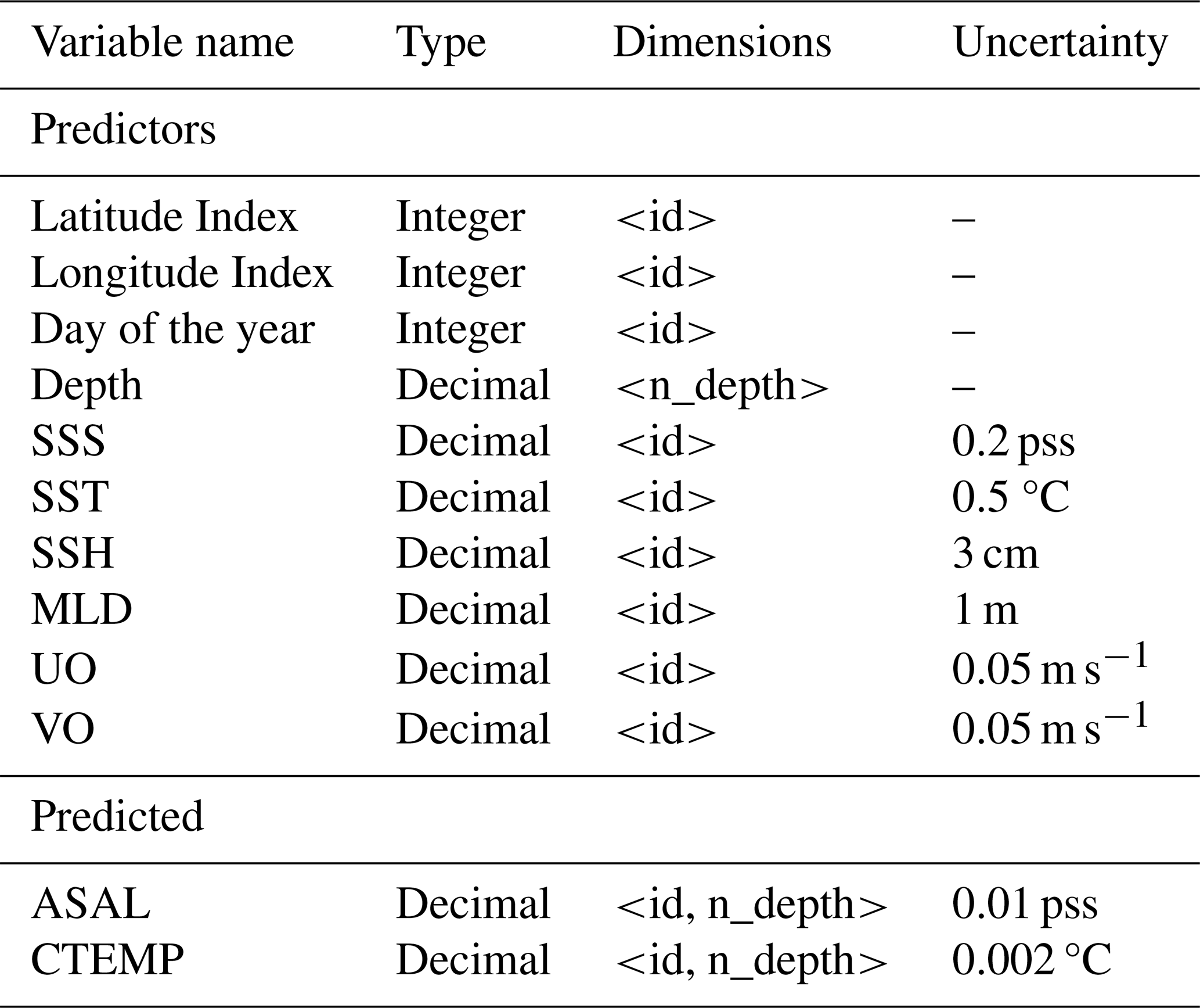 Table 4Simulated OSSE dataset. The dimensions of the dataset are “id”, which corresponds to an index term to identify the profiler, and “n_depth”, which corresponds to the depth level index. The vertical profiles are constructed using the 10 d sliding window data, and the surface data is from the central date of the window.