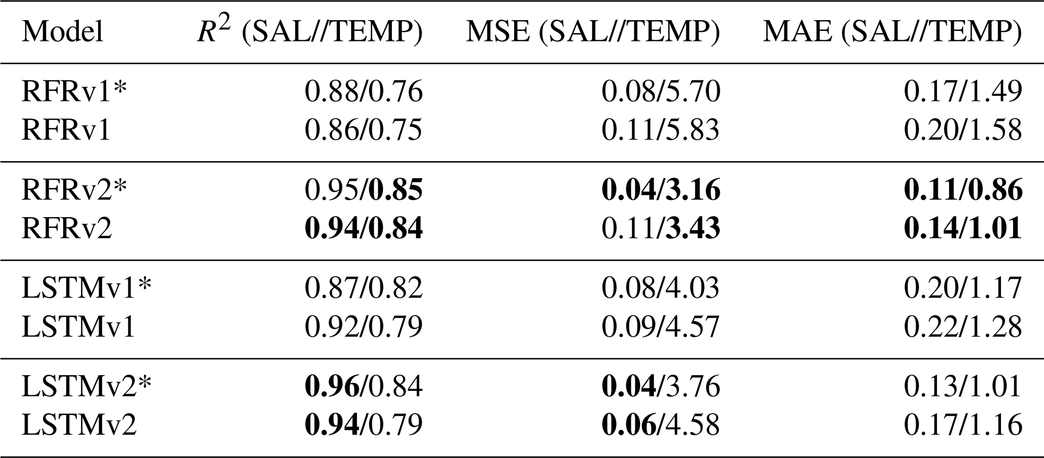 Table 5R2, mean squared error, and mean absolute error metrics for salinity and temperature for the different models. The best-performing model is highlighted in bold text for each metric. The asterisk indicates that the model does not account for uncertainties in the measurements.
