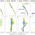 We now use the DTS profiles to assess the vertical structure and extent of temperature changes during the events, complementing the more sparsely spaced MicroCAT time series. The DTS temperature profiles at Channel Camp during the four highlighted events reveal a consistent pattern of temperature changes within the water column (Fig. 7). Throughout all events, water masses between 400 and 600 m depth exhibit anomalous warm temperatures, with the most pronounced temperature increase occurring around 450 to 500 m depth. Conversely, the deeper water between 600 and 800 m experiences anomalous cool temperatures, which is strongest at 700 m depth. Additionally, a near-isothermal layer forms between 300 and 400 m, suggesting vertical mixing over this depth range. The temperature profiles show a progressive shift in thermal structure, with warming and cooling trends developing simultaneously in distinct layers. Notably, the 600 m depth emerges as a clear transition point, marking the boundary between the warming upper layers and the cooling deeper waters.