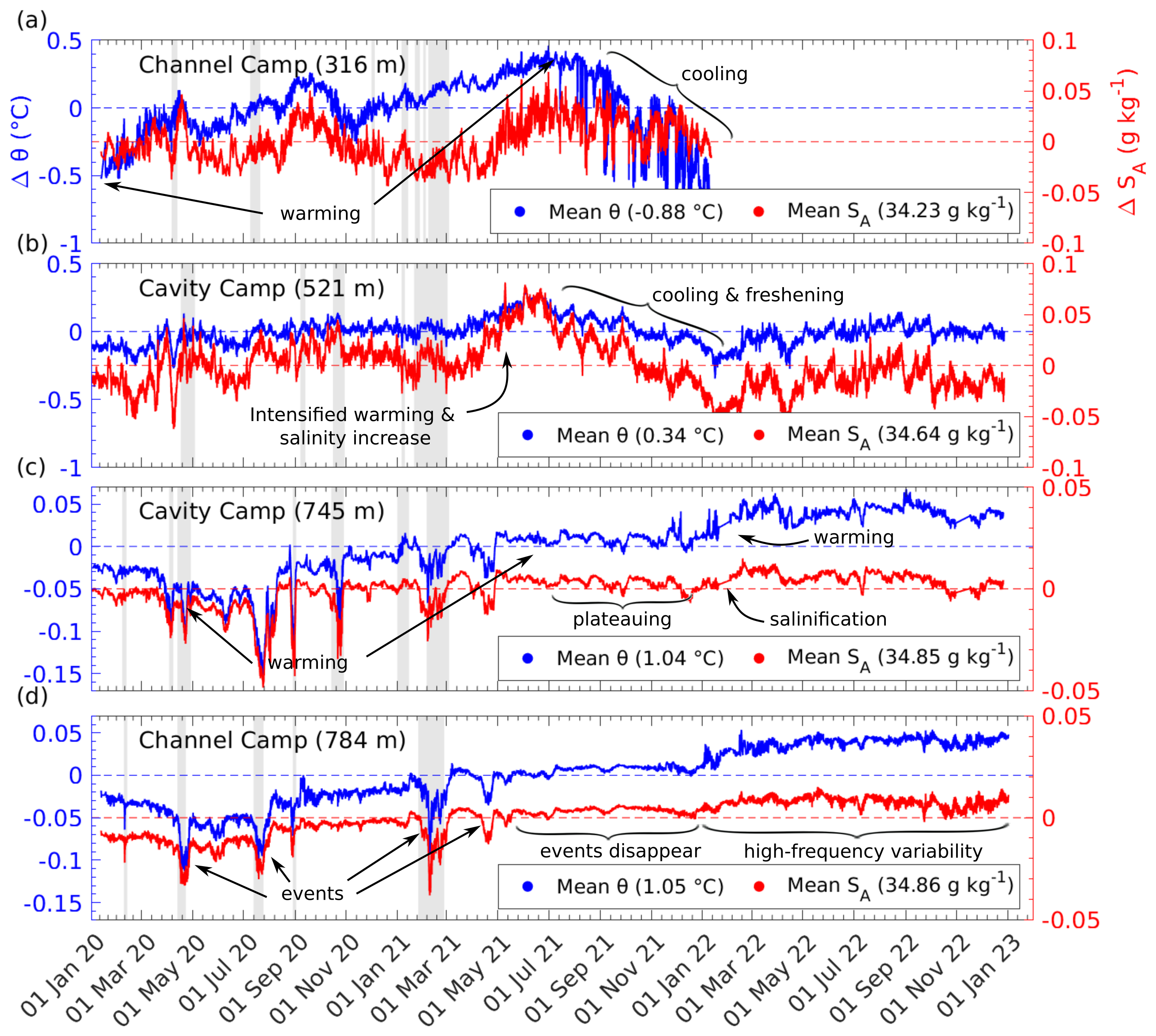 Both deep MicroCATs recorded a 0.1 °C warming from April 2020 to January 2023, accompanied by a 0.02 g kg−1 increase in SA (Fig. 2c, d). Θ and SA fluctuations were generally synchronous at both deep MicroCATs. Near the seabed at Cavity Camp, warming occurred at a rate of 0.04 °C yr−1 until July 2021, then plateaued until January 2022, after which it resumed warming at a rate of 0.01 °C yr−1 until January 2023. At Channel Camp, the warming trend near the seabed was also 0.04 °C yr−1 until July 2021, then plateaued before increasing to 0.02 °C yr−1 after January 2022. This suggests that between January 2022 and January 2023, the warming trend re-emerged in both mid-depth and deep layers.
