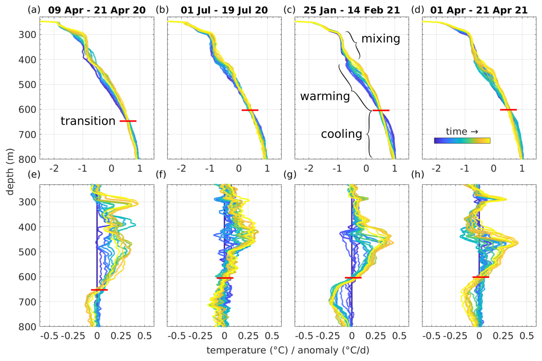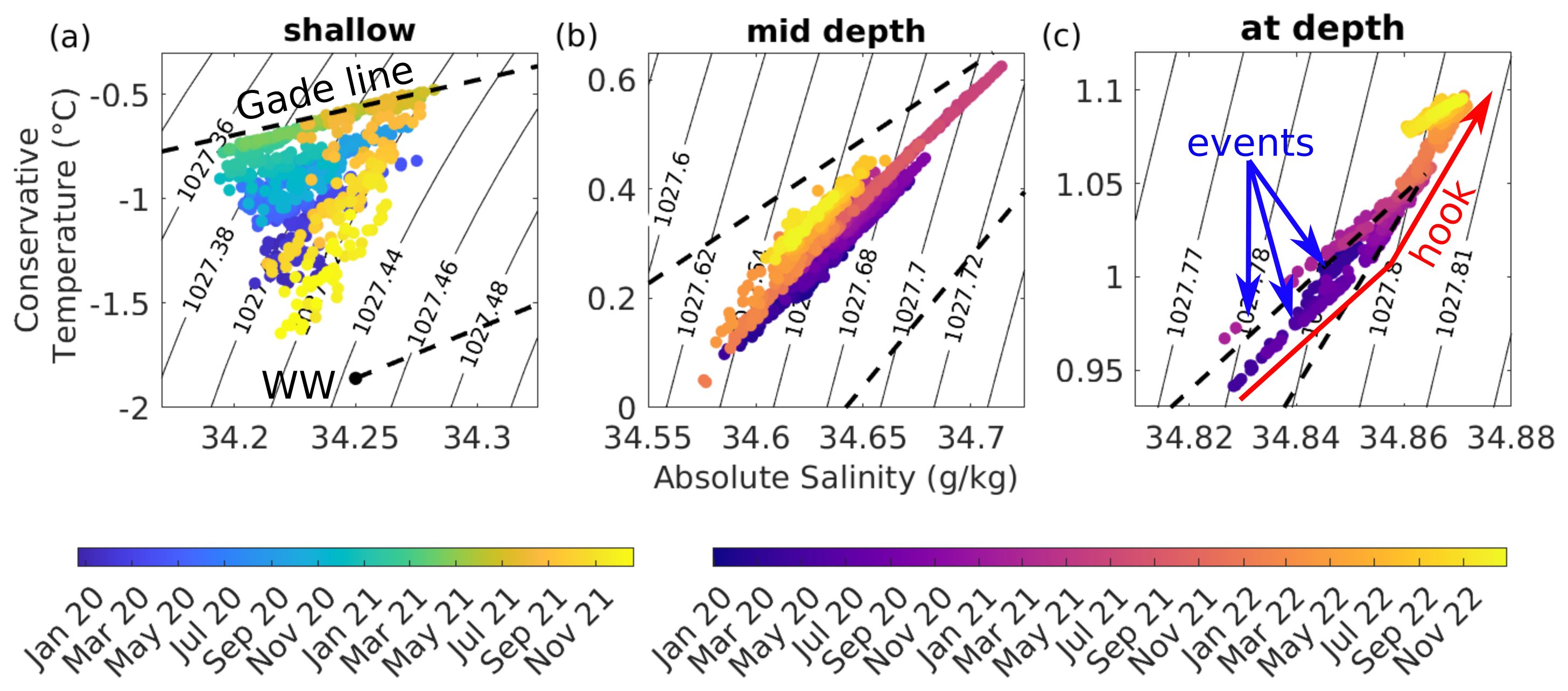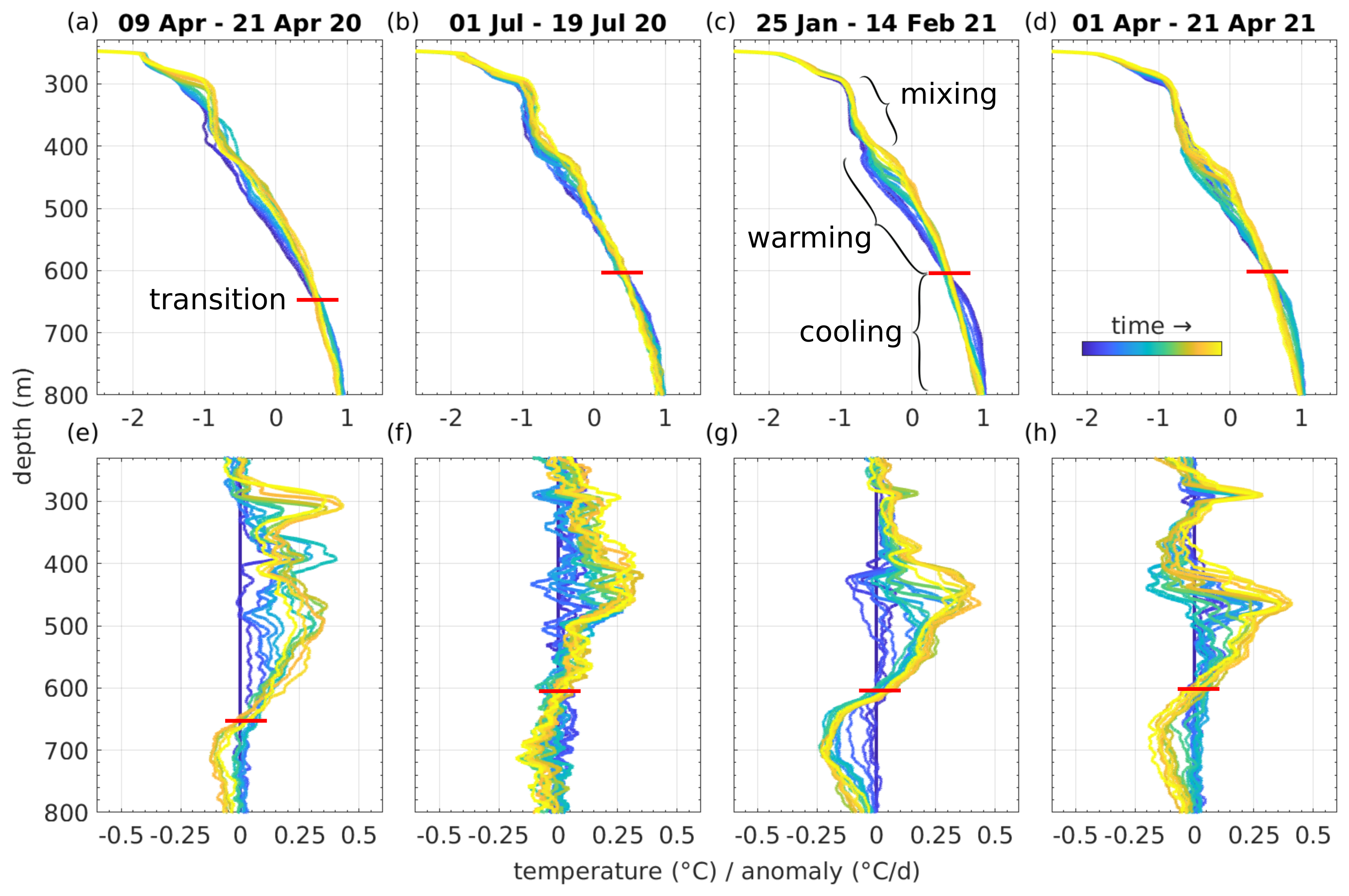 We propose that the events of anomalous temperatures are driven by processes causing heaving and sinking around an expanding layer at 600 m depth, which marks the top of the mCDW layer. During the events, water mass properties change both upward and downward (Fig. 7), suggesting the influence of gyre-scale features moving through the water column and driving its transient evolution (Fig. 8). This interpretation is supported by the DTS profiles, which reveal periodic excursions of water mass properties centered around 600 m depth (Fig. 9a, d). Additionally, during these events, the hydrographic properties shift back and forth along a distinct trajectory, indicating that no mixing of water masses occurs.