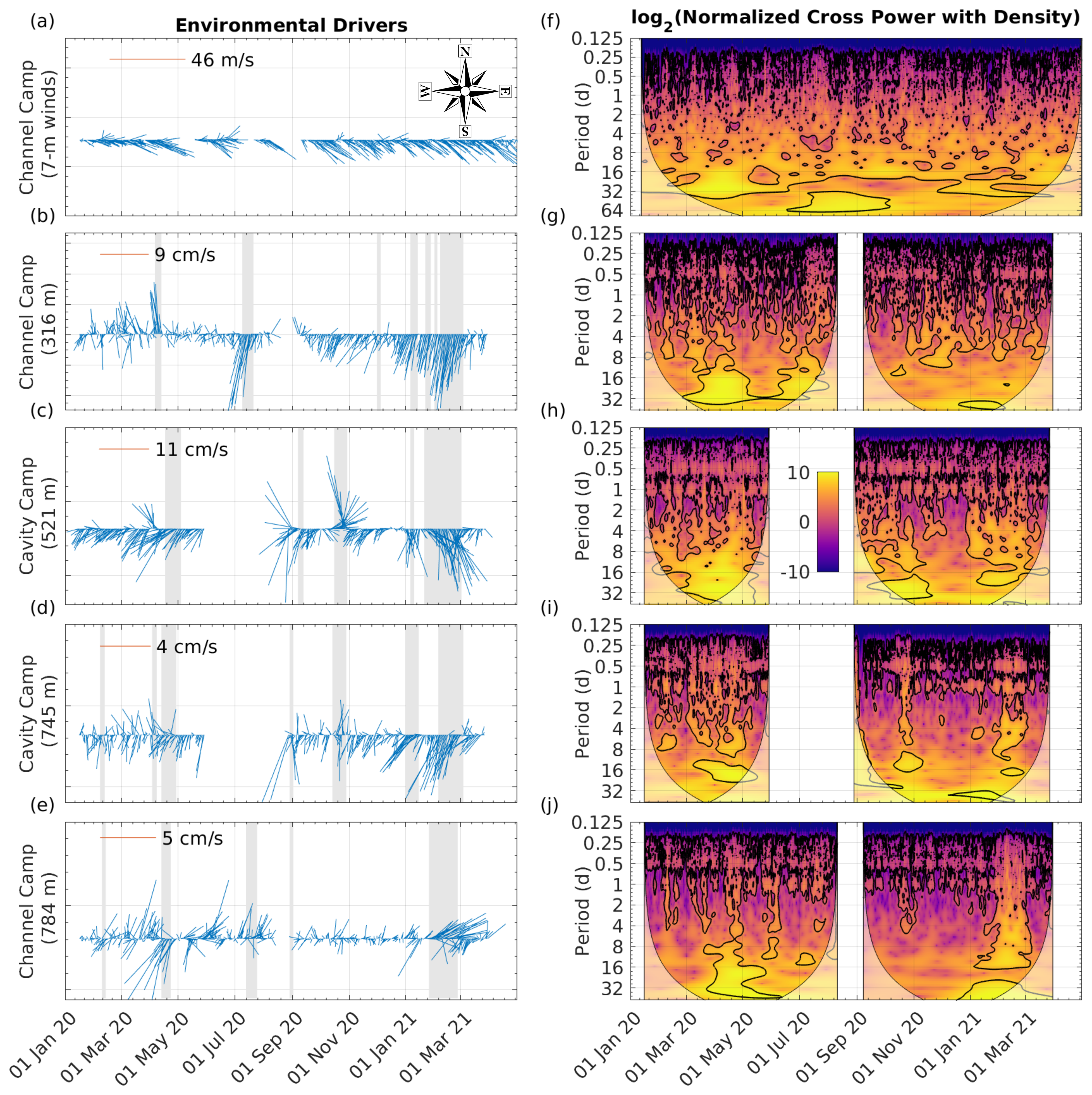 Figure 6Feather plots of average daily (a) in situ wind and (b–e) current speed and direction from January 2020 to March 2021. The line orientation represents wind and current direction (with the top of the graph indicating north or 360°), while line length corresponds to speed. Wind direction follows the meteorological convention, indicating the direction from which the wind originates, whereas currents are shown flowing toward their respective directions. The gray-shaded areas denote periods of elevated current speeds as discussed in the text. (f) Cross-wavelet transform between shallow density and ERA5 wind speed covariance. (g–j) Cross-wavelet transforms between density and current speed time series for each depth.