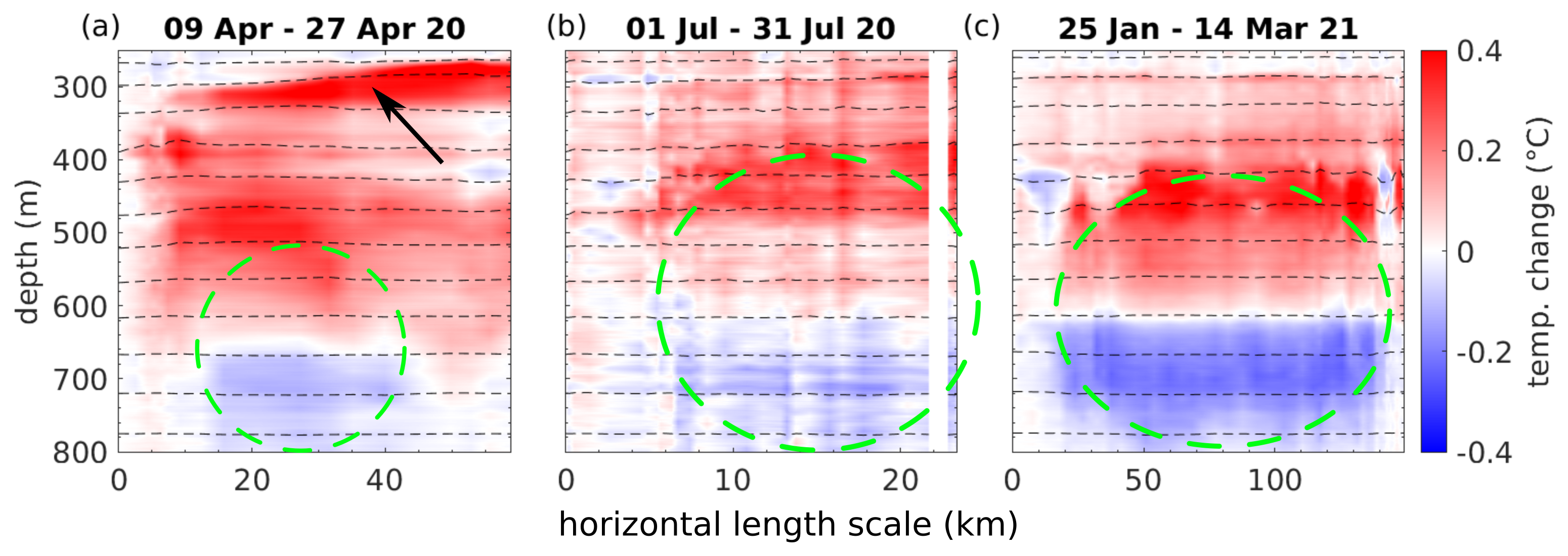 Figure 8Temperature anomalies over time for three distinct periods. Each panel shows the deviation from the first profile in the respective period. The color scale represents the magnitude of temperature change, with negative values indicating cooler temperatures at depth and positive values indicating warmer temperatures above ∼ 600 m depth. The x axis reflects the distance traveled by features advecting through the water column, based on Aquadopp current speed measurements, available during the first three events. Dashed black lines show isopycnals. The black arrow in panel (a) shows warming in the shallowest layer discussed in the text. Dashed green circles show the identified features.