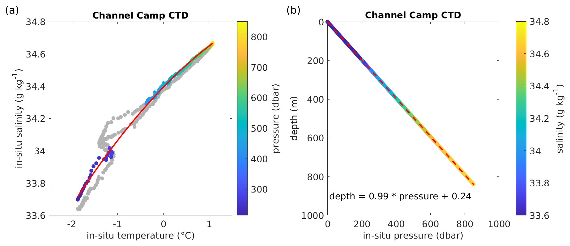 Figure A1CTD cast at Channel Camp. (a) Relationship between in situ temperature and salinity from CTD profiling on 12 January 2020. Colored dots indicate the data points used to derive a polynomial fit (red curve), excluding the thermocline to reflect long-term averages. (b) Relationship between in situ pressure and depth below the ocean surface, with the linear fit shown as a dashed red line. Note the transition from fresh water in the borehole to saltwater in the ocean cavity around 200 m depth.