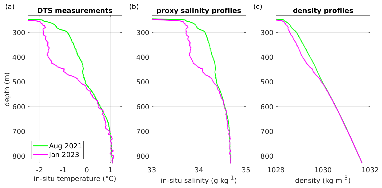 After calibration, we used the relationship between in situ temperature and salinity from the initial CTD cast to calculate Θ profiles based on the “proxy salinity profiles”. This approach assumes that the proxy salinity profile derived on 12 January 2020 remains representative throughout the 3 years of DTS data collection. To validate this assumption, we compared it against a time series of in situ temperature, salinity, and pressure from two MicroCATs. We calculated Θ in two ways: (1) using the salinity time series and (2) using a constant salinity from the initial measurement. The differences between these two methods were negligible (RMSE of 0.0002 °C for the shallow MicroCAT and 0.001 °C for the deep MicroCAT at Channel Camp compared to mean values of −0.88 and 1.05 °C, respectively). Based on these results and the lack of other measurements, we assume a constant salinity profile to derive seawater density profiles, allowing us to assess the net effect of in situ temperature changes on mean water column density (Appendix A). A caveat of this assumption is that this approach primarily captures warm/salty and cold/fresh water masses and does not account for the warm/fresh combination typical for glacial meltwater in this region.