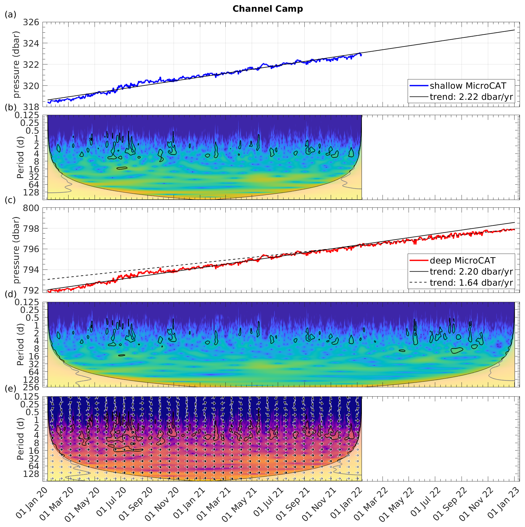 Figure C1Pressure records from Channel Camp for (a) shallow levels and (c) near the seabed. Panels (b) and (d) display the continuous wavelet transforms of the two time series. Panel (e) shows the cross-wavelet transform between the two pressure records for their overlapping time period.
