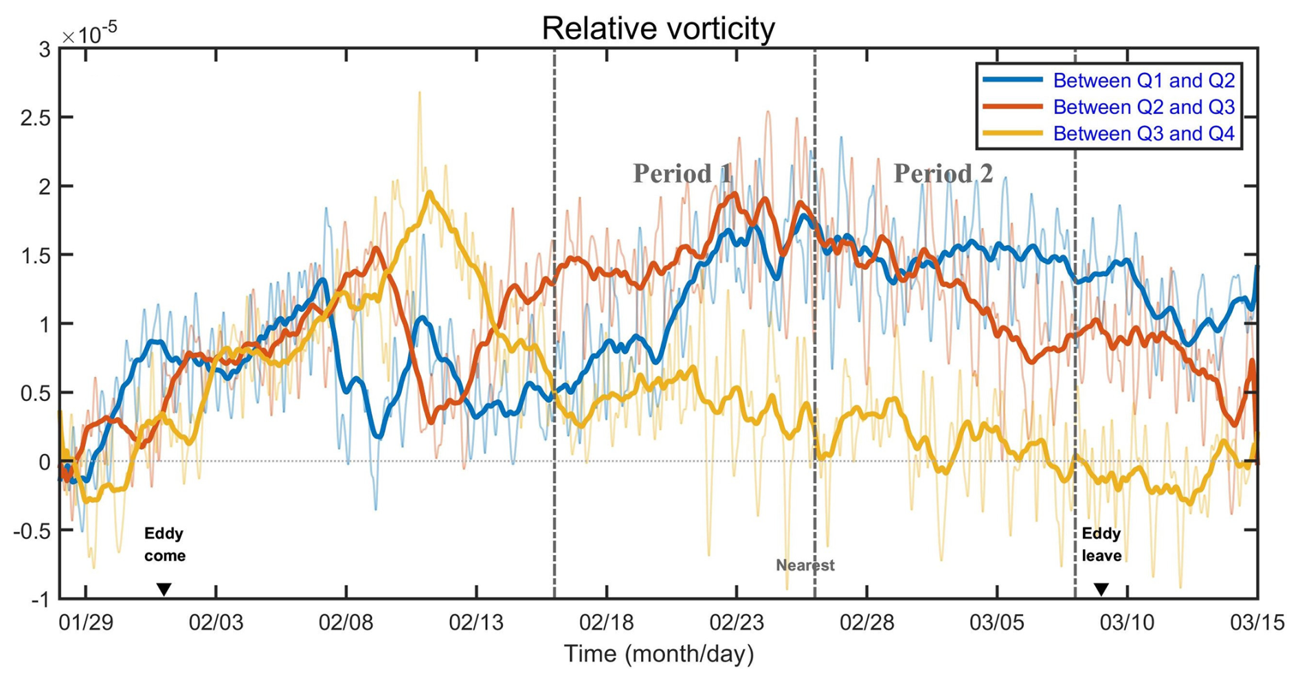 The snapshots of SLA and surface geostrophic velocity fields show that the CE approached the mooring array on 1 February (Fig. 2). Its center passed through Q3 around 26 February and it left the mooring array on 9 March. During the entire observation period, NIWs exhibited a small blue shift of near-inertial frequency with a peak value of 0.616 cpd (cycles per day) (Fig. 1c), while a significant blue shift occurred during the eddy period (1 February–9 March) due to the background positive vorticity of the CE. The peak of spectral frequency (ωp) reached 0.667 cpd, with a relative frequency shift (ωp-ff, RFS) of about 10.8 % in this area. It is significantly larger than the global RFS (Guo et al., 2021), suggesting significant impact of the CE on local near-inertial frequencies. The observed near-inertial spectral peak, ωp=0.667 cpd, in the CE is consistent with the effective inertial frequency, feff=f+ζ0.69 cpd, estimated from surface geostrophic currents and the local inertial frequency.