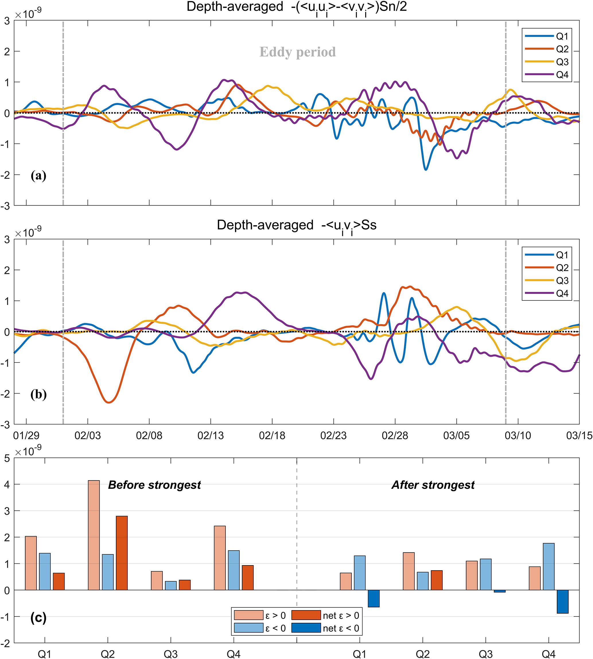 Figure 9(a) Time series of depth-averaged (above 200 m) normal strain -uiuiviviSn2 of the CE for each mooring. (b) Time-series of depth-averaged (above 200 m) shear strain (−〈uivi〉Ss) of the CE for each mooring. (c) Time- (7 d) and depth-averaged (above 200 m) positive (light red), negative (light blue) and net transfer rate (dark red and blue indicate positive and negative values) before and after the NIKE reaching its peak at Q1Q4.