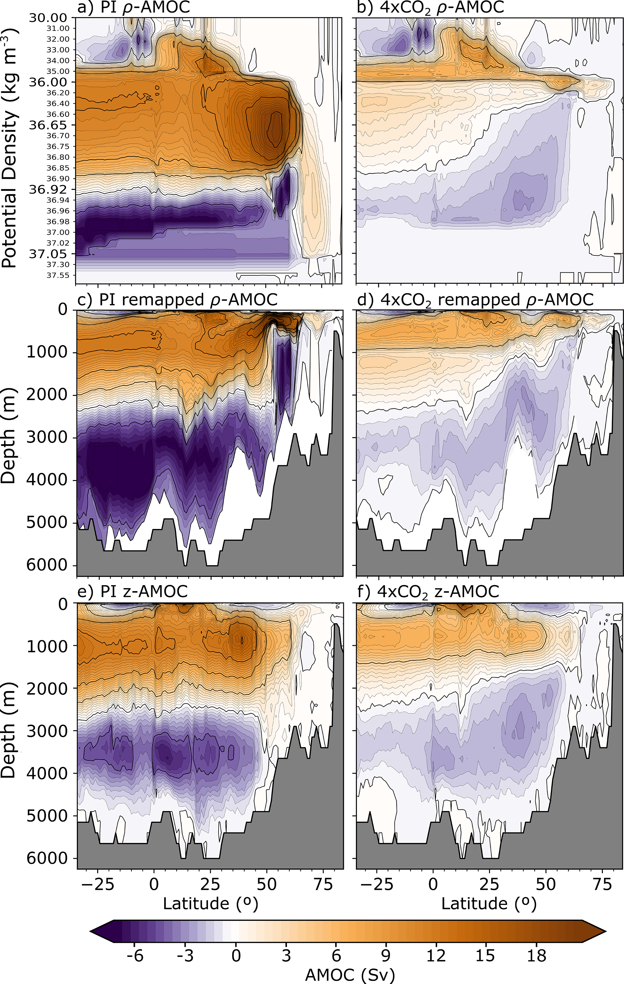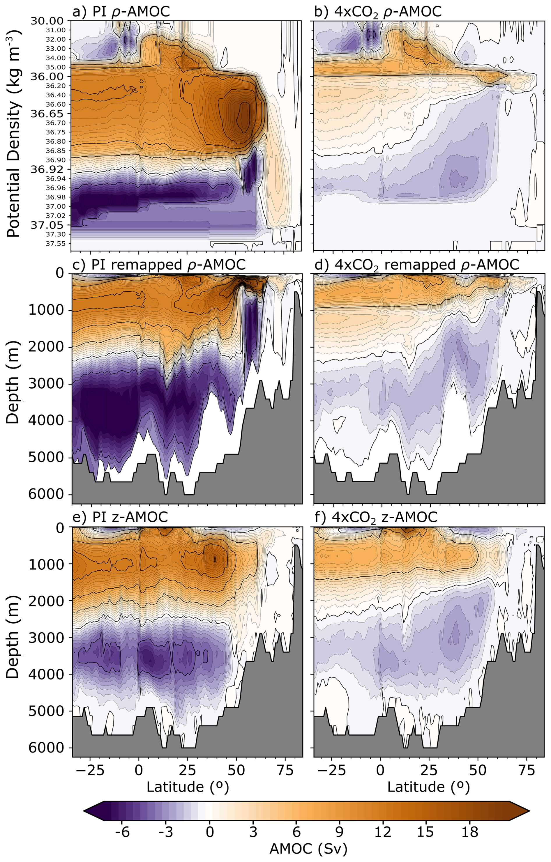 Figure 1Mean AMOC strength in units of Sverdrup (1 Sv ≡106 m3 s−1) averaged over the last 50 years of the PI and 4xCO2 simulations. Panels show (a, b) ρ-AMOC, (c, d) ρ-AMOC remapped into depth coordinates, and (e, f) z-AMOC for (a, c, e) PI and (b, d, f) 4xCO2. In (c, d), ρ-AMOC is remapped into depth coordinates by loading the mean layer thickness of each density class, cumulatively summing these thicknesses to obtain the bottom depth of each class, then shifting the cumulative sum down one index (with the surface layer reset to zero) so that each transport bin appears at the depth of its upper boundary.