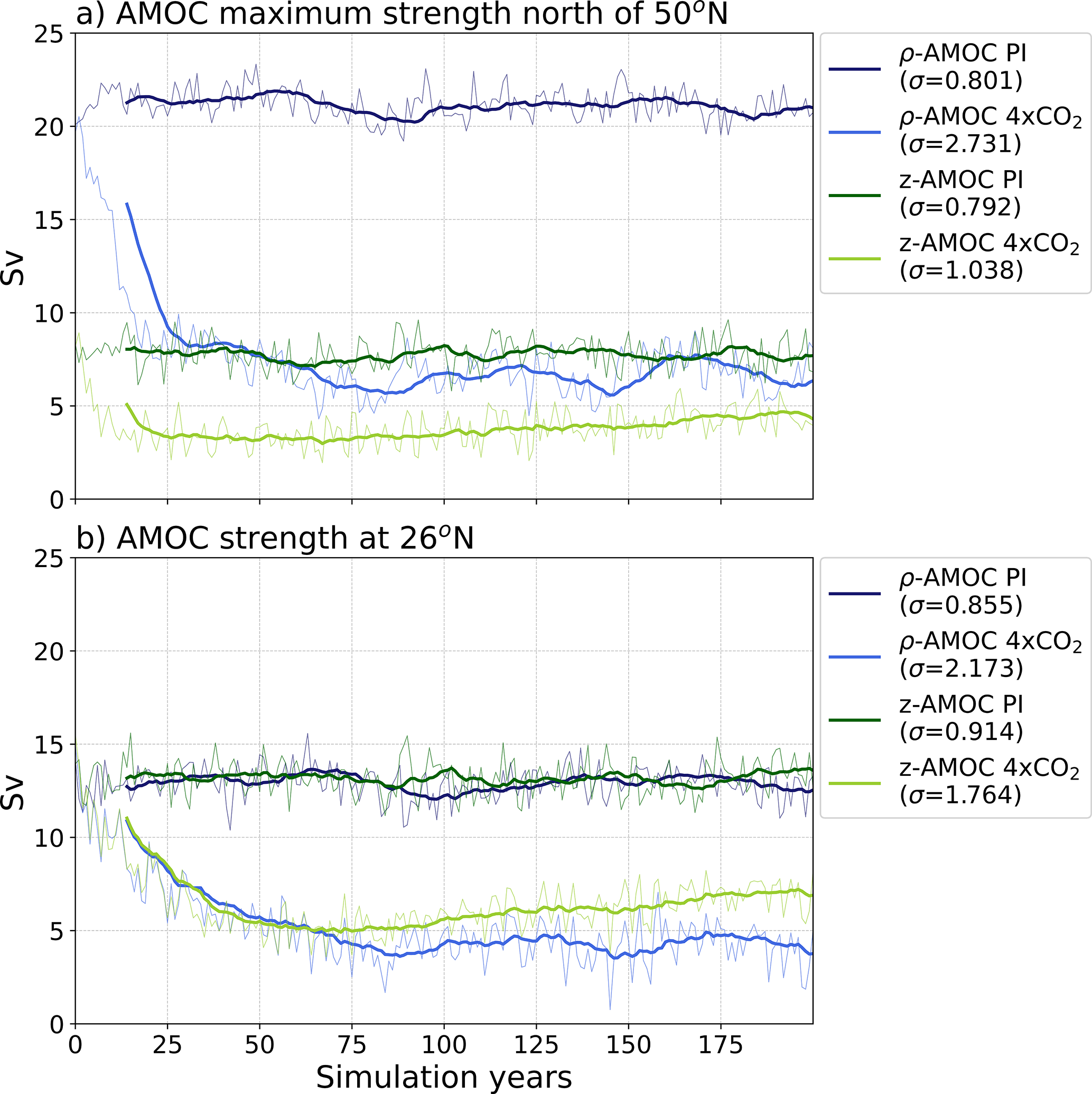 Figure 2Annual mean time-series (thin lines) of ρ-AMOC (dark blue, royal blue) and z-AMOC (green, yellowgreen) in units of Sverdrup (Sv) under PI (dark blue, green) and 4xCO2 (royal blue, yellowgreen) forcing with superimposed 15 year rolling mean (thick lines). (a) AMOC strength at 26° N (AMOC26 index), (b) maximum AMOC strength north of 50° N (AMOCmax index).