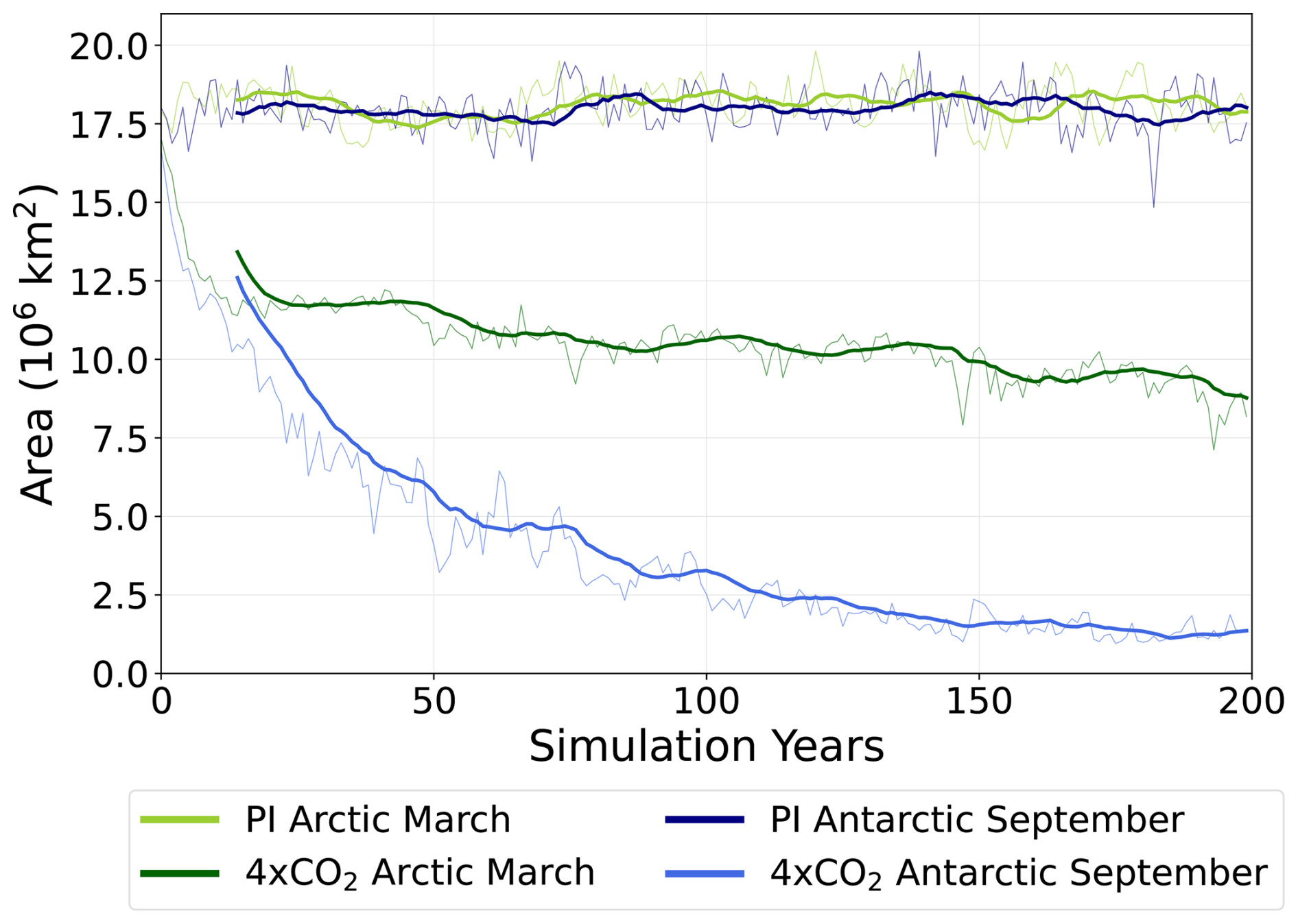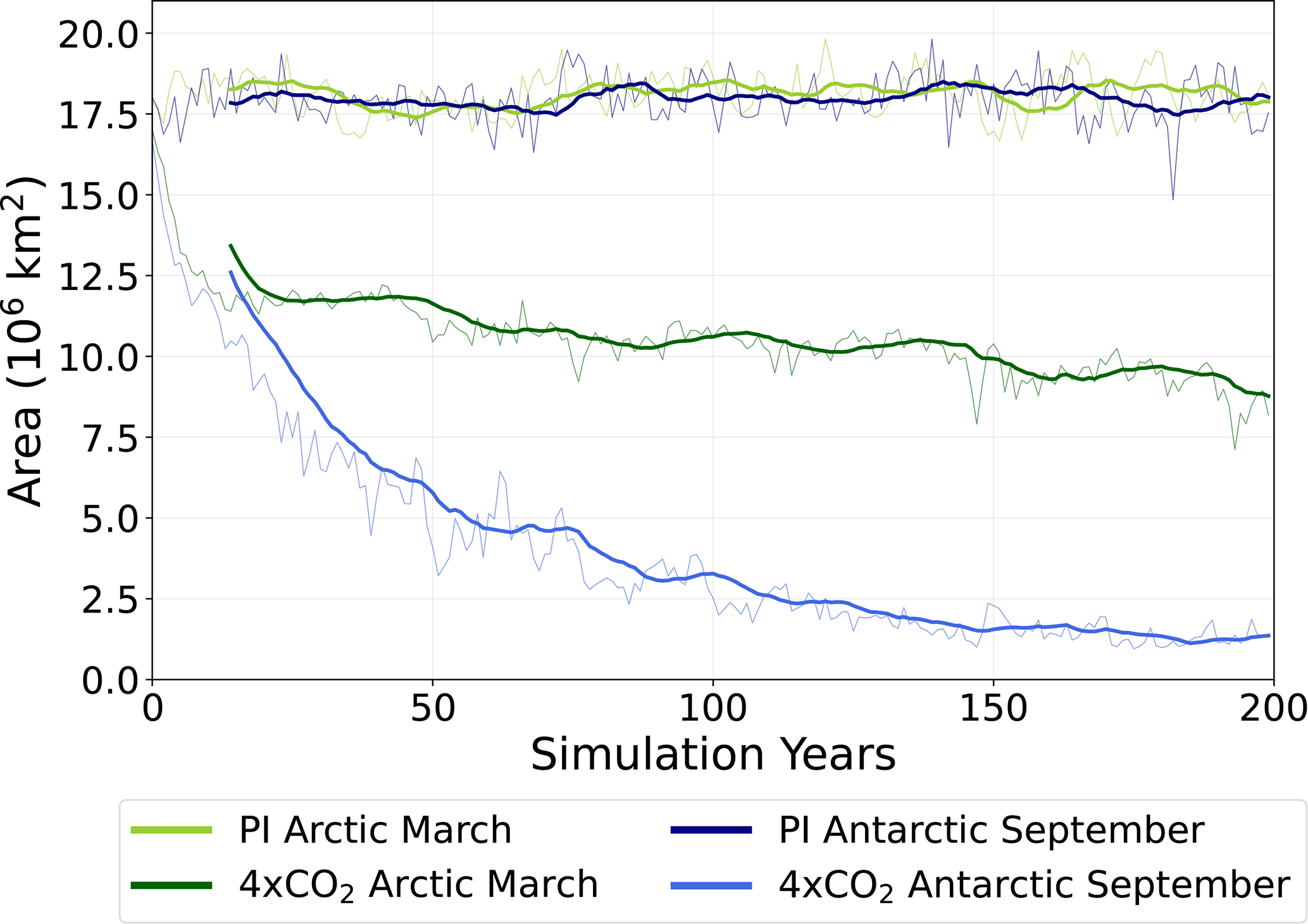Figure 3Winter Sea ice area in the Arctic and Southern Oceans in PI and 4xCO2 simulations. Annual means are represented in thin lines and a superimposed 15 year rolling mean is represented in thick lines to highlight multidecadal variability.