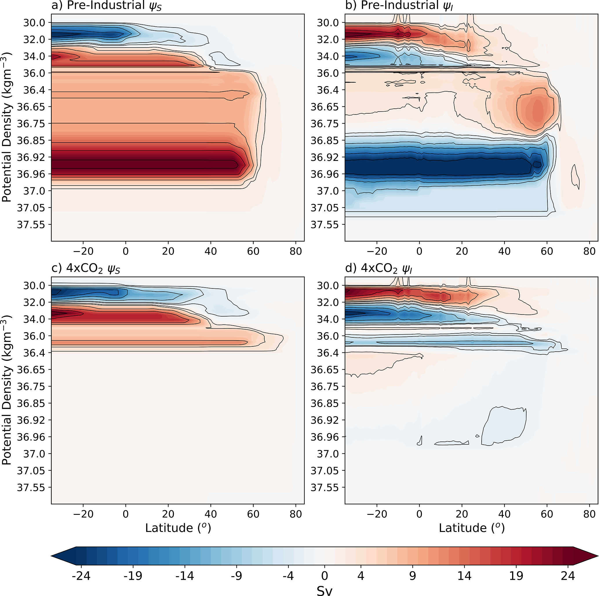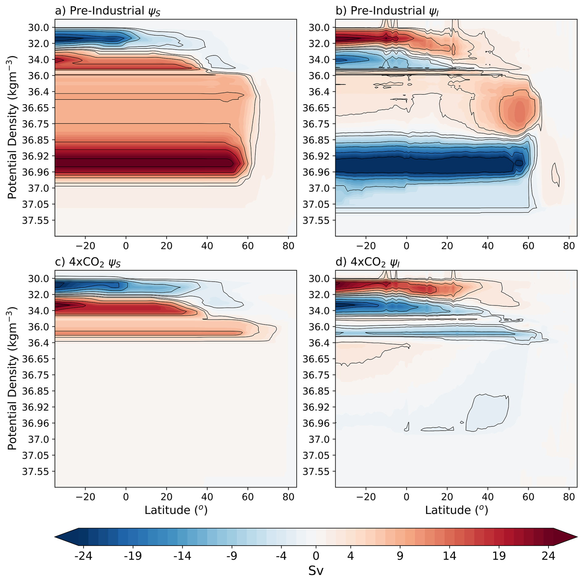 Figure 4Mean surface (ψS; a, c) and interior (ψI; b, d) water mass transformation streamfunctions in (a, b) PI and (c, d) 4xCO2, respectively. Blue contours indicate upwelling (i.e., transformations toward lighter waters), while red contours indicate downwelling (i.e., transformations toward denser waters).