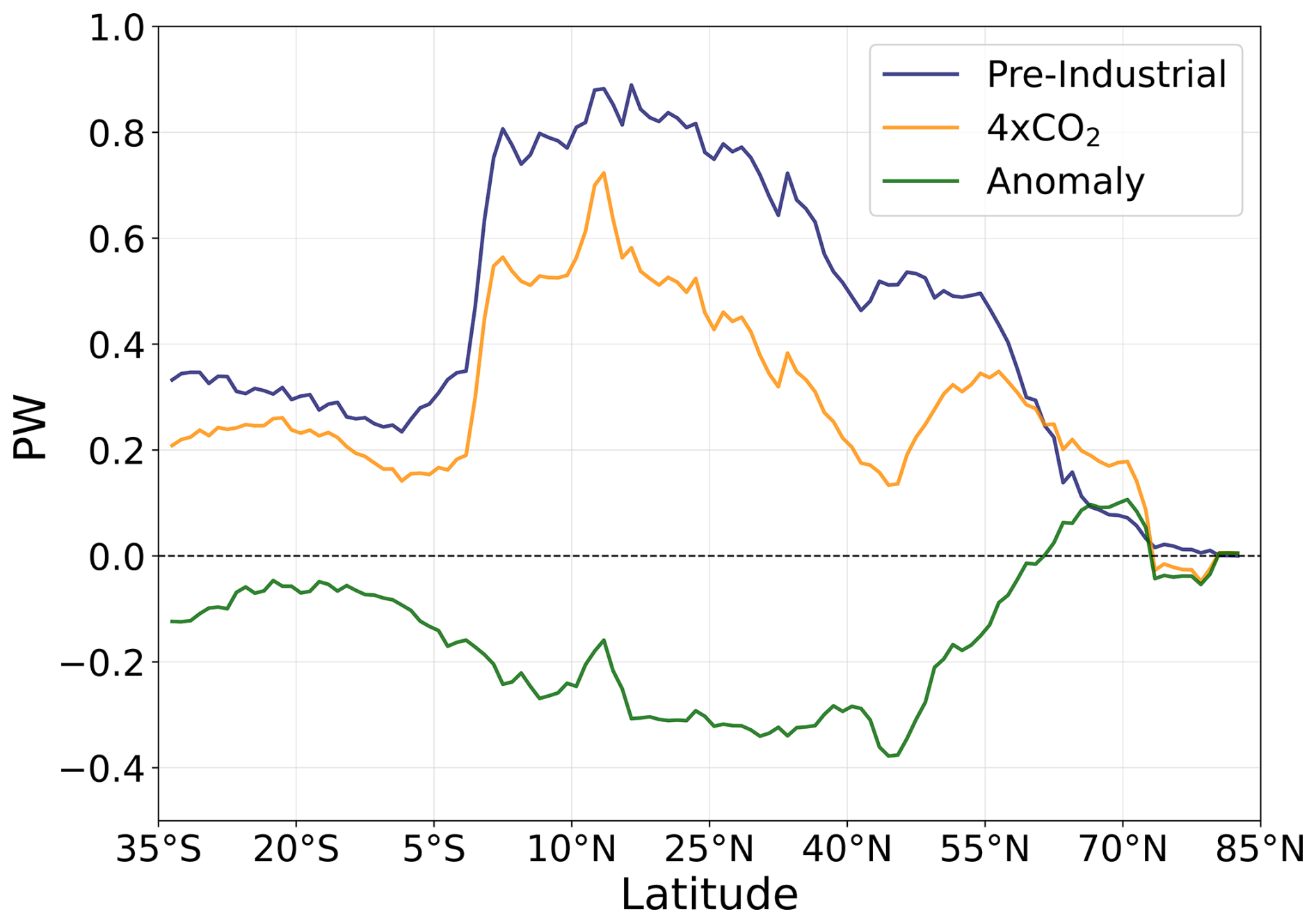 Utilizing the AWI-CM3 model (Streffing et al., 2022), we conduct a quasi-equilibrium pre-industrial simulation (PI) that we employ as the control climate, and a perturbed warm climate simulation with an abrupt quadrupling of PI CO2 concentration (4xCO2). Both simulations span 200 years and were branched off from an equilibrated 1000 year PI spin-up simulation, adhering to CMIP6 guidelines (Eyring et al., 2016), as introduced in Sect. 1. Analyses of mean large-scale processes were performed utilizing the output of the final 50 years of each simulation.