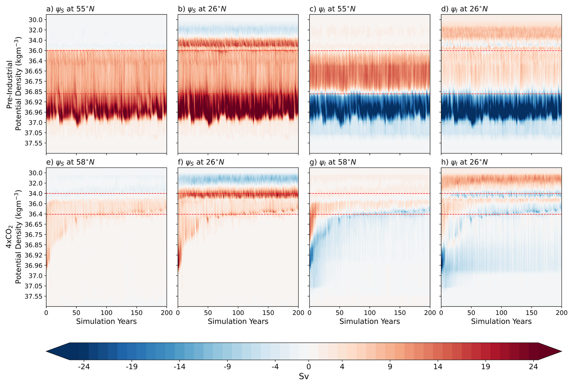 Furthermore, our findings suggest that the divergence between the results of our PI and 4xCO2 simulations stems from the distinct role of interior and surface transformations in driving the AMOC, that can only be directly accounted for in density space. In 4xCO2, overall, surface transformations drive the AMOC strength while interior transformations drive the variability of the AMOC. In this sense, deep convection is maintained in the Irminger Sea and is intensified in the GIN Seas, driven by amplified winter sea-ice melt in the Arctic. This signal is evident through the analysis of the diapycnal velocity field (Fig. 7d) and from the shoaling of the NSOW to the same density class of the mid-depth cell that represents ρ-AMOC (Fig. 1b). The deep convection in the IS and GIN seas is maintained mostly by surface transformations in 4xCO2, contrary to PI, where interior transformations contribute at a similar magnitude. On the other hand, the effect of interior transformations in the ρ-AMOC in 4xCO2 continues to be substantial, particularly to its variability, as the entrainment of lighter overflows occur concurrently with shifts in ρ-AMOC strength. Finally, by showing that ρ- and z-AMOC diverge not only in the subpolar North Atlantic but also in the subtropical North Atlantic under warmer climates, our work provides a novel perspective on the implications of framework choice. Additionally, we have provided substantial evidence that the role of surface and interior transformations in driving the AMOC must be explicitly assessed.
