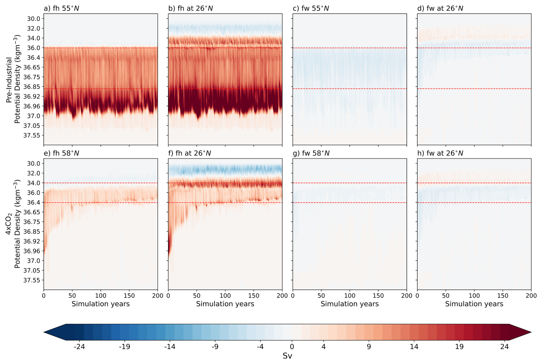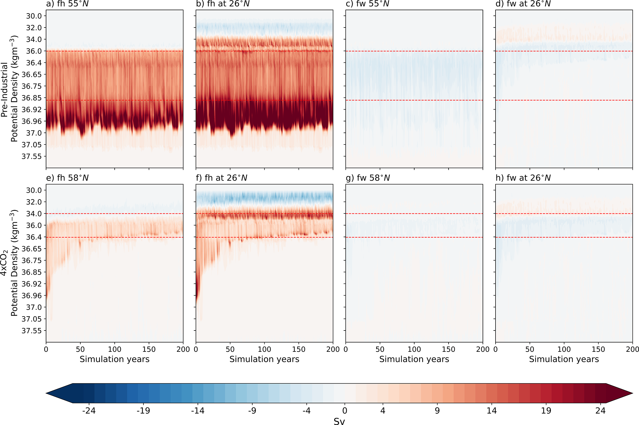Figure A1Hovmöller diagrams of the contributions of heat fluxes (FH) and freshwater fluxes (FW) to surface transformations for PI (a–d) and 4xCO2 (e–h). First two columns (a, b, e, f) display the FH at (a, e) the ρ-AMOC maximum latitude and (b, f) 26° N, while last two columns (c, d, g, h) display the FW at (c, g) the ρ-AMOC maximum latitude and (d, h) 26° N. Positive (red) values indicate transformations toward lighter waters (buoyancy gain/upwelling), and negative (blue) values indicate transformations toward denser waters (buoyancy loss/downwelling). Red dashed lines denote the upper and lower density bounds of the ρ-AMOC upper limb, computed from the mean over the last 50 years of each simulation. The ρ-AMOC maximum latitude for both simulations is displayed in Table 1.