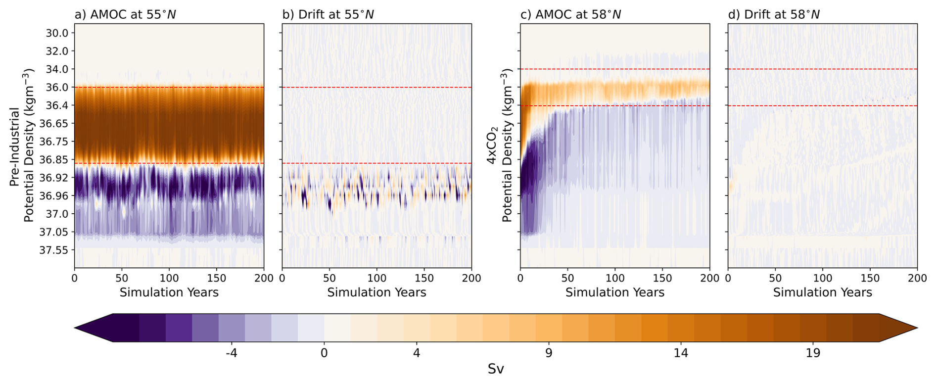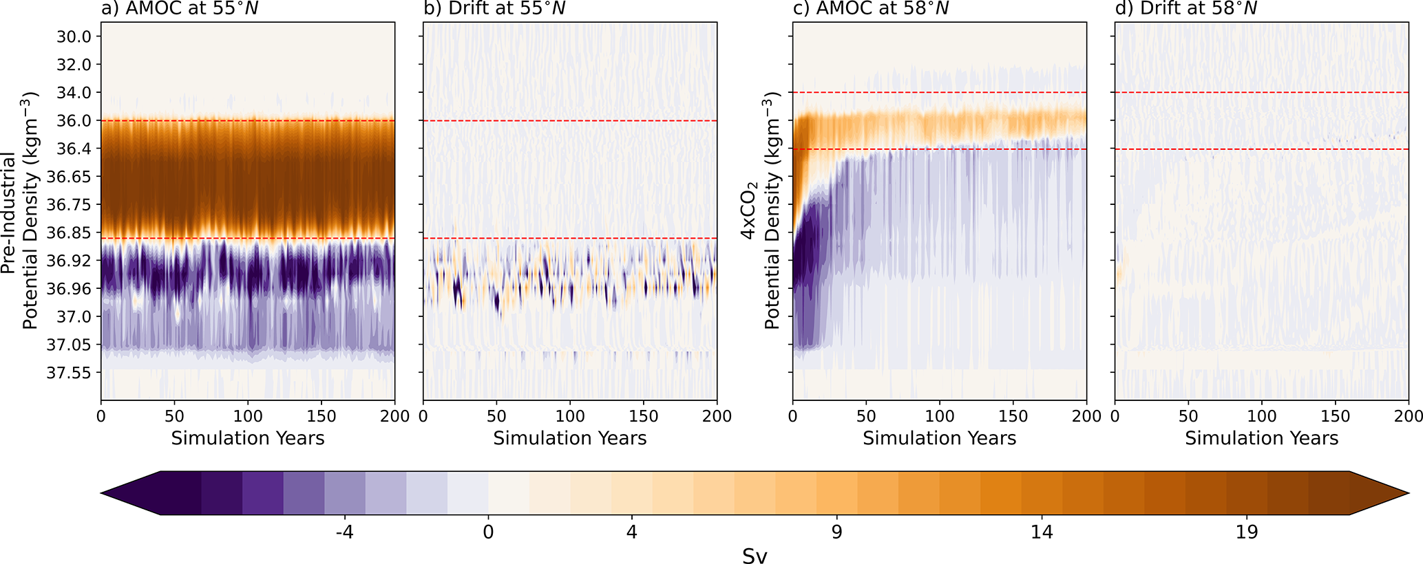 Figure A2Hovmöller diagrams of ρ-AMOC (a, c) and model drift (b, d) in density space for PI (a, b) and 4xCO2 (c, d). Red dashed lines denote the upper and lower density bounds of the ρ-AMOC upper limb, computed from the mean over the last 50 years of each simulation. The ρ-AMOC maximum latitude for both simulations is displayed in Table 1.
