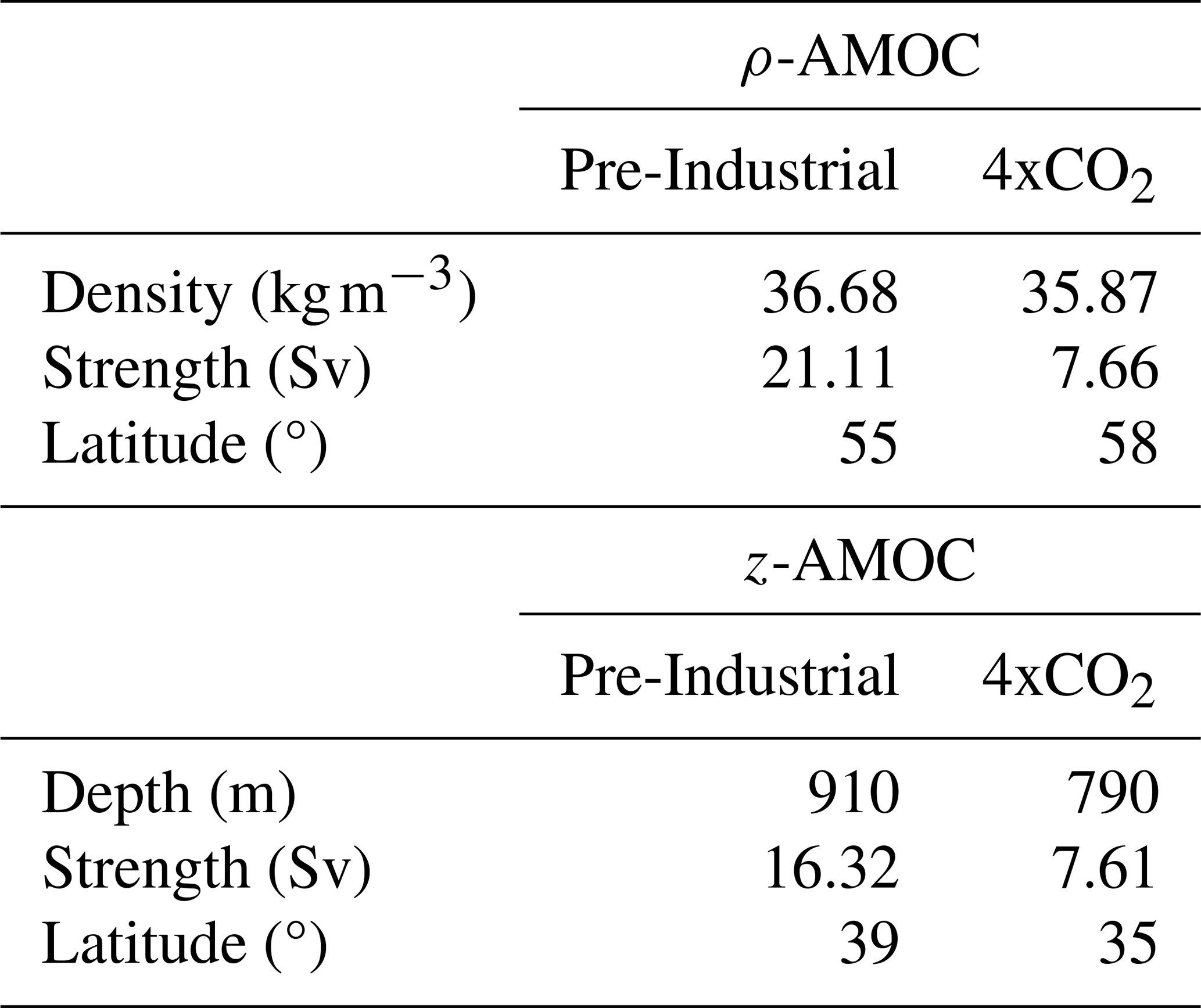 Table 1Location and strength of the ρ- and z-AMOC maxima, computed as the average of the last 50 years of each simulation.