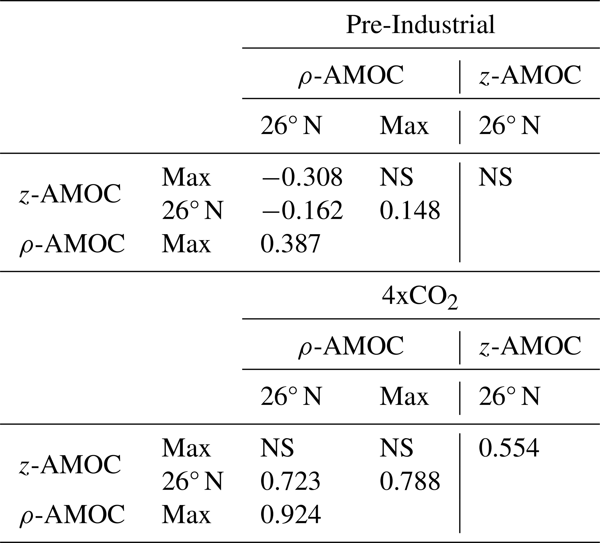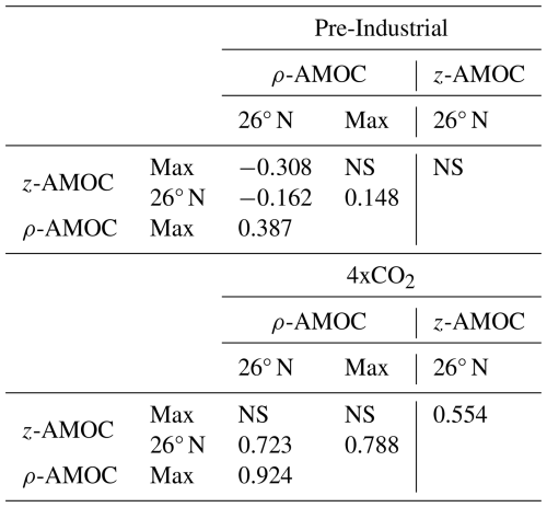 The AMOC26 and AMOCmax indices (Fig. 2) emphasize that the choice of framework significantly influences the interpretation of AMOC changes to different forcings across latitudes. In PI (Fig. 2a), ρ-AMOCmax is about 13 Sv stronger than z-AMOCmax, with both displaying similar intra- to multi-decadal variability, but not correlated (Table A2). This difference in magnitude arises from the distinct latitudinal location of the AMOC maximum in density and depth space and has implications for the comparison of z-AMOC with AMOC observations in the SPNA, potentially creating model-observation discord and adding further uncertainty to assessments of the AMOC state as the climate continues to change. Under 4xCO2 conditions, the magnitude of AMOC weakening is similar in both diagnostics until simulation year 50. Thereafter, ρ-AMOCmax and z-AMOCmax diverge in both magnitude and variability, with z-AMOCmax displaying a slight recovery toward the end of the simulation and ρ-AMOCmax oscillating around 7 Sv, suggesting a mechanism that inhibits AMOC recovery that is concealed in depth space diagnostics. Moreover, z-AMOCmax in PI and in 4xCO2 are weaker than at 26° N, which highlights the fact that z-AMOC does not display overturning in the subpolar North Atlantic, as its maximum is located at 39° N and not at 50° N.