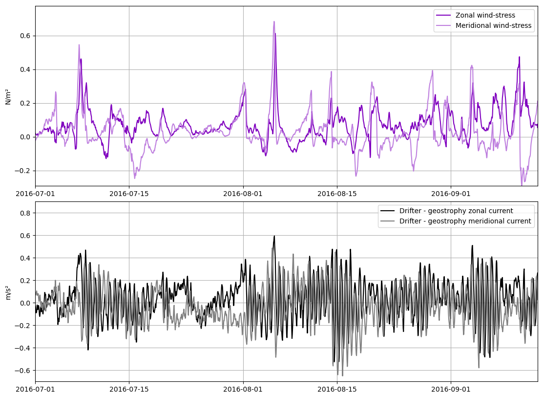 Figure 2Example of Lagrangian time series of the ERA5 wind stress (zonal and meridional components) co-located at a drifter position (upper panel) and time series of the drifter ageostrophic velocity (lower panel).