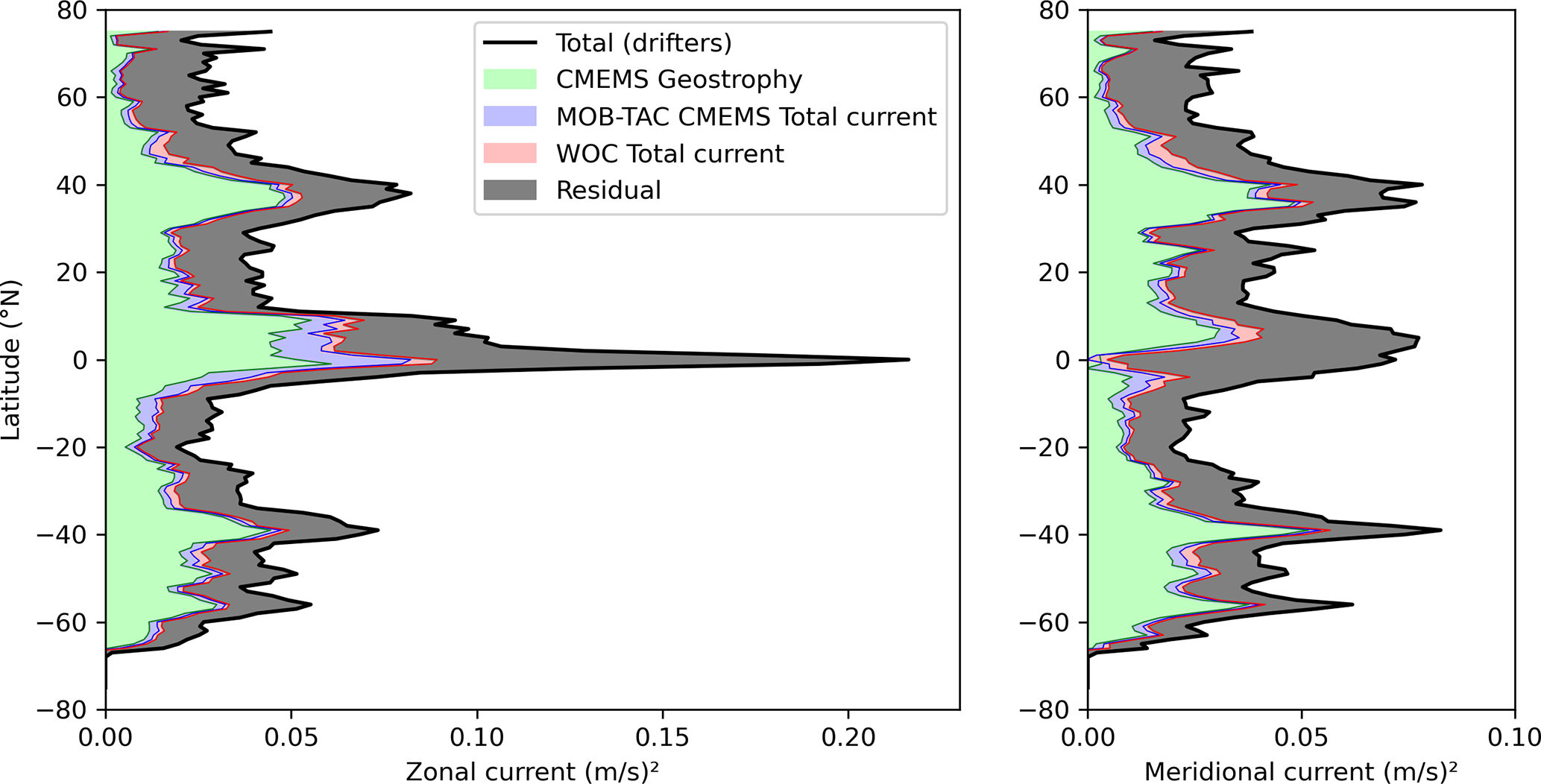 Figure 6Black lines: variance of the observed surface current (zonal component on the left, meridional on the right) as a function of latitude averaged globaly for the drifter database between 2017 and 2020. The green, blue and red lines represent the explained variance of the CMEMS geostrophy, the CMEMS MOB-TAC total current and the WOC total current. The explained variance is defined as the total variance (black) minus the variance reduction after applying the different current estimates. The filled colors indicate the relative amount of additional explained variance between successive products.