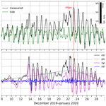 The moon was in its first quarter on 17 December, causing tide to shift from a diurnal neap tide to a semidiurnal spring tide during this period. All three floods coincided with daily tidal maxima, with tide contributing 15, 17, and 25 cm on 17, 18, and 24 December, respectively.