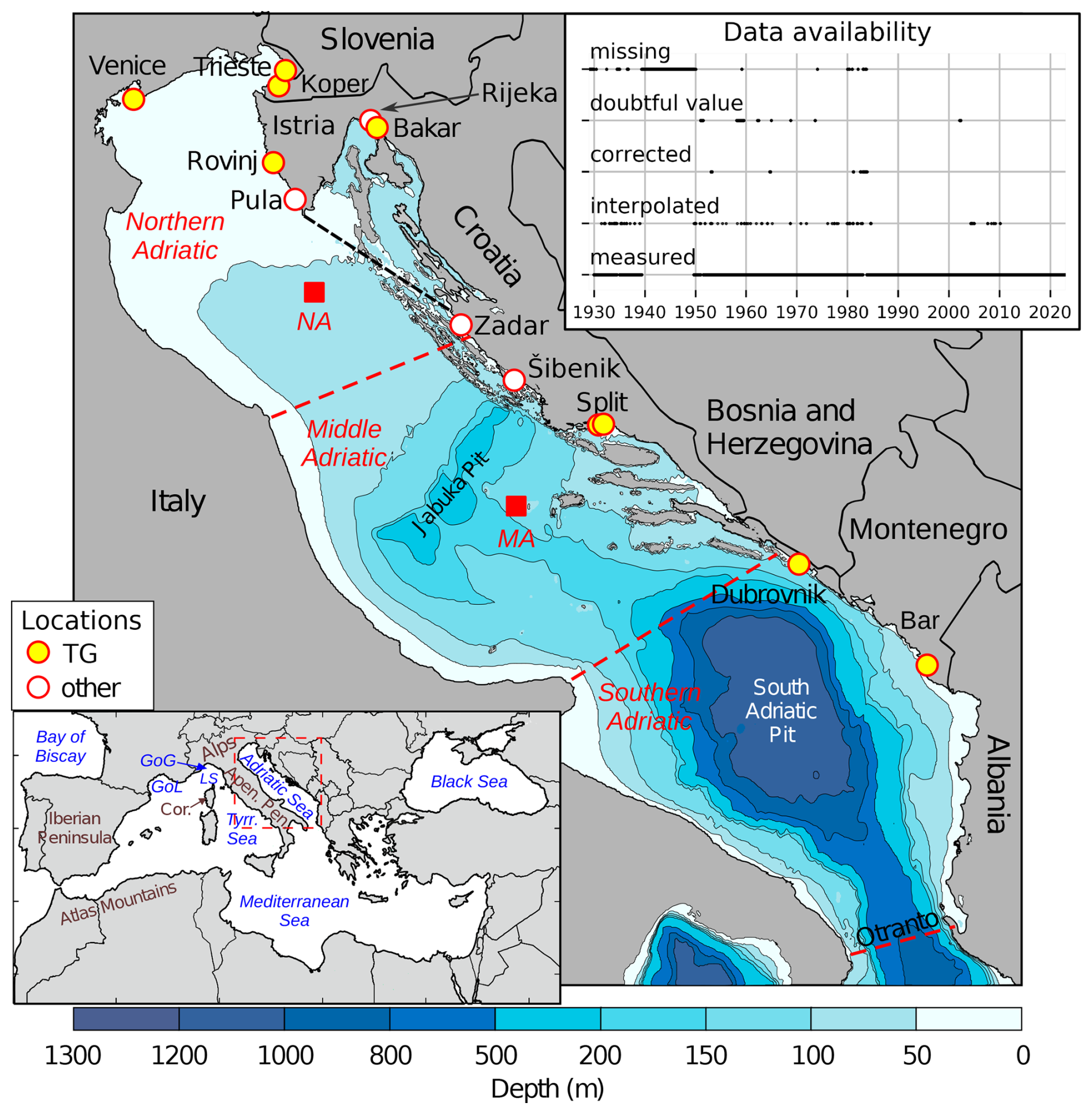 Figure 1Bathymetry of the Adriatic Sea. Locations of tide-gauge stations with records of at least 60 years (Pérez Gómez et al., 2022) are marked with red–yellow circles. Other major towns along the Croatian Adriatic coast are marked with red–white circles. The subdivision of the Adriatic into sub-basins is marked with dashed red lines, and the Kvarner Bay area is to the northeast of the dashed black line. The red rectangles mark grid points for which the atmospheric reanalysis series were analysed. The position of the Adriatic in relation to the Mediterranean is shown in the small inset in the lower-left corner, and the data availability of TG Bakar time series is shown in the upper-right corner. On the Mediterranean map, frequently referenced regions are labelled as follows: Gulf of Genoa (GoG), Gulf of Lion (GoL), Ligurian Sea (LS), Tyrrhenian Sea (Tyrr. Sea), Apennine Peninsula (Apen. Pen.), and Corsica (Cor.). Publisher's remark: please note that the above figure contains disputed territories.