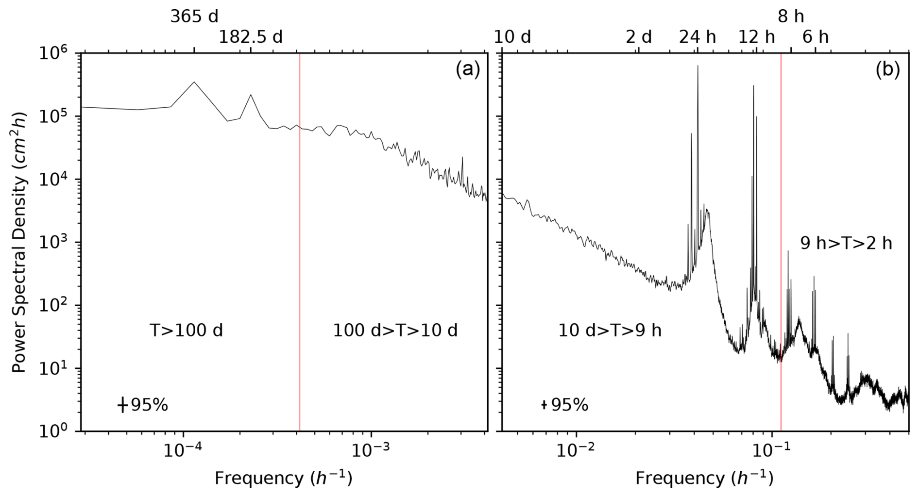 Figure 2Power spectral densities of the total SL measured at TG Bakar (1950–2022), shown for periods longer than 10 d (a) and shorter than 10 d (b). Spectra were computed using Hamming windows with a 50 % overlap: 4-year windows for the left panel and 1-year windows for the right panel. Vertical red lines indicate a period of 100 d (a) or 9 h (b). The 95 % confidence intervals are indicated. Vertical lines (red and sub-plot edges) mark boundaries between different SL processes.