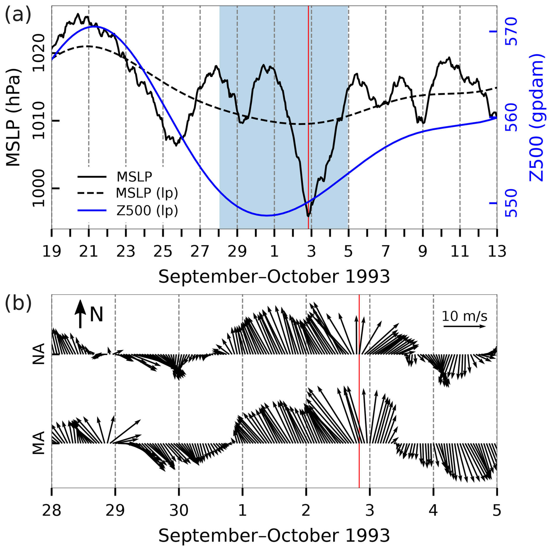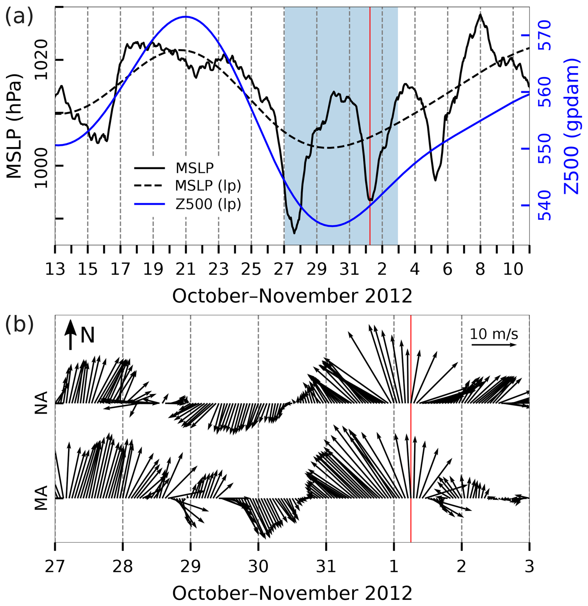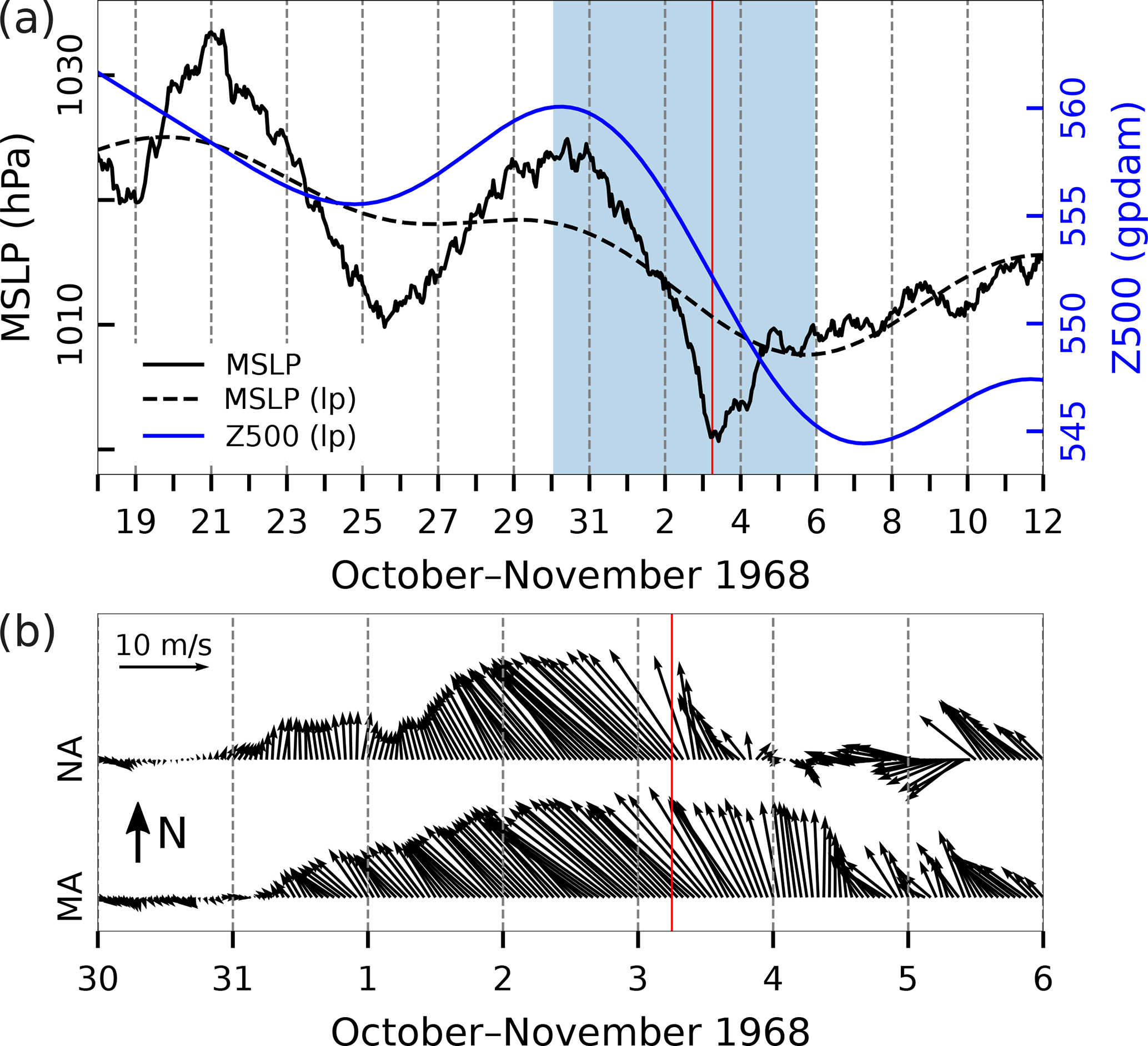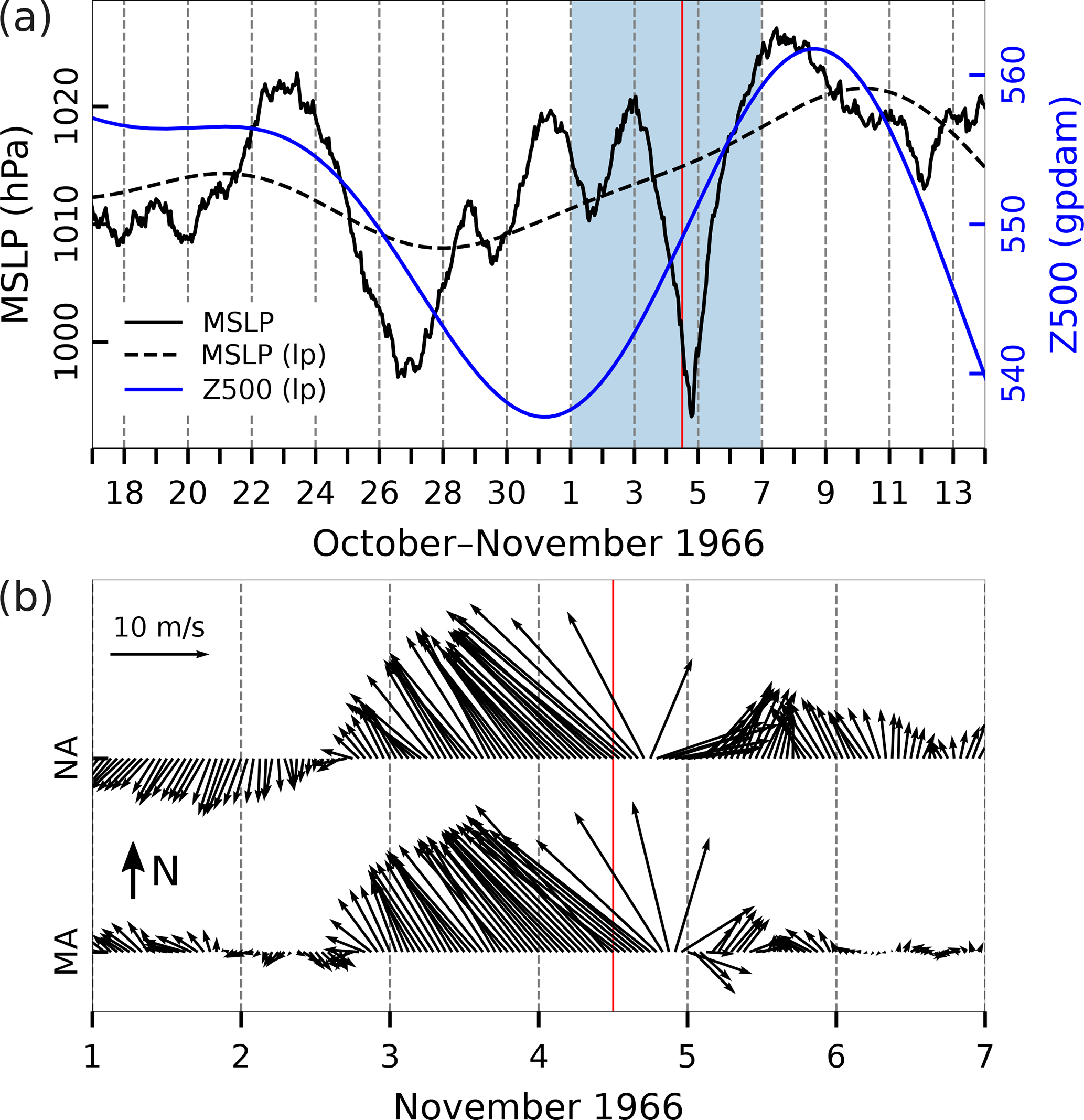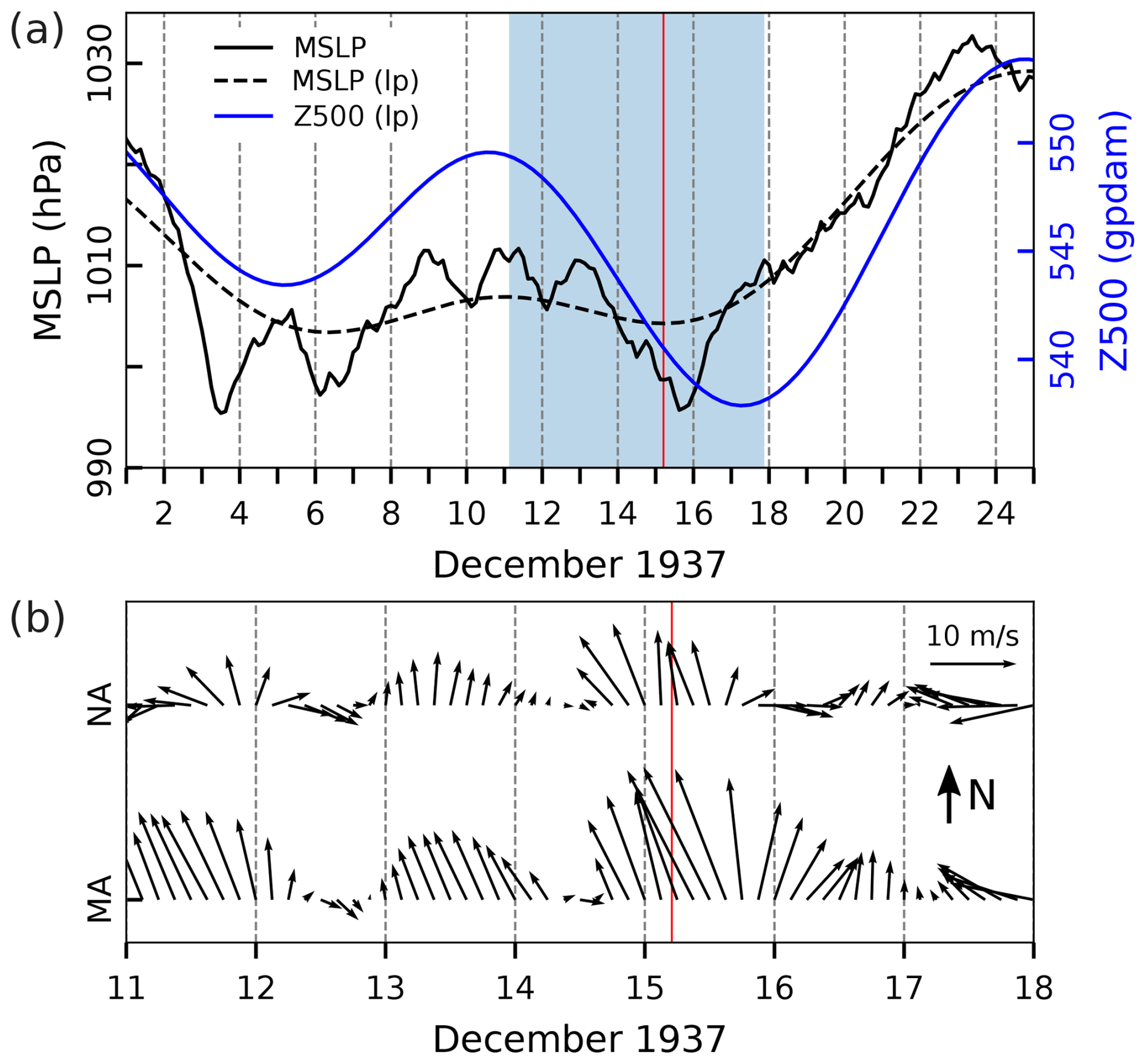 Figure 3Series of NOAA–CIRES–DOE reanalysis data related to the flood of 15 December 1937. (a) MSLP (every 3 h) and MSLP  (lp) (low-pass filtered with a cut-off frequency of 10 d) and Z500  (lp) (low-pass filtered with a cut-off frequency of 10 d) at a grid point near TG Bakar. (b) W10 (every 3 h) during the period marked in blue in the upper plot for the middle Adriatic (MA) and northern Adriatic (NA) (all locations marked in Fig. 1). The red line indicates the onset of the SL maximum.