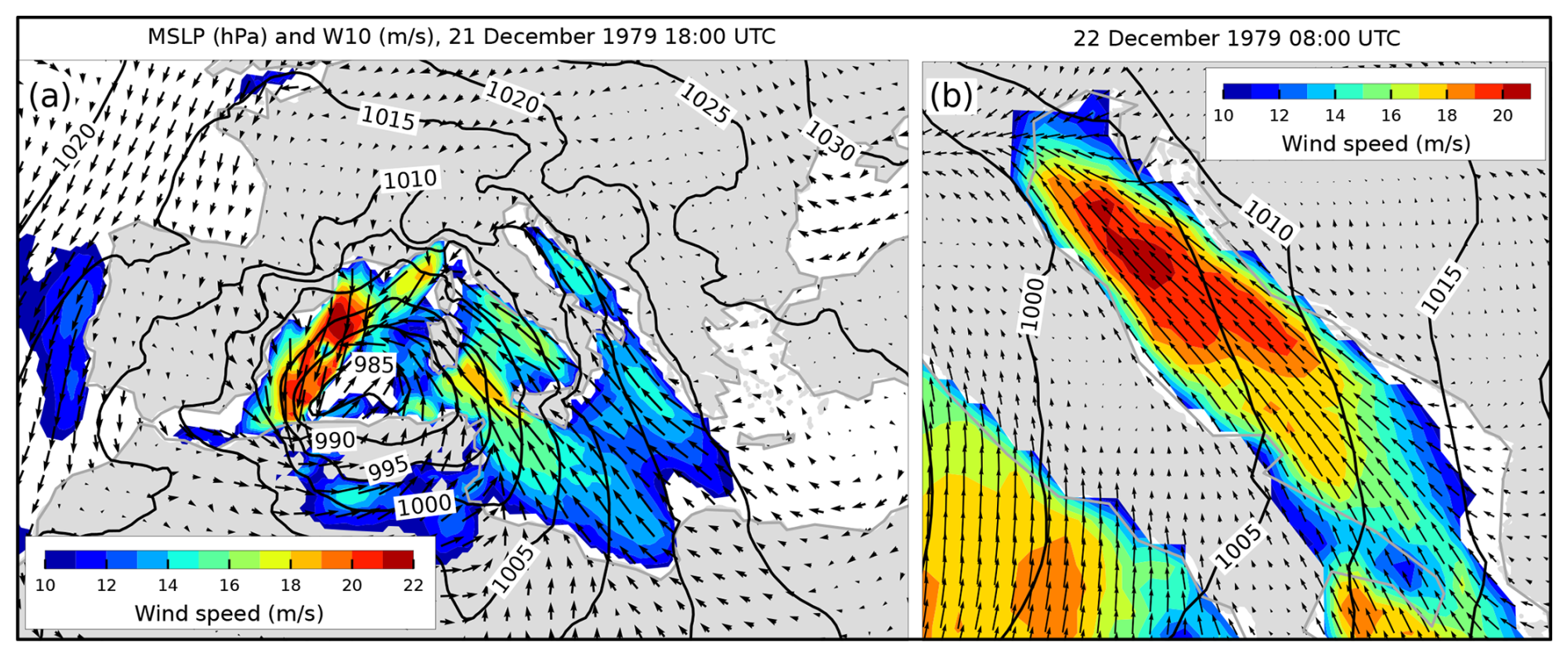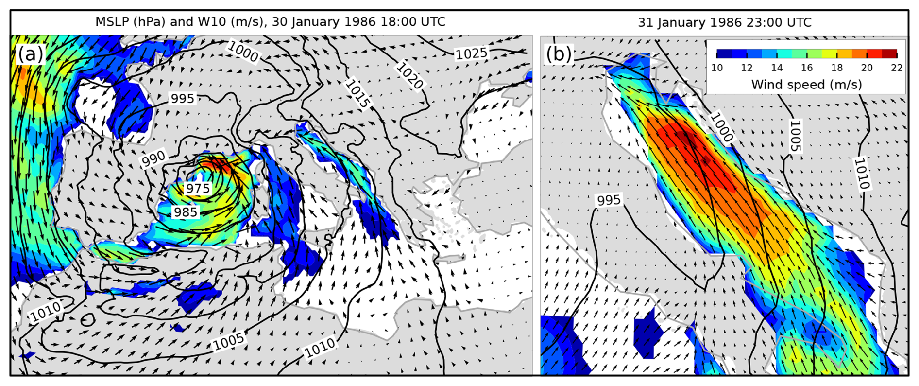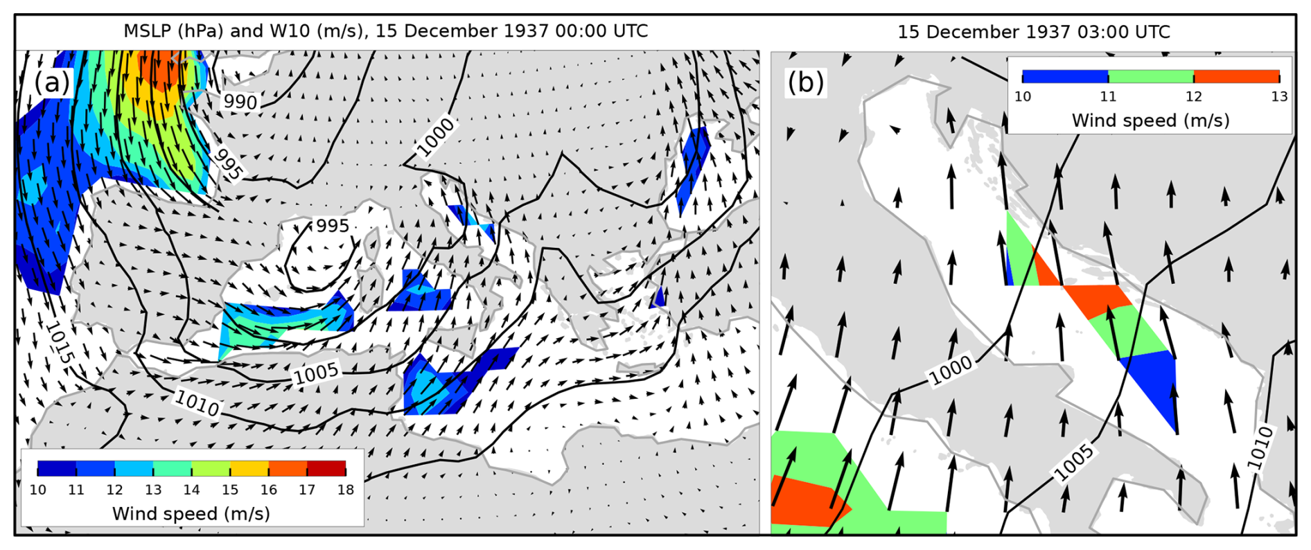 The Obzor (16 December 1937) and Primorske novine (17 December 1937) newspapers reveal that the effects of the episode were particularly strong in the middle and the southern Adriatic. These effects include (i) winds peaking at 30 m s−1 (Split; Fig. 1), (ii) waves up to 10 m high that flooded coastal areas, (iii) submergence of coastal roads, (iv) disruptions to maritime traffic, and (v) significant damage to windows and roofs.