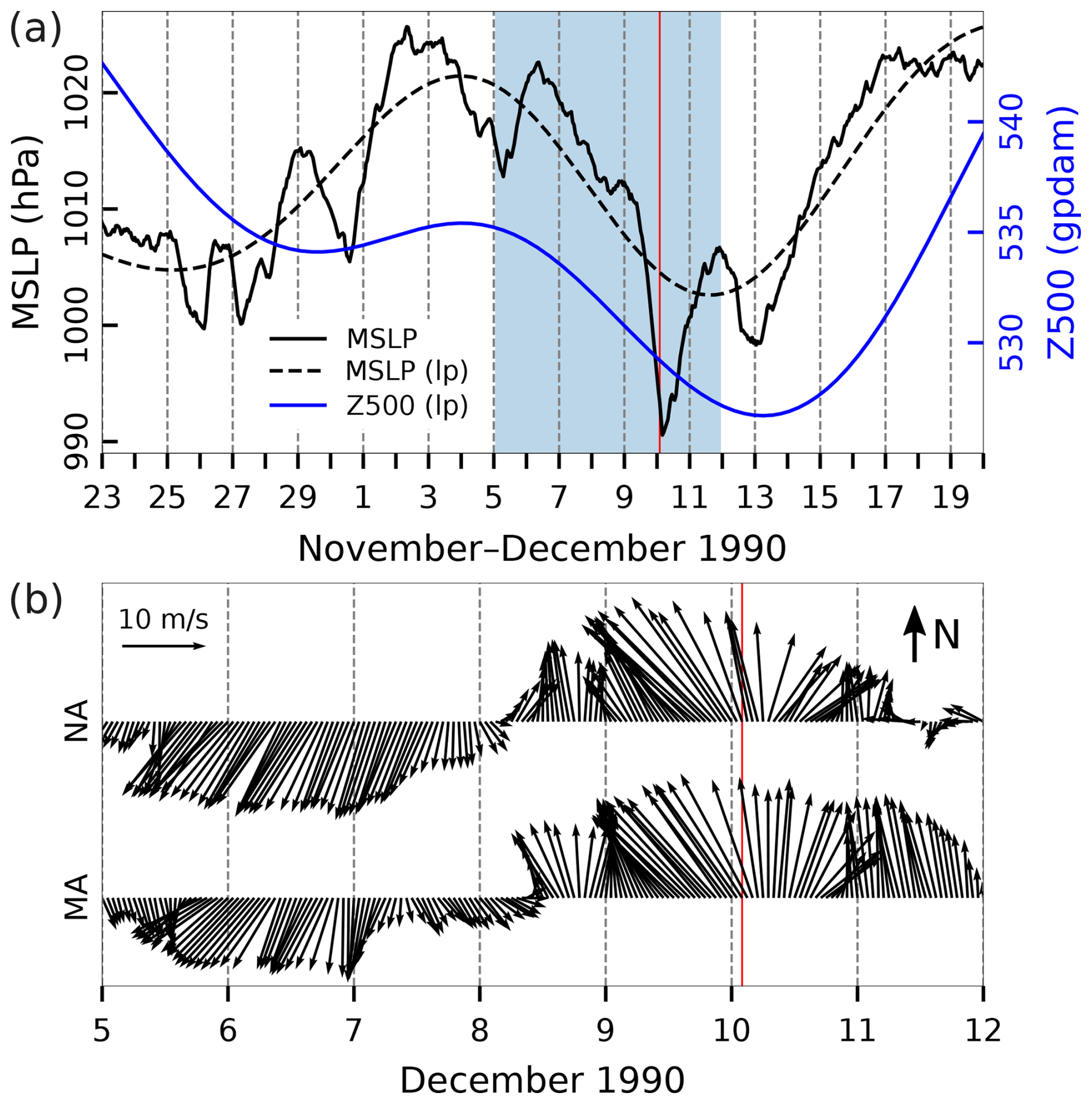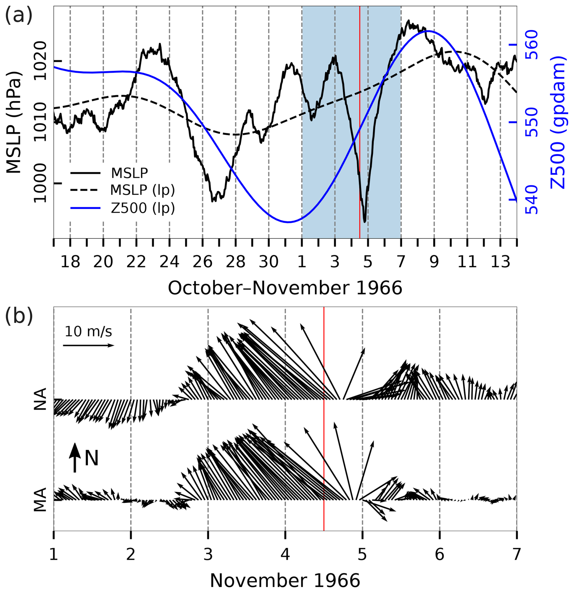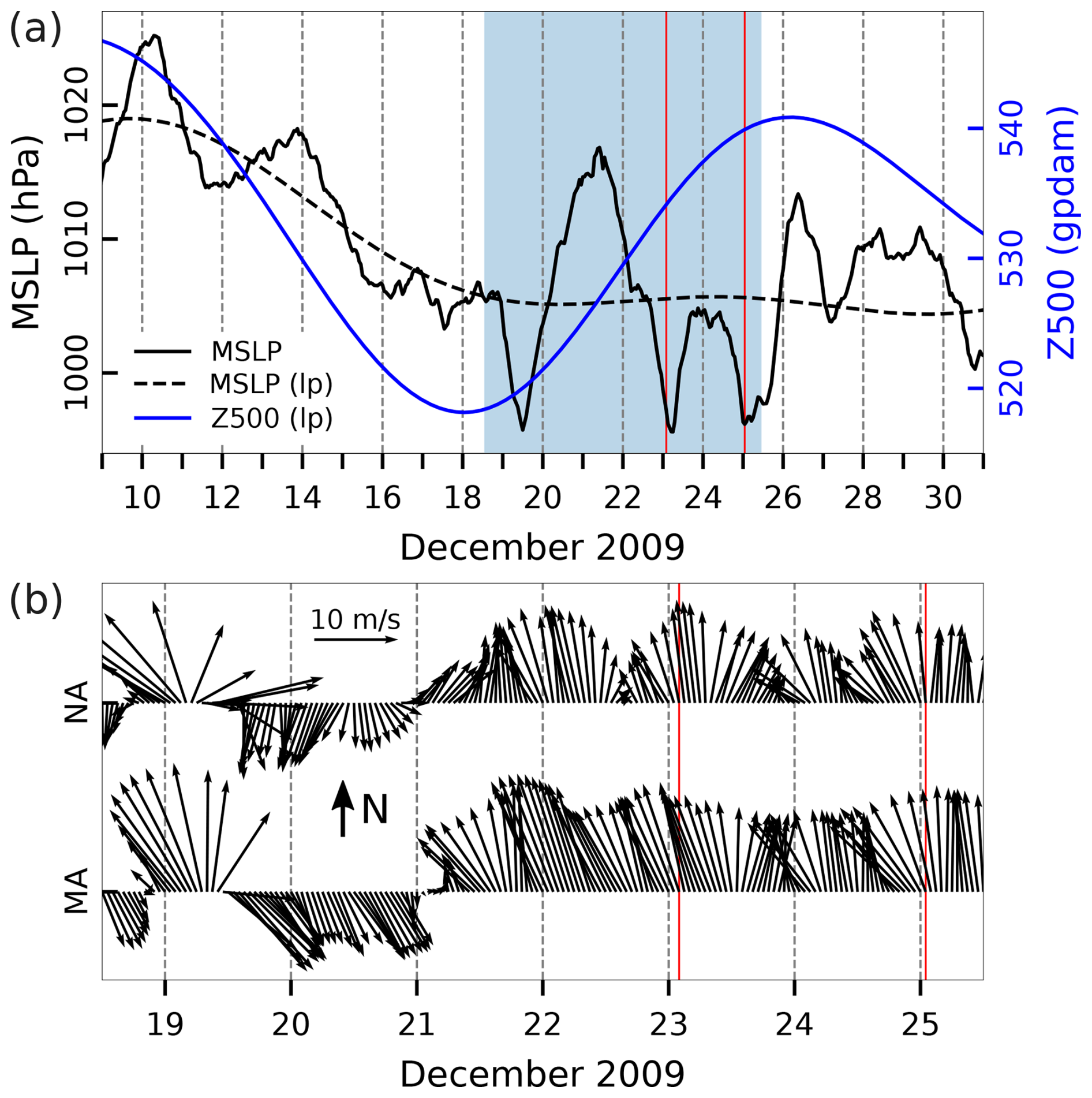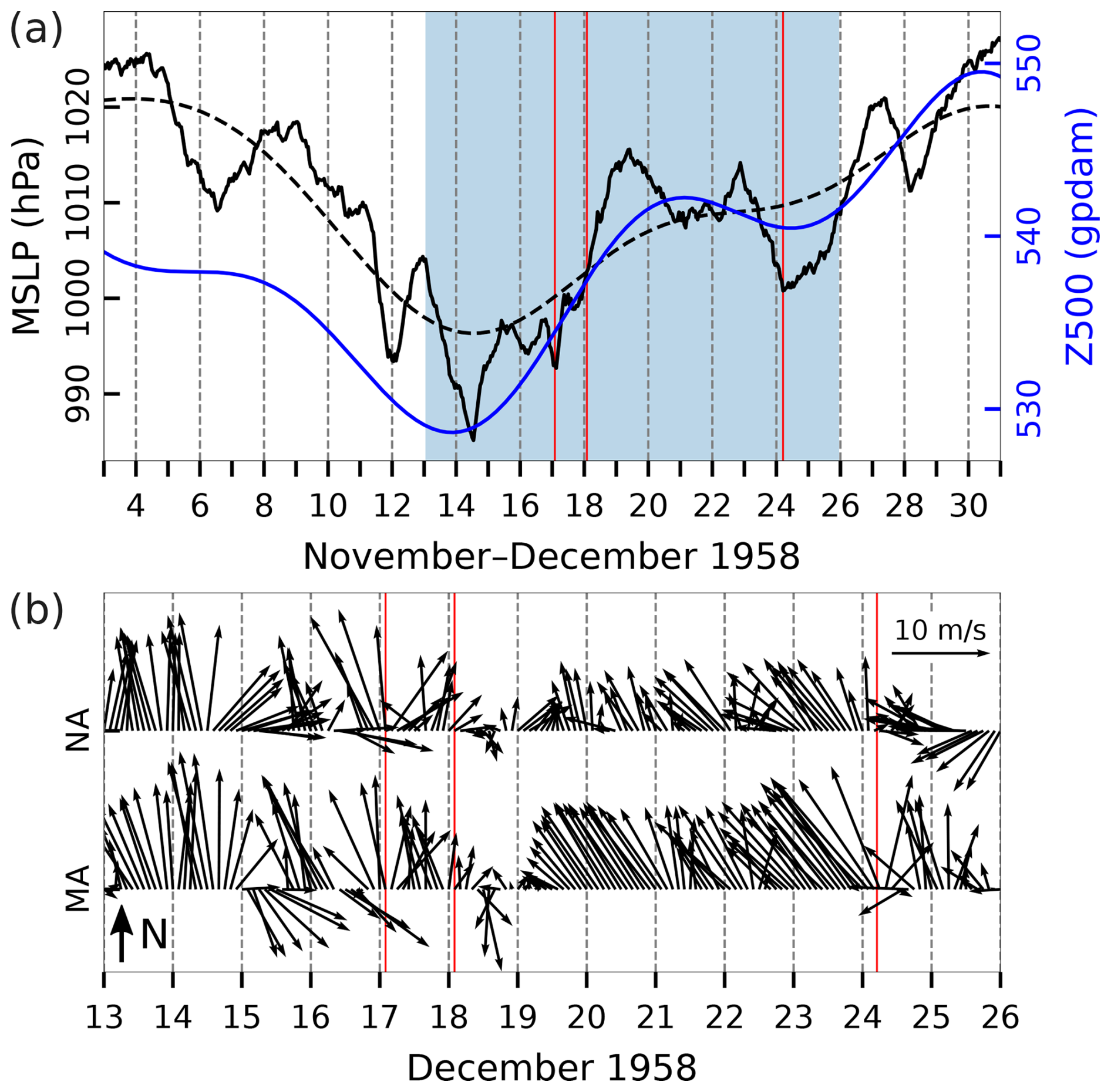 Figure 6Series of ERA5 reanalysis data related to the floods of 17, 18, and 24 December 1958. (a) MSLP (hourly) and MSLP  (lp) (low-pass filtered with a cut-off frequency of 10 d) and Z500  (lp) (low-pass filtered with a cut-off frequency of 10 d) at a grid point near TG Bakar. (b) Hourly W10 during the period marked in blue in the upper plot for the middle Adriatic (MA) and northern Adriatic (NA) (all locations marked in Fig. 1). Every second value is plotted. The red lines indicate onset of the SL maxima.