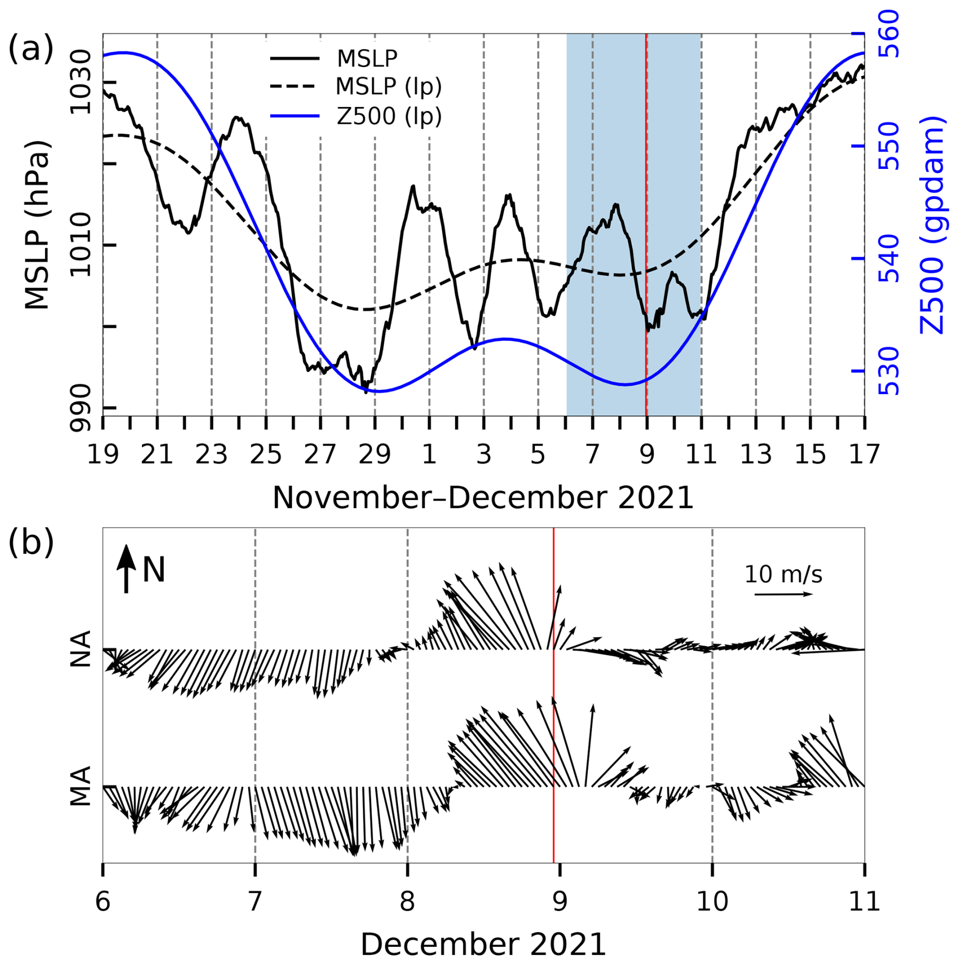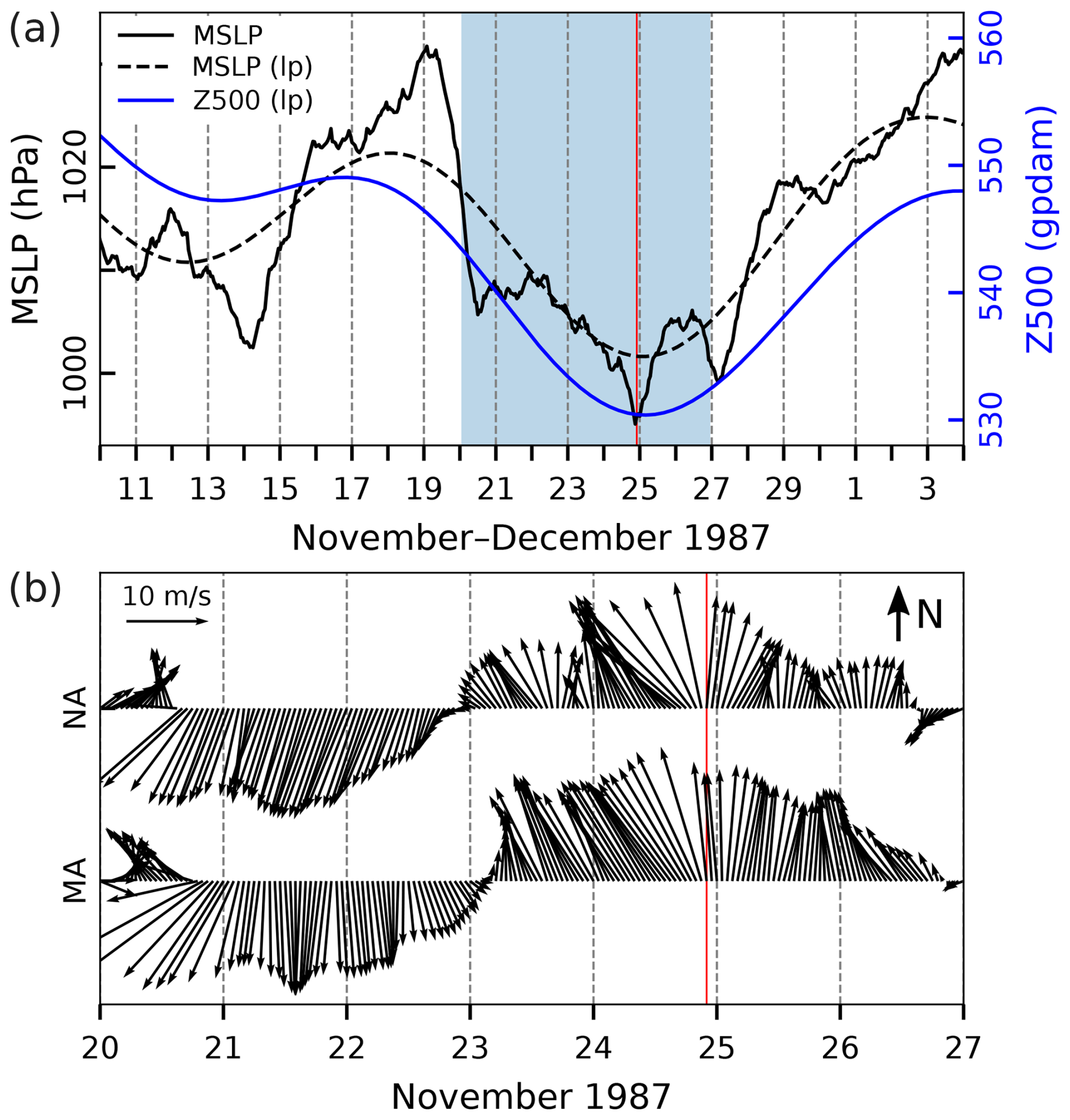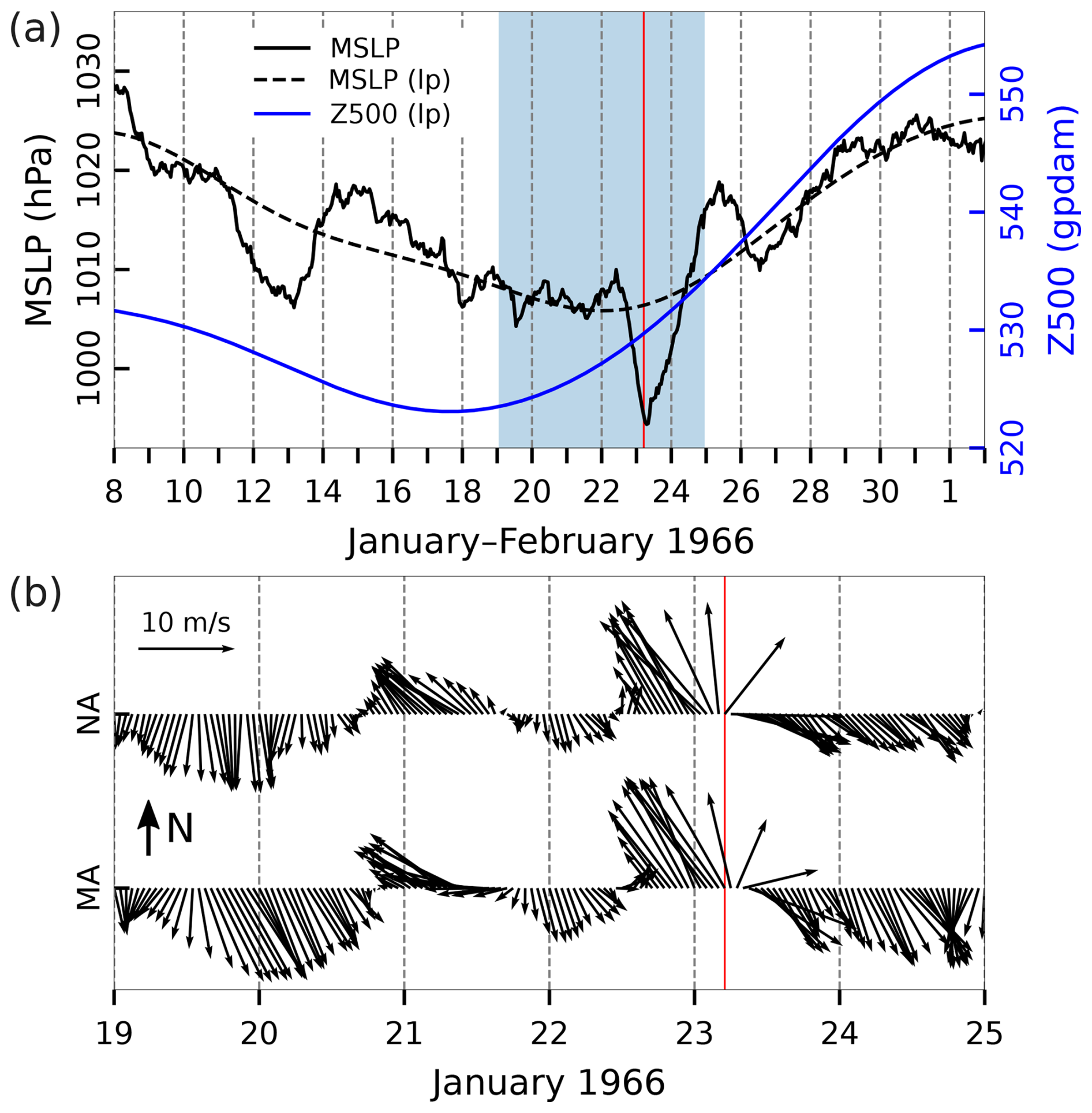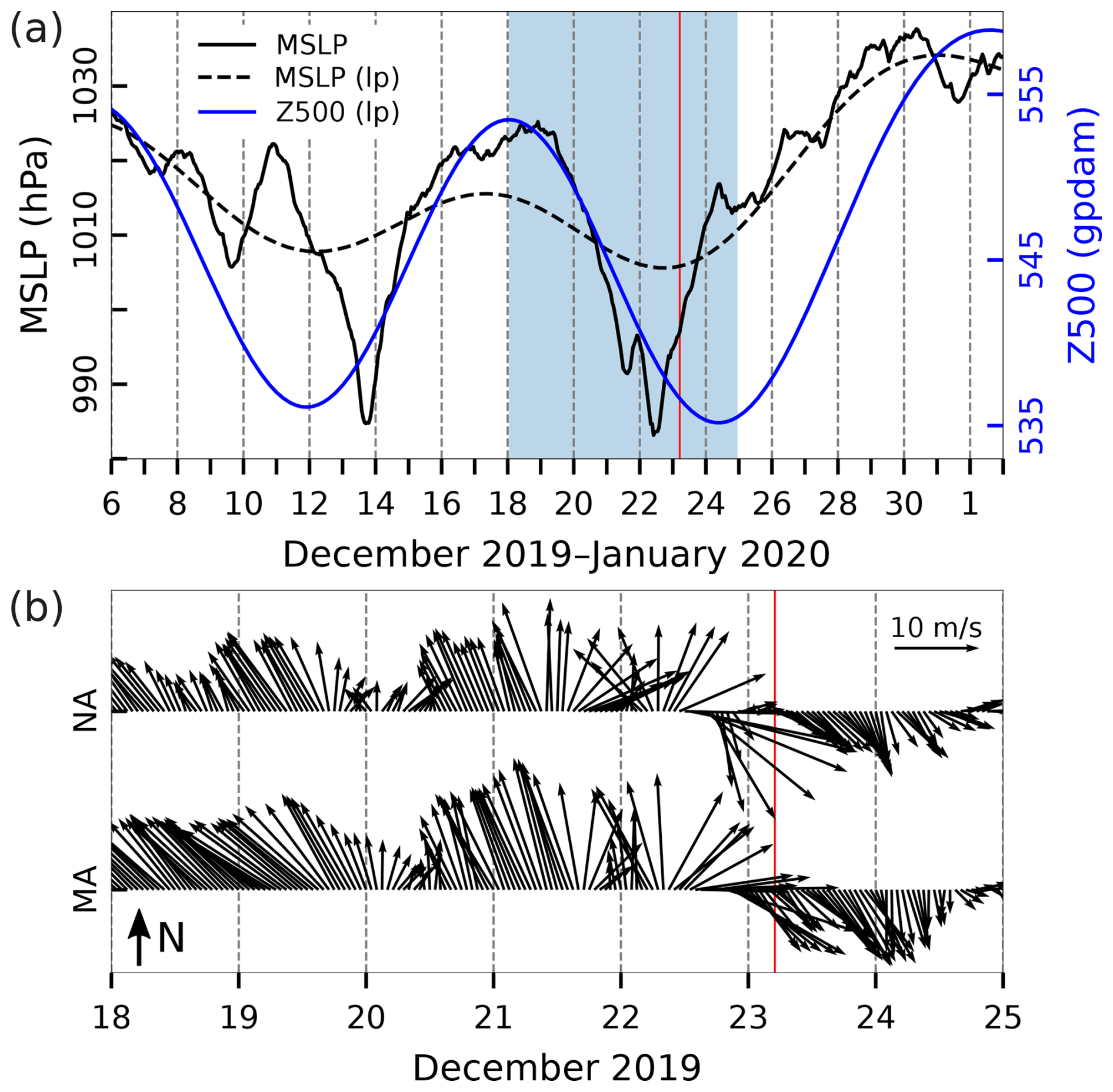 Figure 6Series of ERA5 reanalysis data related to the floods of 17, 18, and 24 December 1958. (a) MSLP (hourly) and MSLP  (lp) (low-pass filtered with a cut-off frequency of 10 d) and Z500  (lp) (low-pass filtered with a cut-off frequency of 10 d) at a grid point near TG Bakar. (b) Hourly W10 during the period marked in blue in the upper plot for the middle Adriatic (MA) and northern Adriatic (NA) (all locations marked in Fig. 1). Every second value is plotted. The red lines indicate onset of the SL maxima.