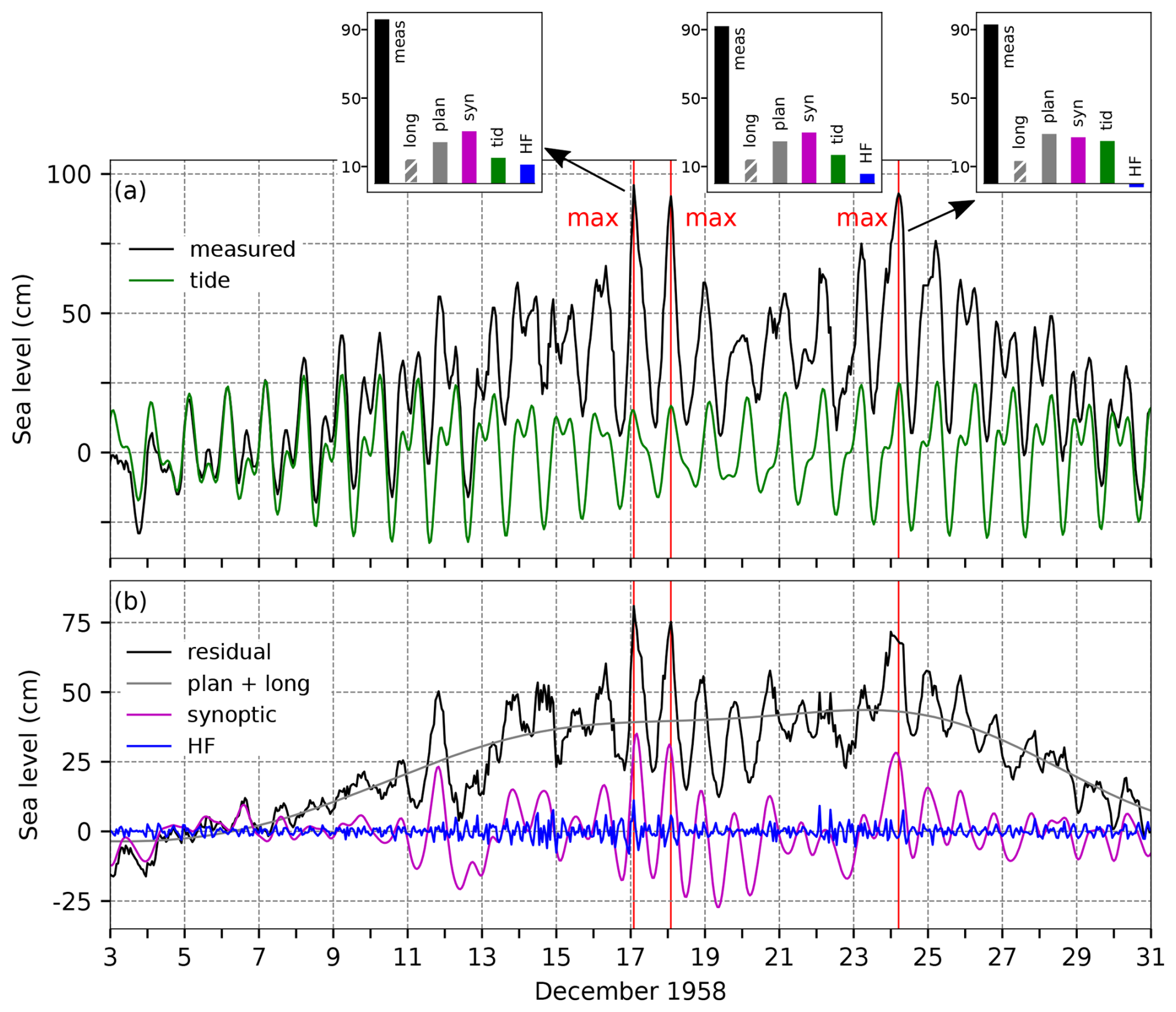 Figure 8SL series for the floods of 17, 18, and 24 December 1958. Panel (a) shows the measured sea level (black) and tide (green). The inset figures show the contributions (cm) of the five sea-level components to the maximum measured sea levels (“meas” – left: 17 December 1958 at 02:00 UTC; middle: 18 December 1958 at 02:00 UTC; right: 24 December 1958 at 05:00 UTC): “HF” refers to high-frequency oscillations (2 h<T< 9 h), “syn” to synoptic component (9 h<T< 10 d), “tid” to tide, “plan” to planetary-scale variability (10 d<T< 100 d), and “long” to long-term sea-level variability (100 d<T). Panel (b) presents the residual sea level (black), the combined series of planetary-scale variability and long-term sea-level variability (grey; plan + long), synoptic component (purple), and high-frequency oscillations (blue). The red lines indicate the times of the maximum total SL.