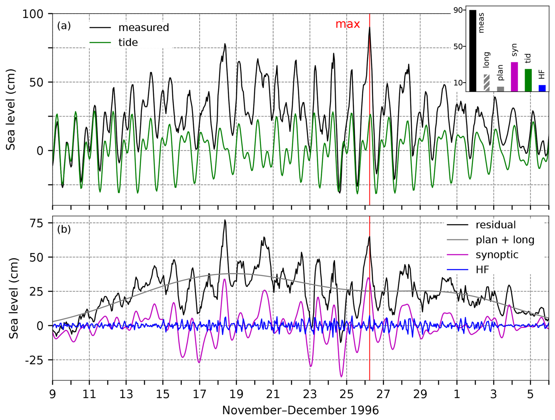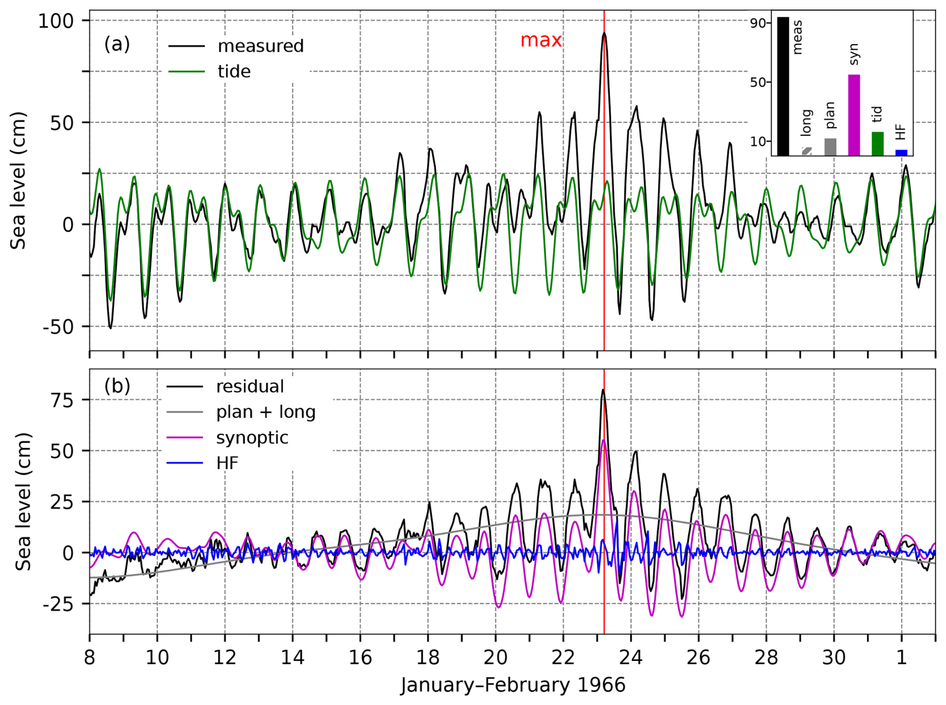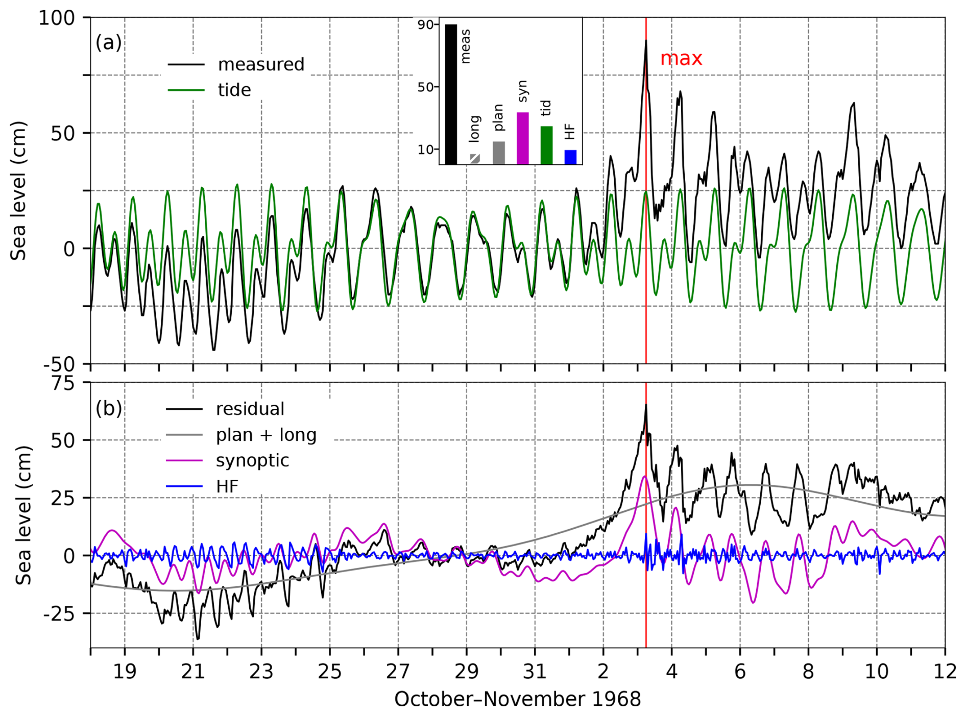 Figure 5SL series for the flood of 15 December 1937. Panel (a) shows the measured sea level (black) and tide (green). The inset figure shows the contributions (cm) of the five sea-level components to the maximum measured sea level (“meas”; 05:00 UTC): “HF” refers to high-frequency oscillations (2 h<T< 9 h), “syn” to synoptic component (9 h<T< 10 d), “tid” to tide, “plan” to planetary-scale variability (10 d<T< 100 d), and “long” to long-term sea-level variability (100 d<T). Panel (b) presents the residual sea level (black), the combined series of planetary-scale variability and long-term sea-level variability (grey; plan + long), synoptic component (purple), and high-frequency oscillations (blue). The red line indicates the time of occurrence of the total SL maximum.
