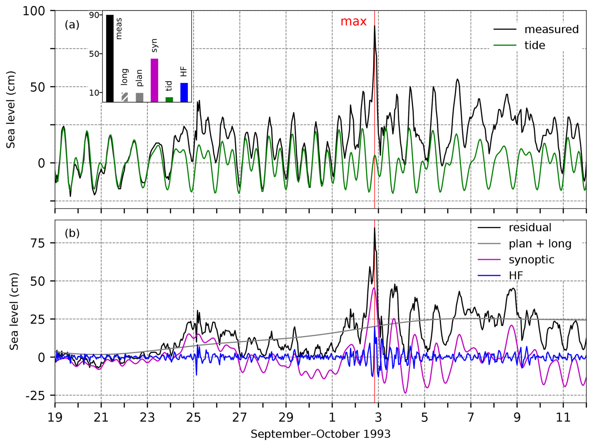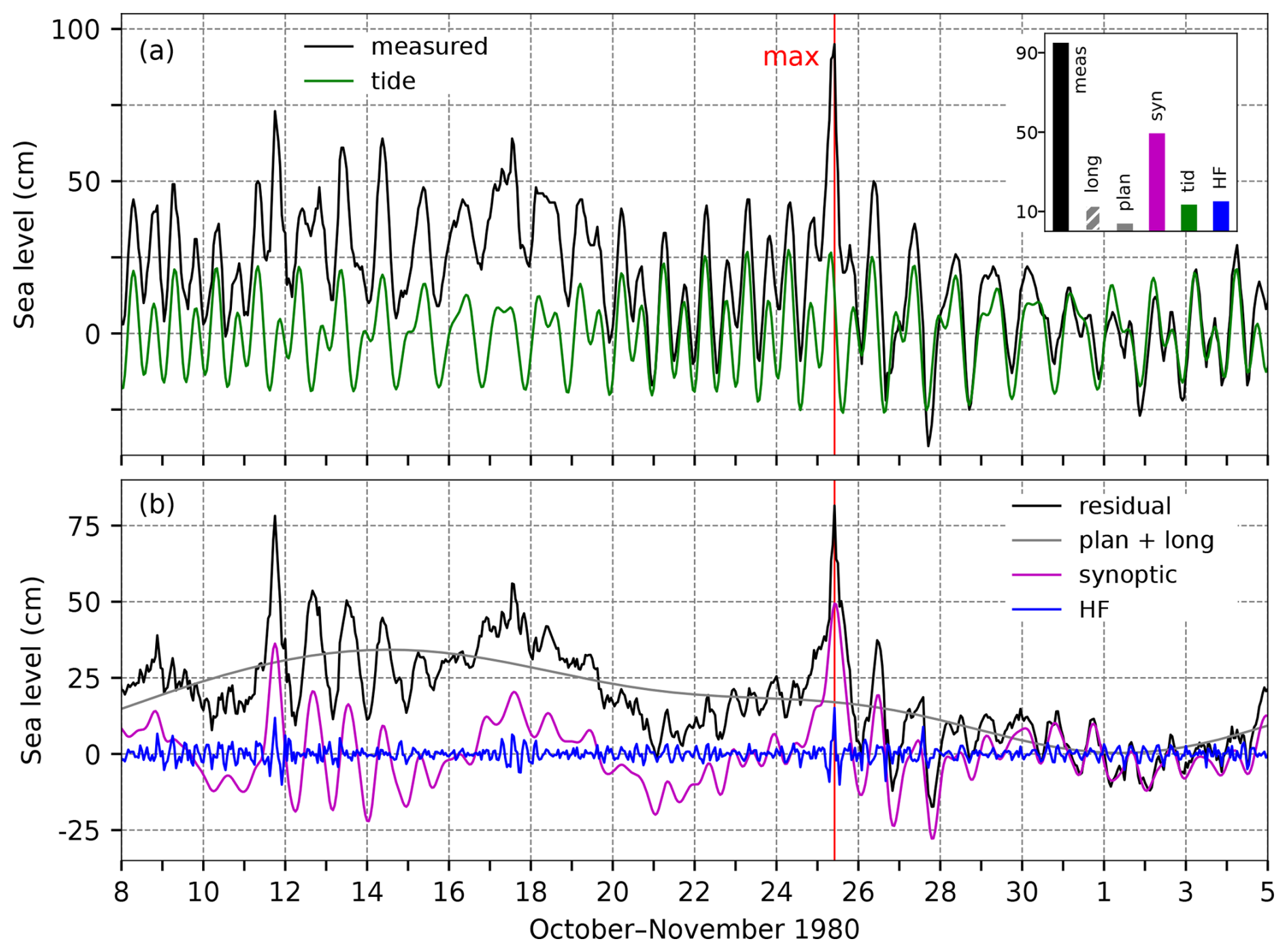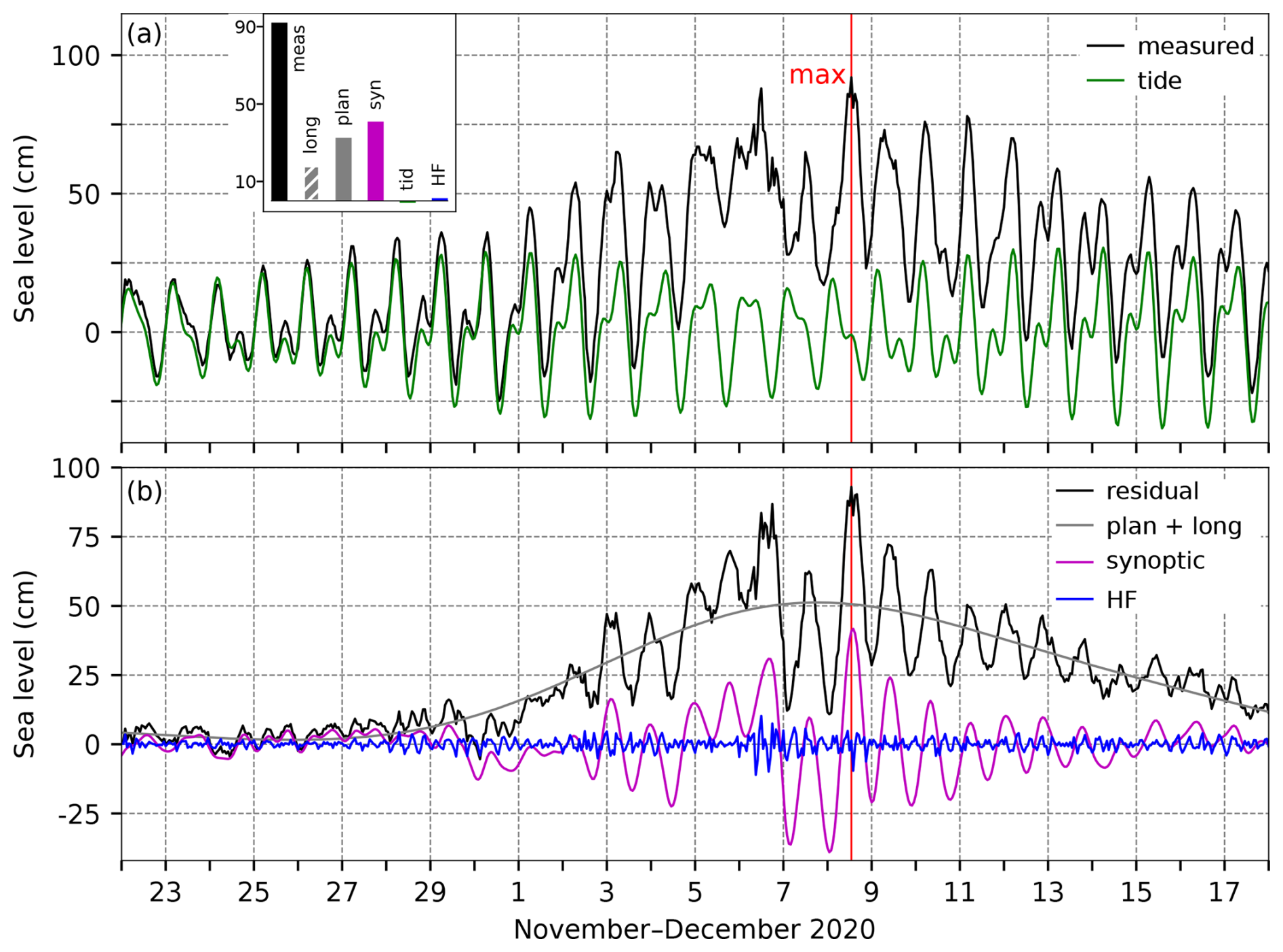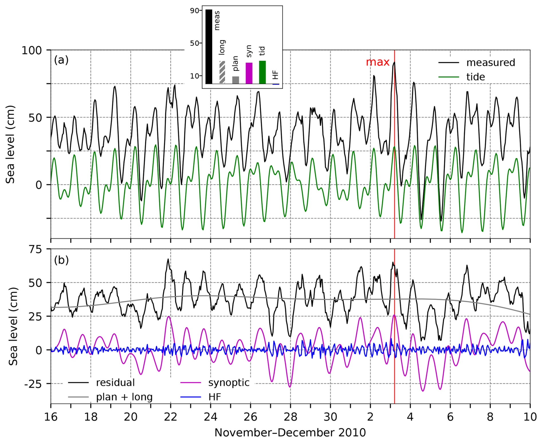 Figure 5SL series for the flood of 15 December 1937. Panel (a) shows the measured sea level (black) and tide (green). The inset figure shows the contributions (cm) of the five sea-level components to the maximum measured sea level (“meas”; 05:00 UTC): “HF” refers to high-frequency oscillations (2 h<T< 9 h), “syn” to synoptic component (9 h<T< 10 d), “tid” to tide, “plan” to planetary-scale variability (10 d<T< 100 d), and “long” to long-term sea-level variability (100 d<T). Panel (b) presents the residual sea level (black), the combined series of planetary-scale variability and long-term sea-level variability (grey; plan + long), synoptic component (purple), and high-frequency oscillations (blue). The red line indicates the time of occurrence of the total SL maximum.