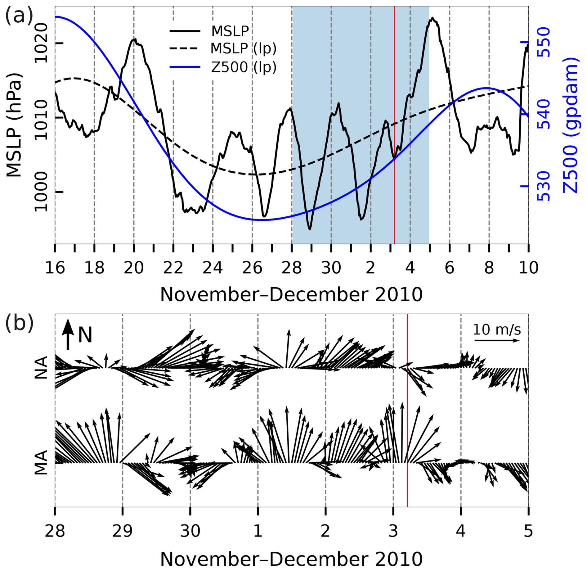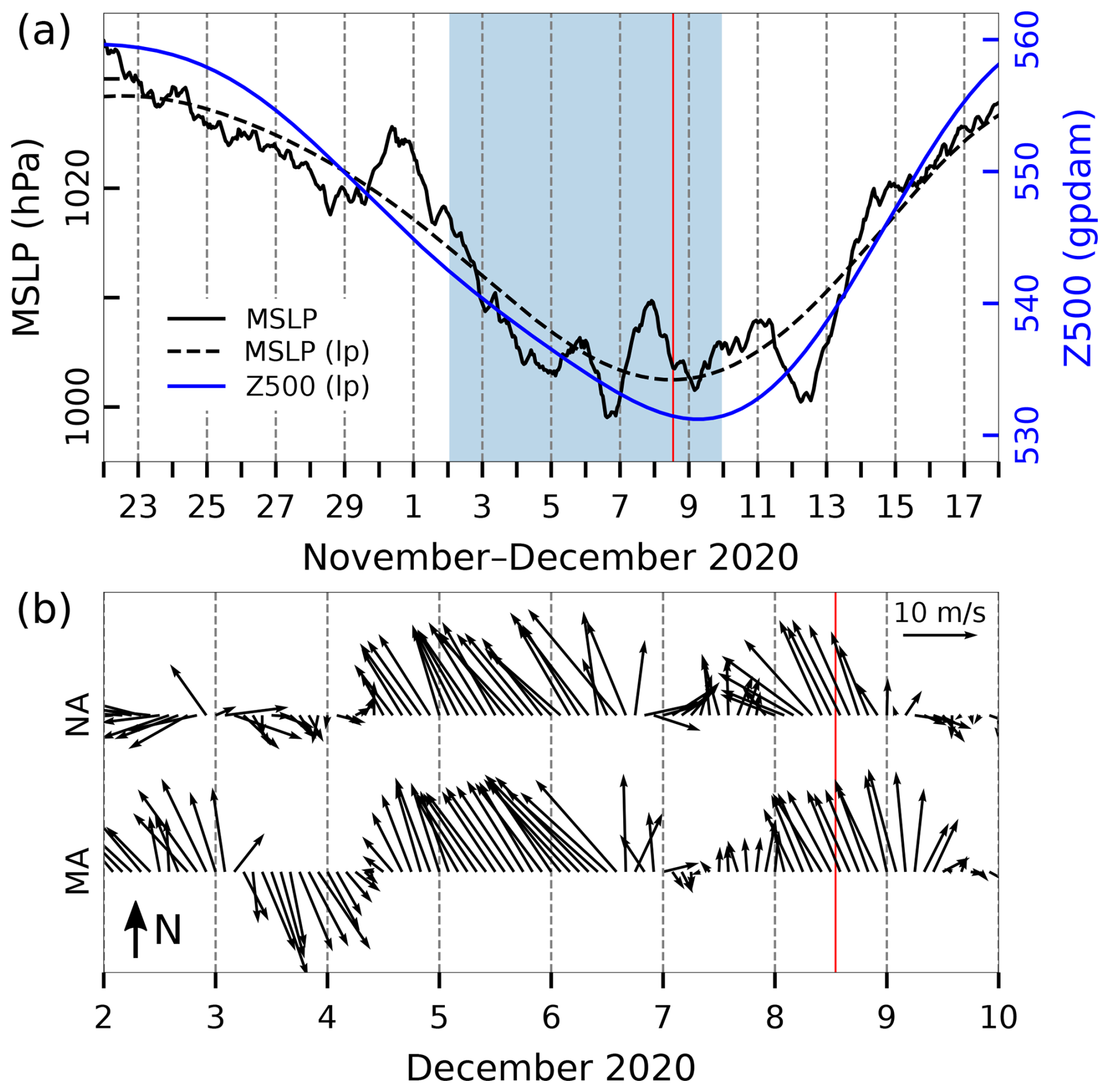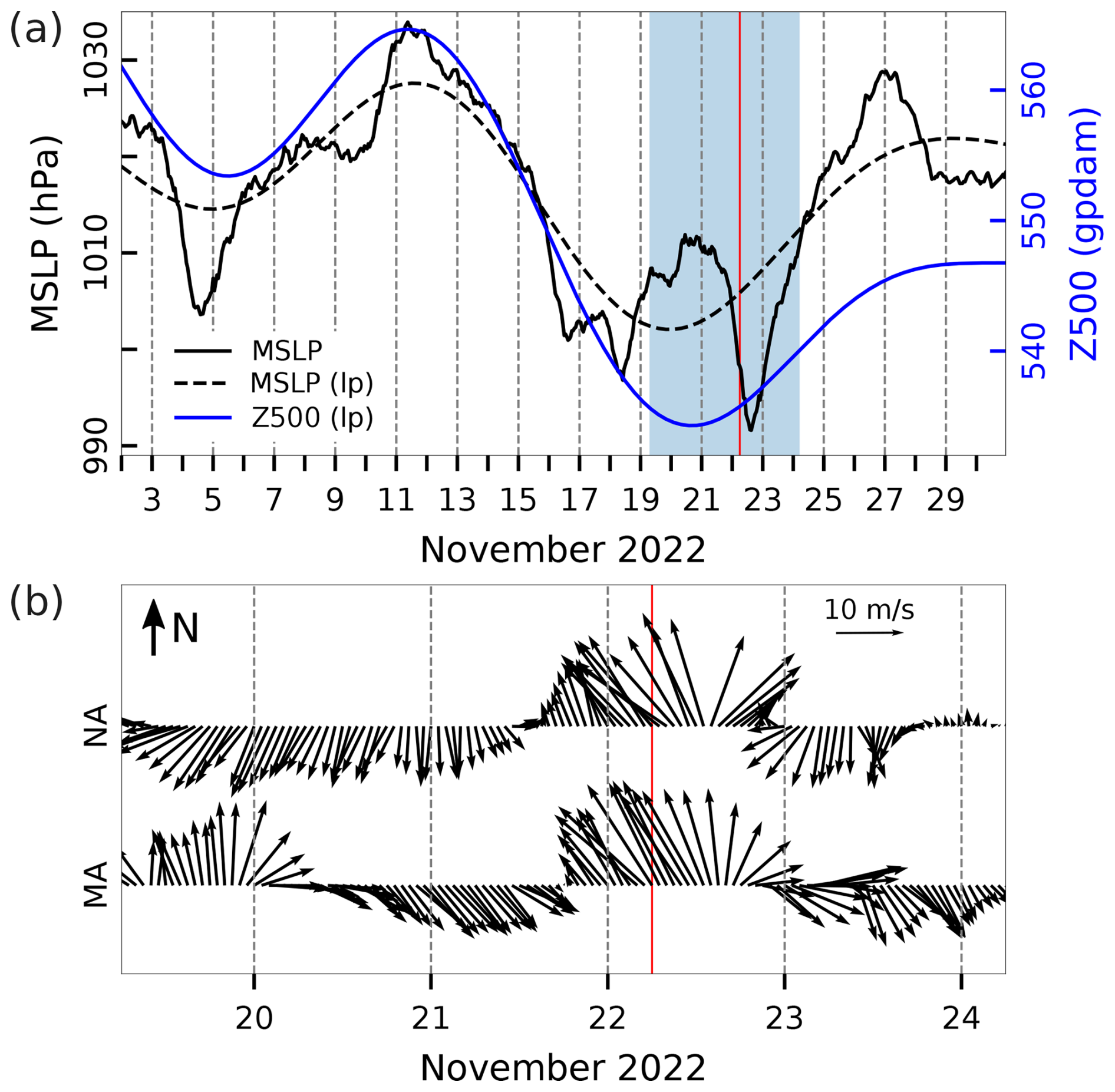 To analyse atmospheric forcing on a planetary scale and the corresponding SL response (planetary-scale component), we compared low-pass series of MSLP, Z500, and W10 (filtered with a 10 d cut-off frequency) with joint planetary-scale and long-term sea-level components. While planetary atmospheric forcing acts over periods of 10 d<T< 100 d and, thus, presumably affects only planetary-scale component (10 d<T< 100 d), we use the low-pass-filtered series (and not the band-pass ones) because, at periods longer than 100 d, both atmospheric and SL series show minimal variations over the time frames presented in the figures (approximately 1 month), i.e. series at periods longer than 100 d effectively act as mean values. We focus on MSLP, Z500, and W10 because, during the colder part of the year (over periods of 10 d<T< 100 d), the atmosphere exhibits quasi-barotropic behaviour. This allows disturbances in the middle troposphere (500 hPa) to be reflected at the surface (MSLP and accompanying W10), making Z500 a reliable indicator of planetary-scale surface meteorological conditions. In this paper, both in the text and figures, these low-pass series are labelled as MSLP  (lp), Z500  (lp), and (for sea level) plan + long.